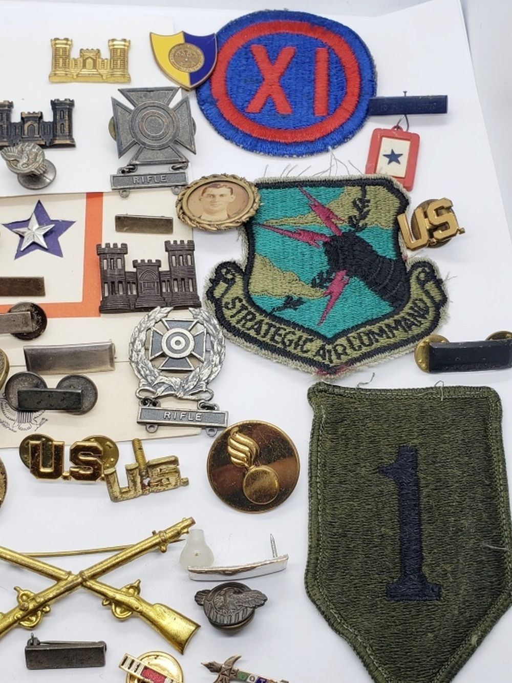 Sterling silver shooter badge & some LT Rank. Large Cross Rifles, a few buttons, disc insignia, patches,
