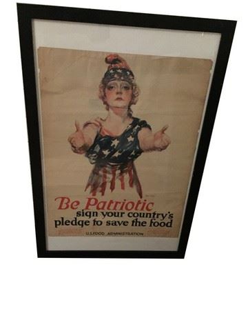 WWI framed poster. "Be Patriotic sign your country's pledge to save the food. This poster is from the Federal Food Pledge Card Campaign from the US Food Administration. Paul Stahr's name is printed below the patriotically dressed woman. Step back in time to the era of World War I with this framed poster featuring the iconic message, "Be Patriotic: Sign Your Country's Pledge to Save the Food." This historic artwork originated from the Federal Food Pledge Card Campaign led by the US Food Administration. The poster showcases a patriotically dressed woman, and it bears the name of renowned artist Paul Stahr below the illustration. Own a piece of history with this captivating framed poster that encapsulates the importance of food conservation during the war effort..