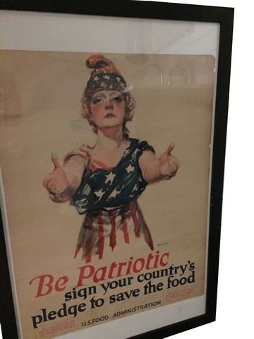 WWI framed poster. "Be Patriotic sign your country's pledge to save the food. This poster is from the Federal Food Pledge Card Campaign from the US Food Administration. Paul Stahr's name is printed below the patriotically dressed woman. Step back in time to the era of World War I with this framed poster featuring the iconic message, "Be Patriotic: Sign Your Country's Pledge to Save the Food." This historic artwork originated from the Federal Food Pledge Card Campaign led by the US Food Administration. The poster showcases a patriotically dressed woman, and it bears the name of renowned artist Paul Stahr below the illustration. Own a piece of history with this captivating framed poster that encapsulates the importance of food conservation during the war effort..