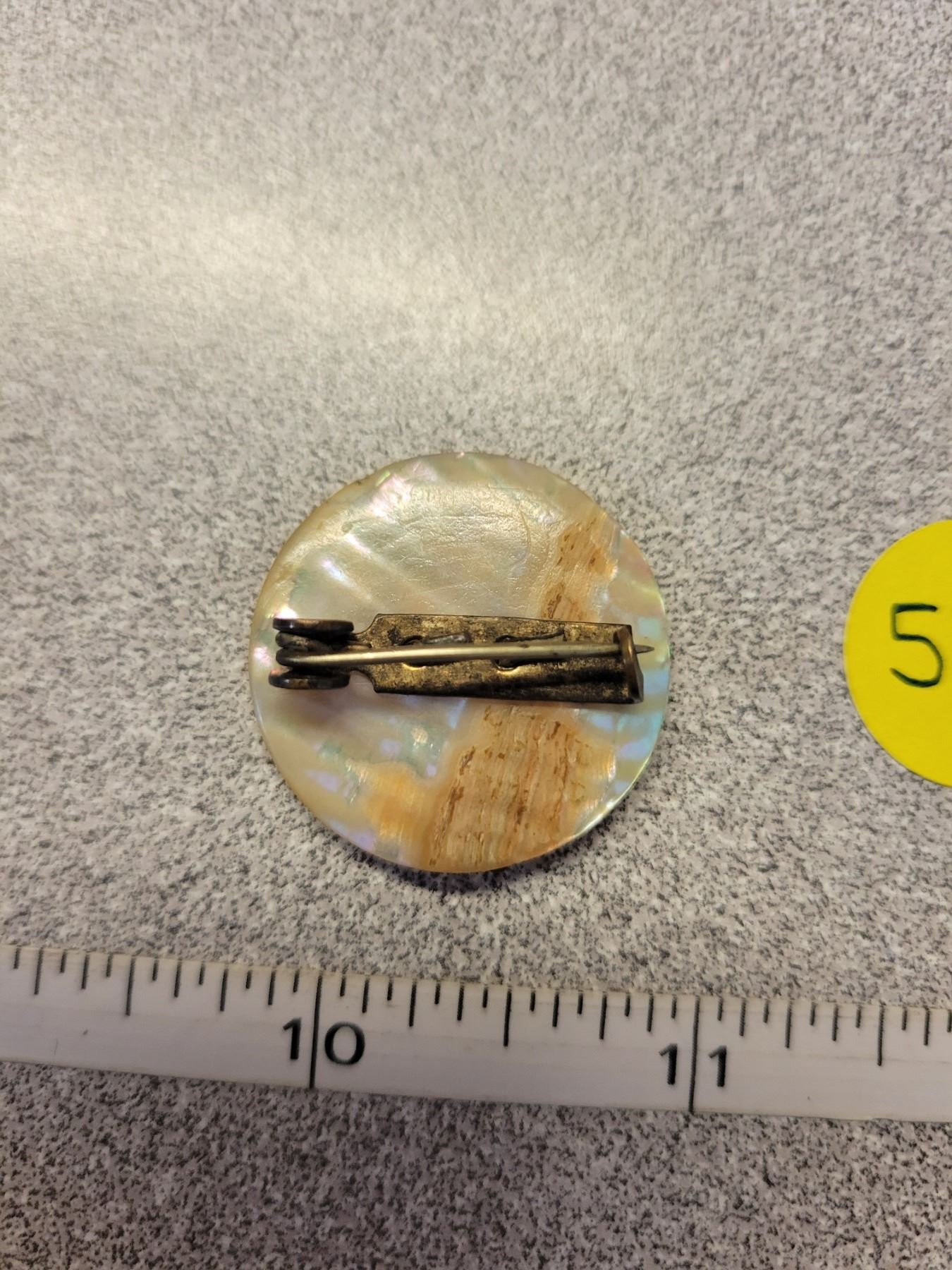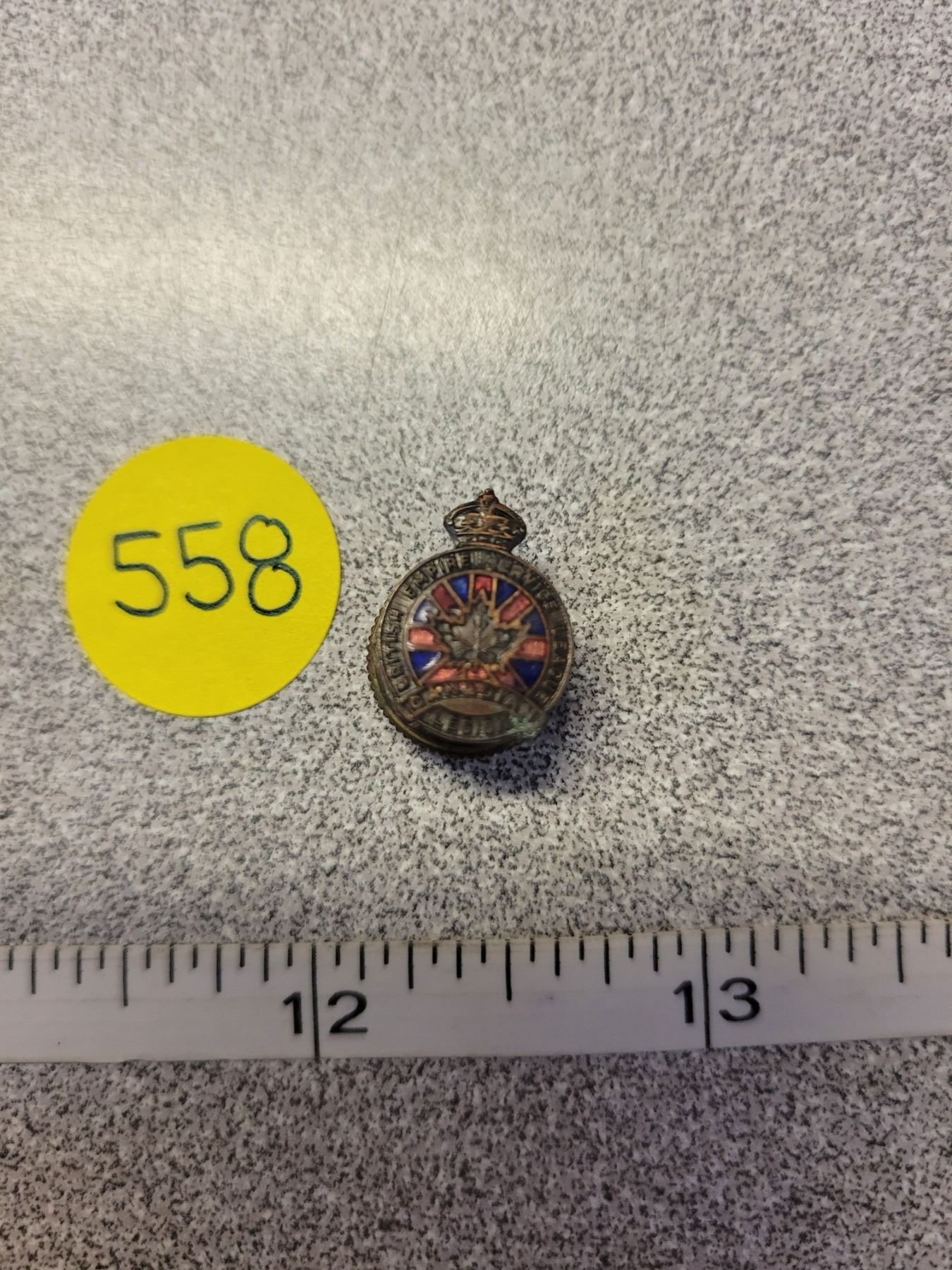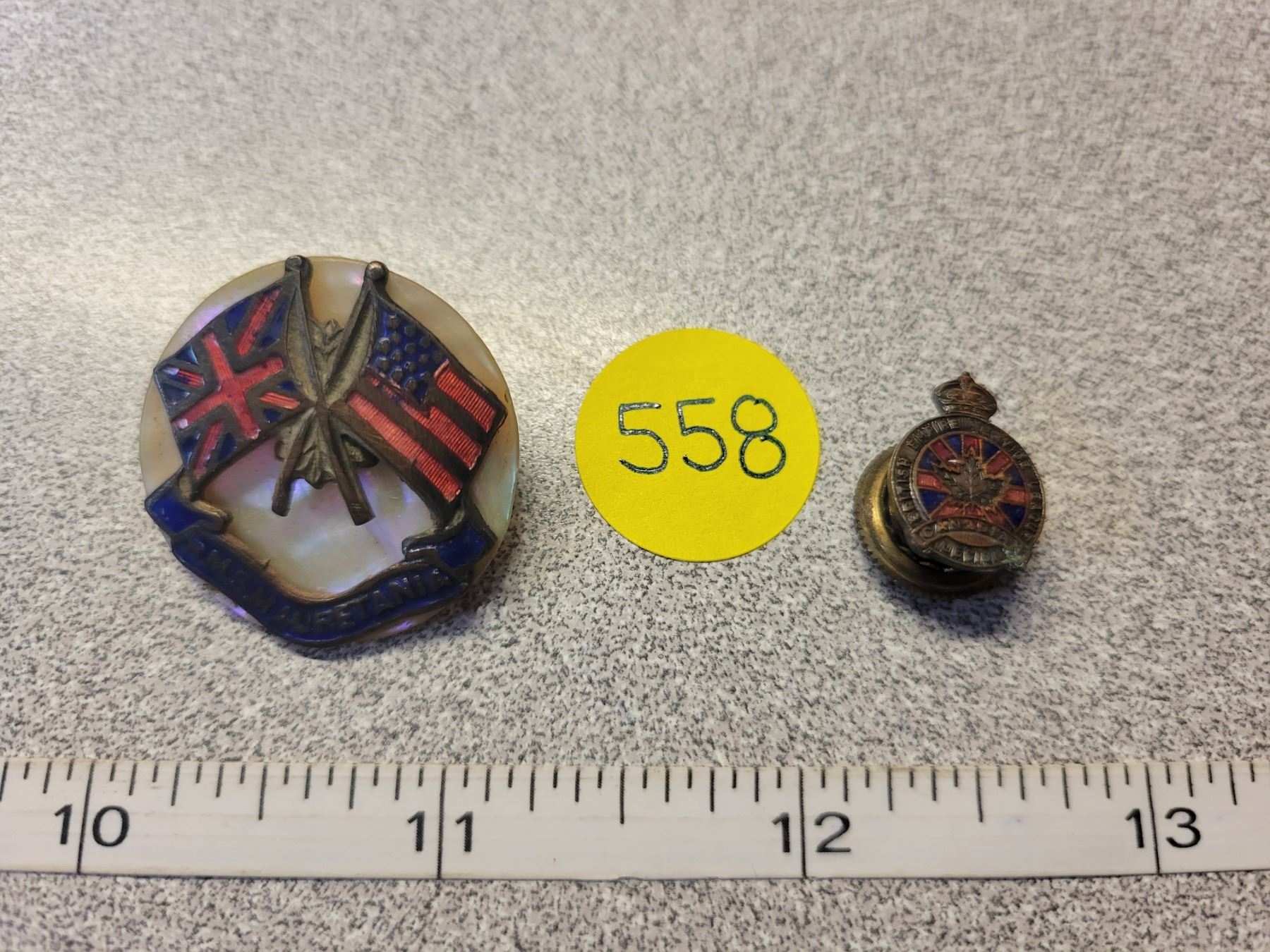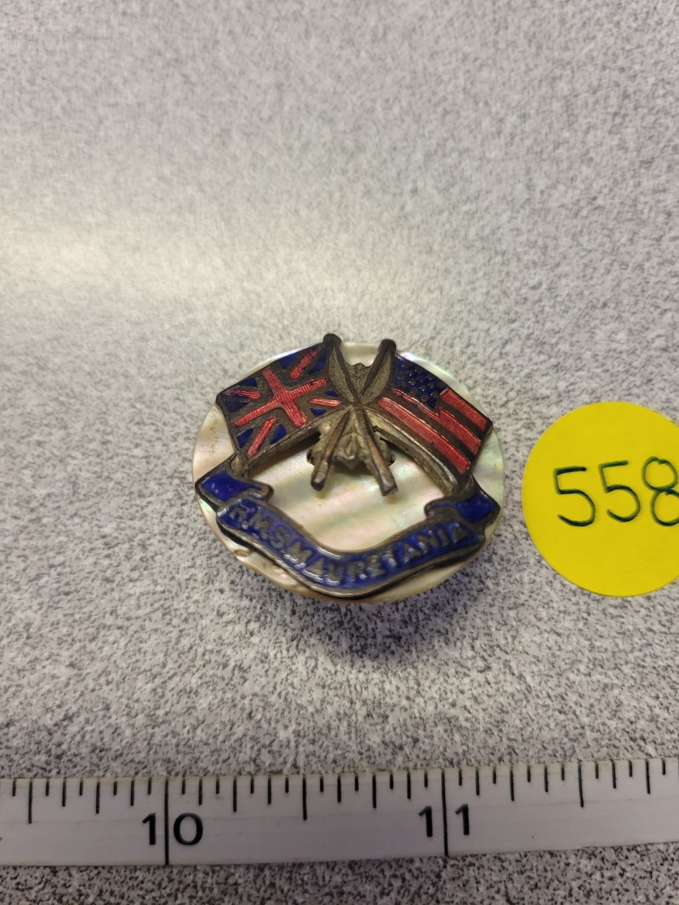 WWI mother of pearl and enamel RMS Mauretania pin & WWII British Empire servce league Canadian Legion collar badge