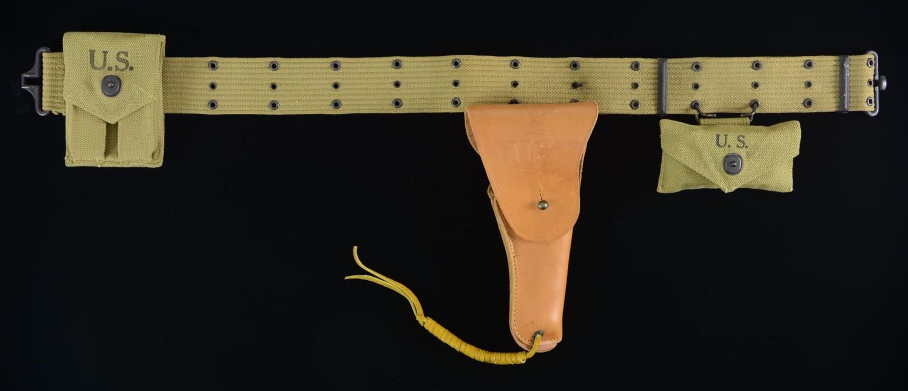 774 OF "U.S. MILITARY HOLSTERS AND RELATED ACCOUTREMENTS" BY EDWARD SCOTT MEADOWS. This rig contains Sears 1942 dated Model 1916 holster. / R.M. CO. web belt. / E. A. Brown Mfg. CO. 1942 dated first aid pouch with Handy Pad first aid kit. / B. B. Inc. 1942 dated double magazine pouch. CONDITION: very good overall showing light wear; holster shows verdigris on holster rivets & brass stud. PROVENANCE: The Collection of Edward Scott Meadows. (02-22093/MD). $400-600.