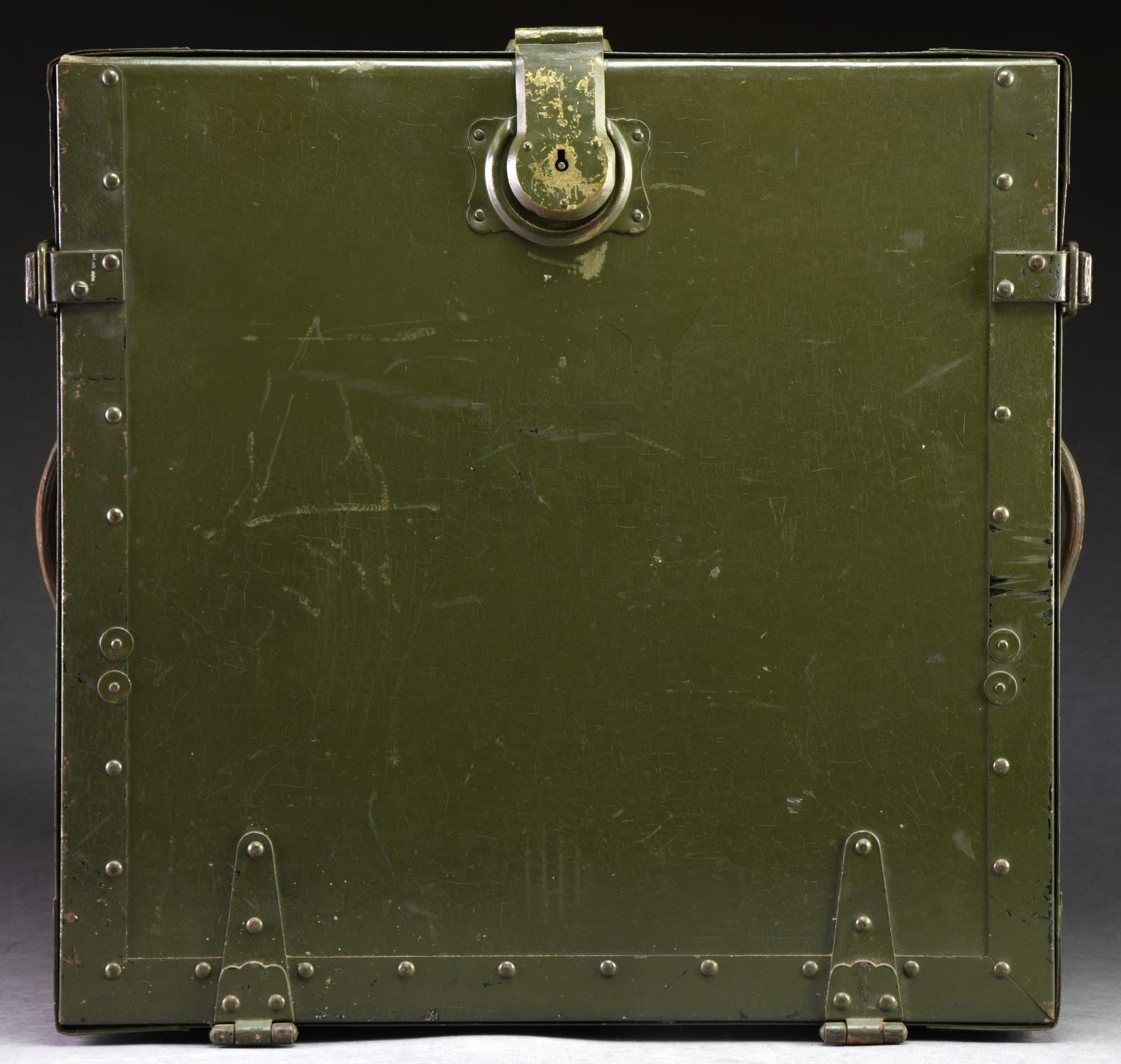 An extremely clean 1942 dated U.S. Army Officers table top fold out desk. Hardwood construction w/ metal reinforced edges & corners. Olive Drab green painted exterior w/ natural wood finish interior. Thick leather handles on each side. Lockable w/ included key. Measures 20"x20"x11" exterior dimensions when folded. Internal drawer measures 8.5"x18" inside, Painted brass tag on top reads; "STOCK NO. 26-C-2834 / TENT. SPEC. 11-15-40 / CONT. NO. W199-QK-24127 / C.Q.M.D. 2-17-42 / ANERICAN HARDWARE CO. INC. CONDITION: Exterior paint enjoys full coverage w/ some light handling marks. Internal wood in very nice condition w/ only a few light dings & in very nice structural condition. (02-19611-25/JZ). $200-400