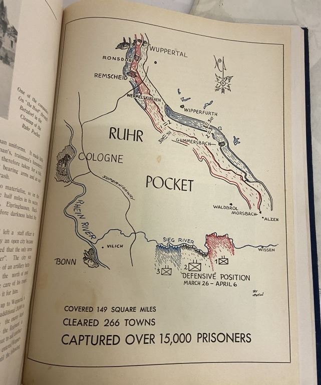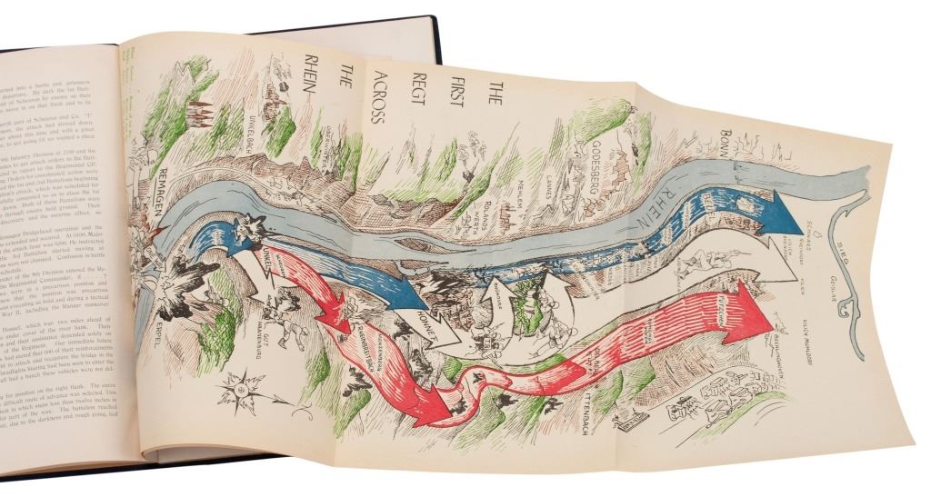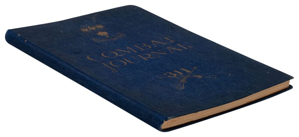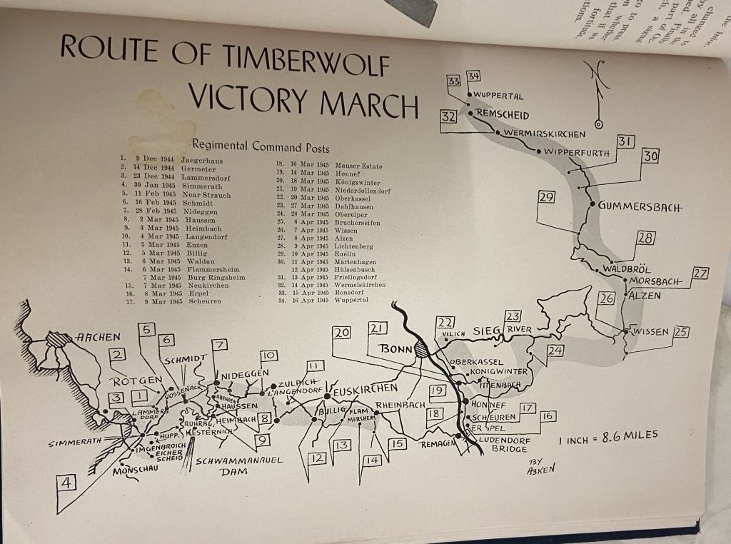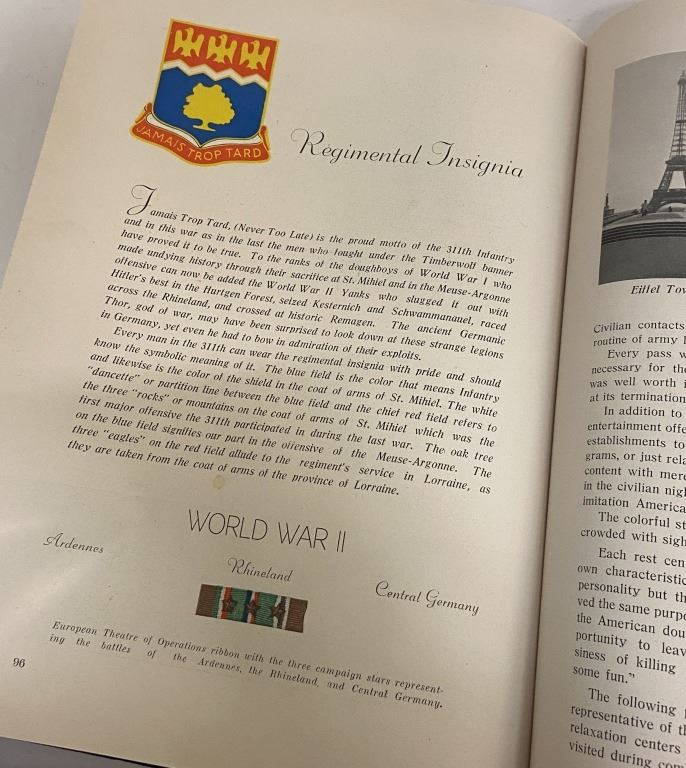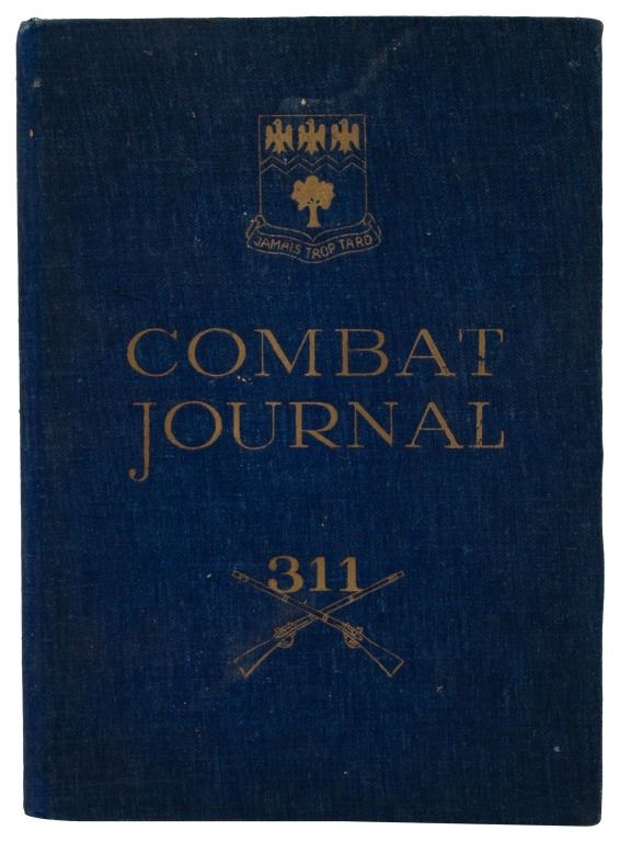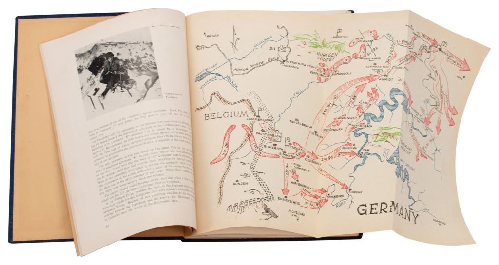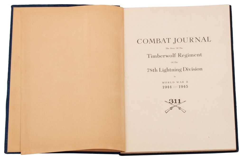 Item/Description: Combat Journal: Story of the Timberwolf Regiment of the 78th Lightning Division in World War II 1944-1945 in the 311 Infantry Regiment. Blue cloth with gilt lettering and decoration. Executive Editor: Major Joseph Lipsius. Numbered on page 141: Book No, 780. Folding pull-out, color map. Printed by Parzeller & Co. in Fulda, Germany in 1945.