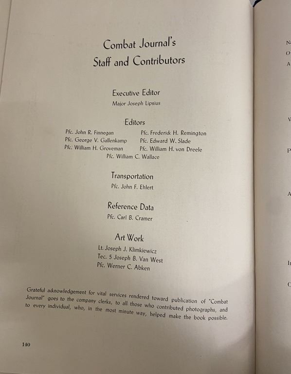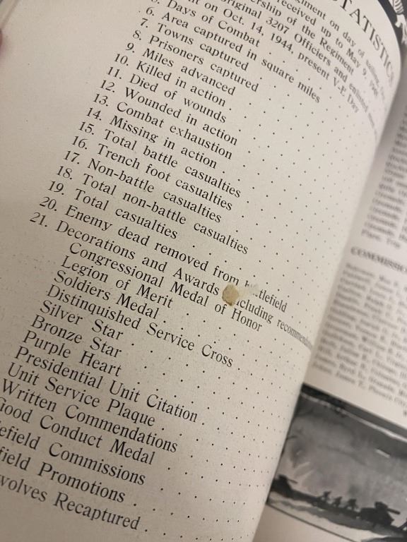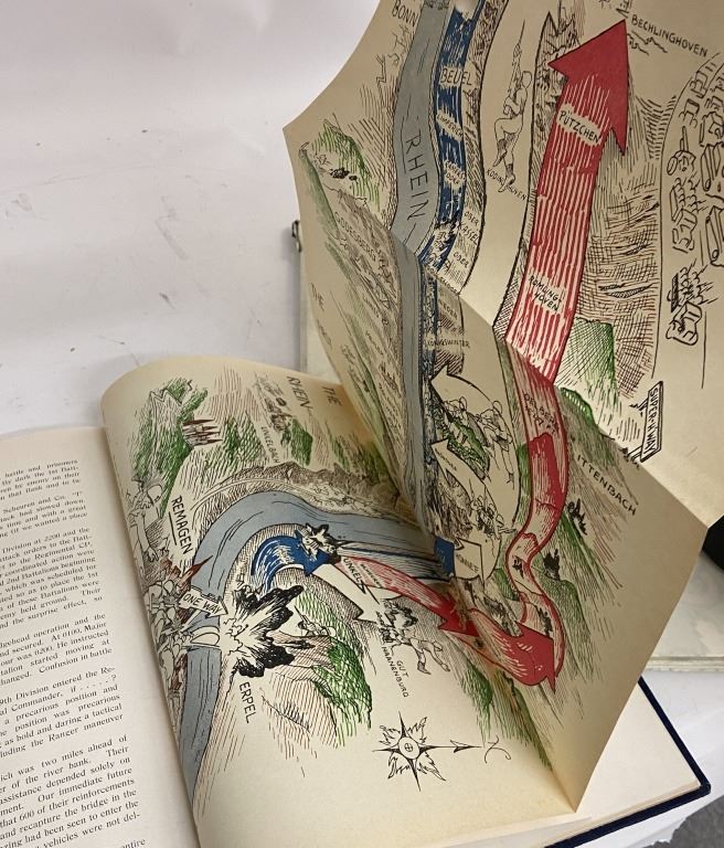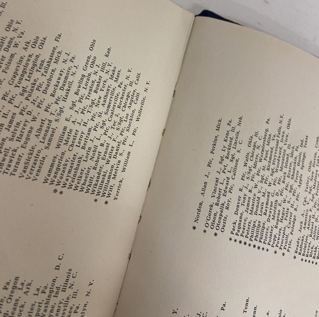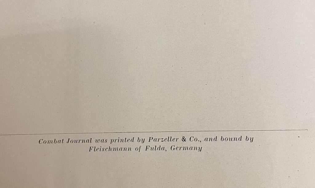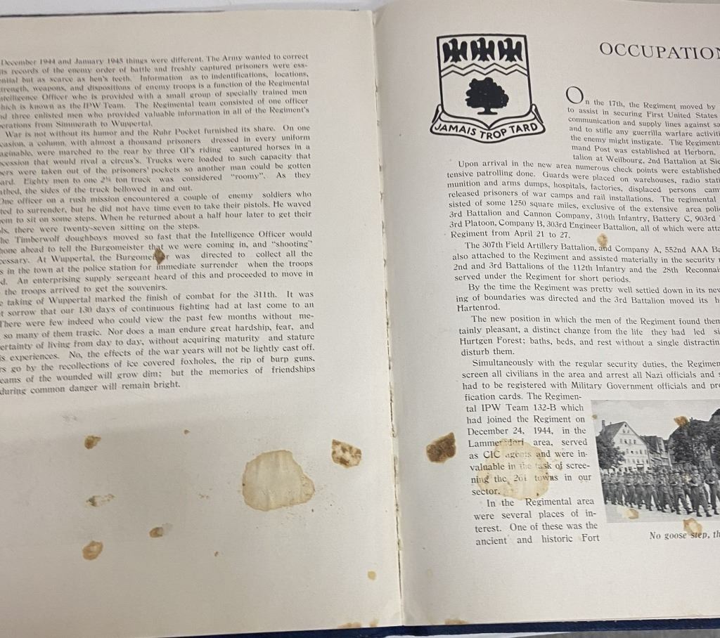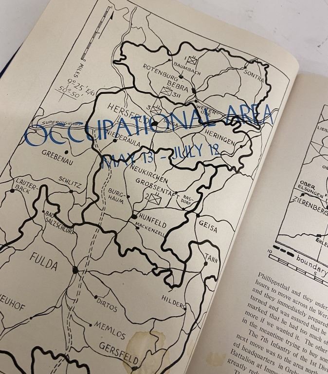 Item/Description: Combat Journal: Story of the Timberwolf Regiment of the 78th Lightning Division in World War II 1944-1945 in the 311 Infantry Regiment. Blue cloth with gilt lettering and decoration. Executive Editor: Major Joseph Lipsius. Numbered on page 141: Book No, 780. Folding pull-out, color map. Printed by Parzeller & Co. in Fulda, Germany in 1945.