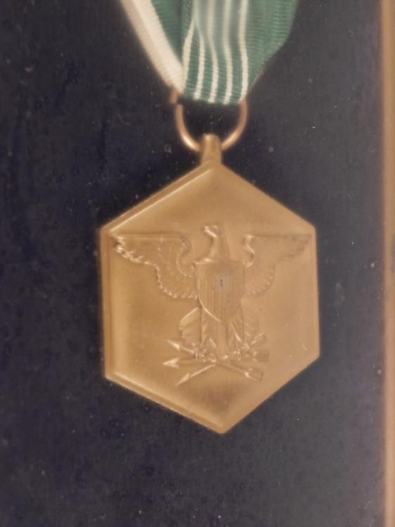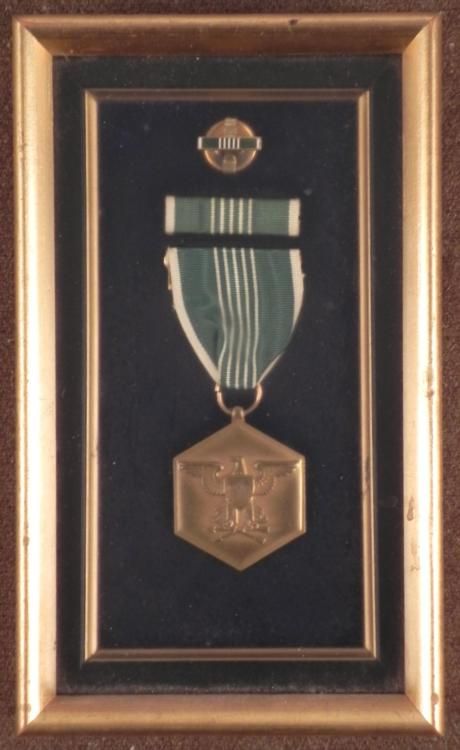 WWII 1945 ORIGINAL U.S. ARMY COMMENDATION MEDAL, BAR, LAPEL PIN-GLASS+GOLD FRAME * CASE IS 4 1/4 X 7 1/4" *