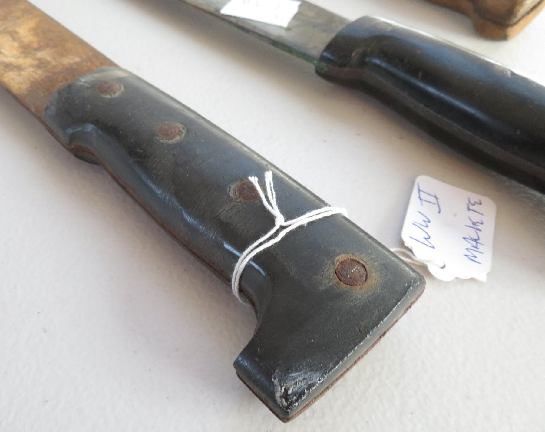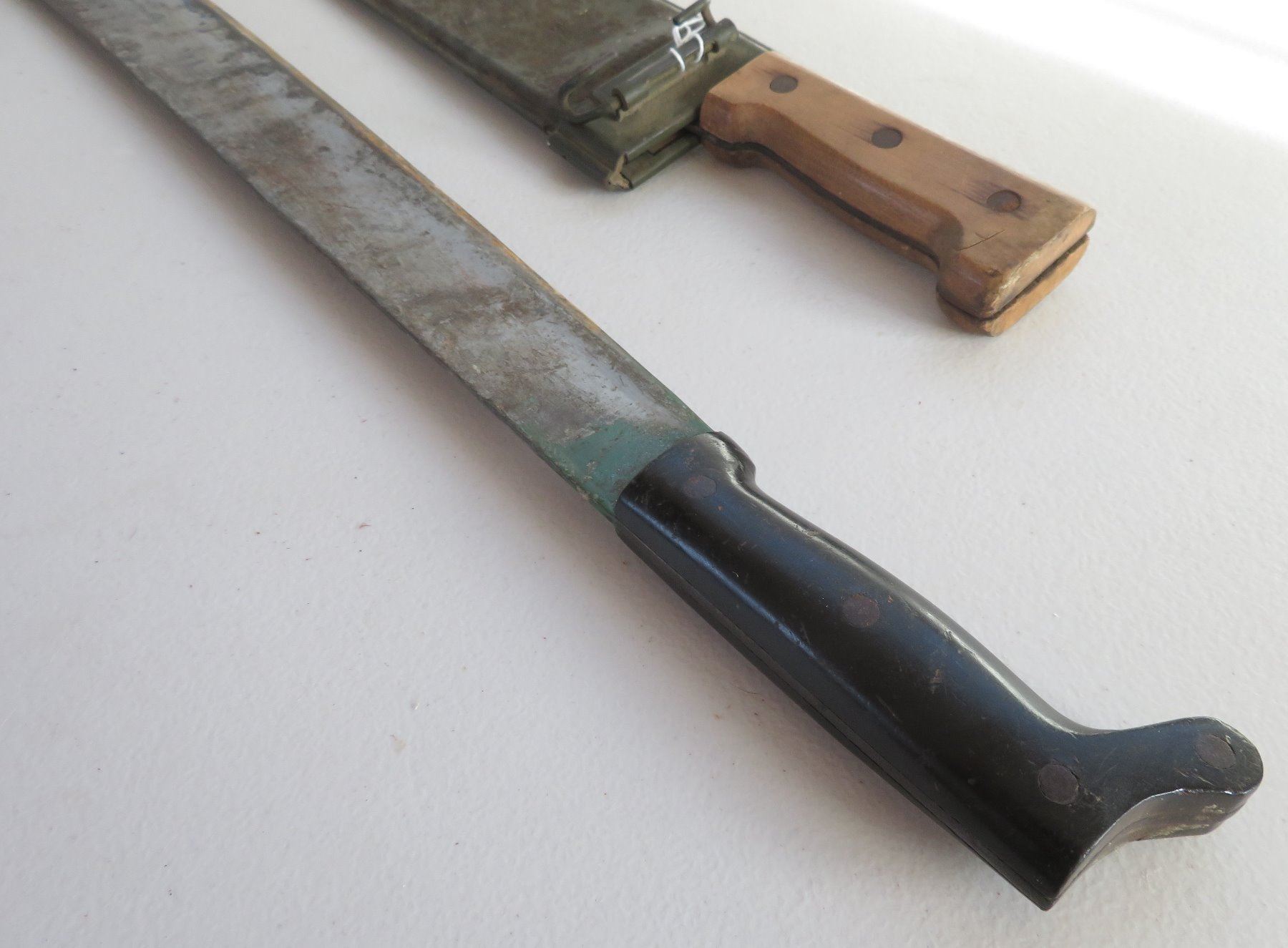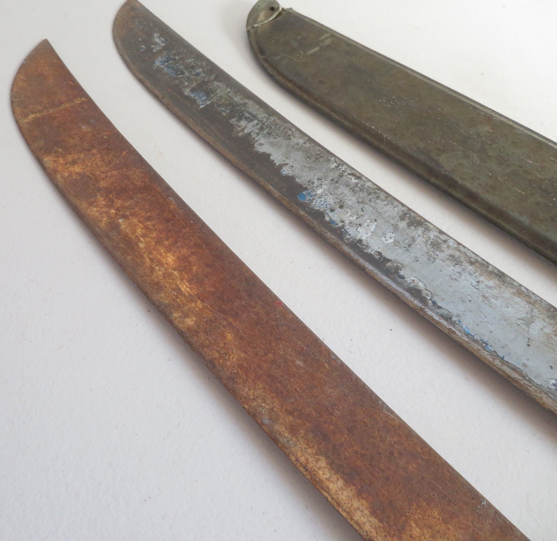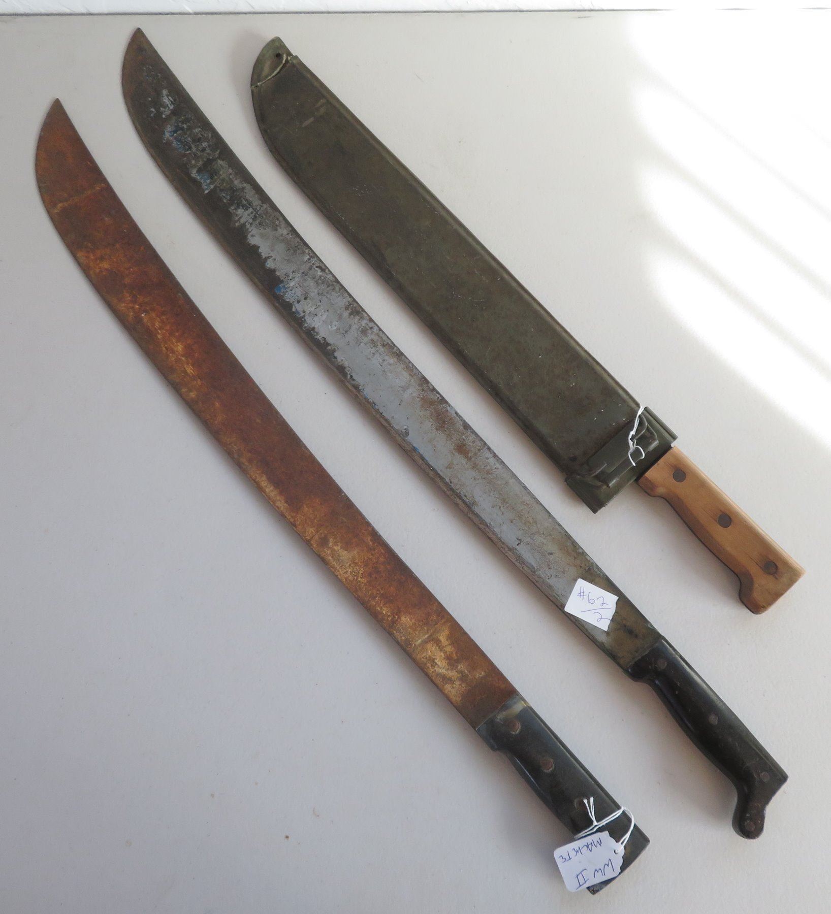 WWII 3 Blade Machete Collection, one marked 1945. Made of steel, plastic and wood, the items measures 24", 29" and 31". England, USA. Used in the Pacific, the one with scabbard is dated 1945. Condition: Rust, nicks, see images. Shipping: $42.50 w/insurance and signature, due to length and weight.