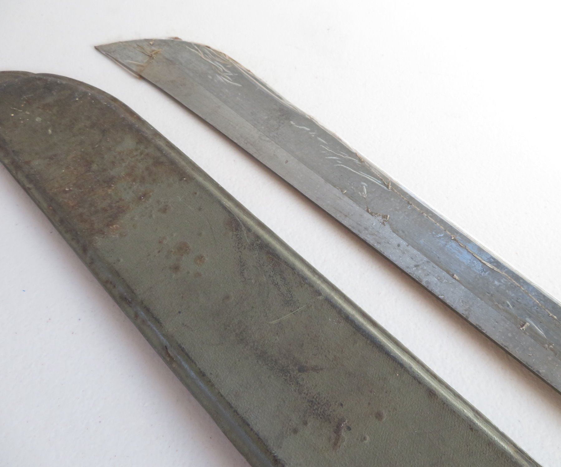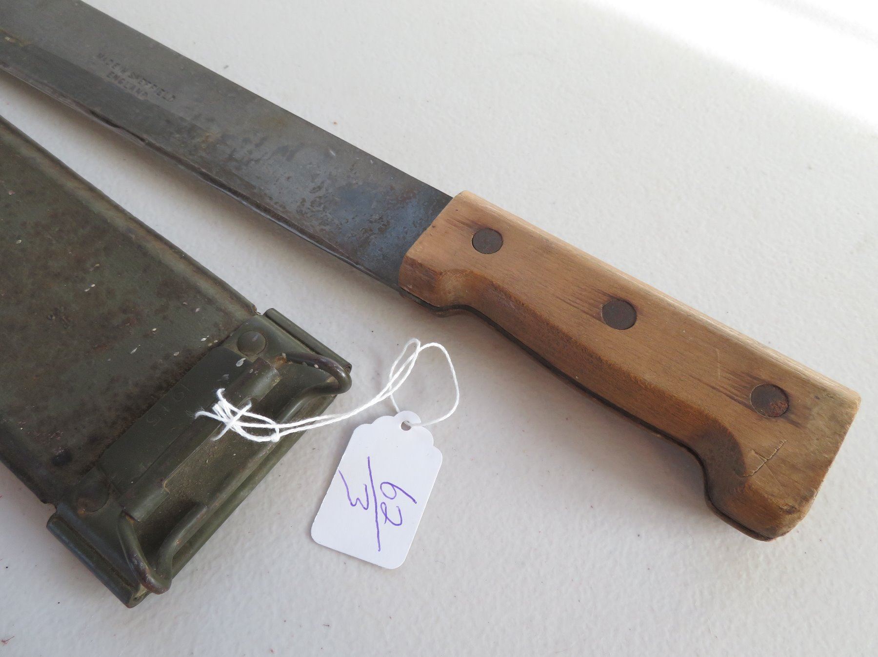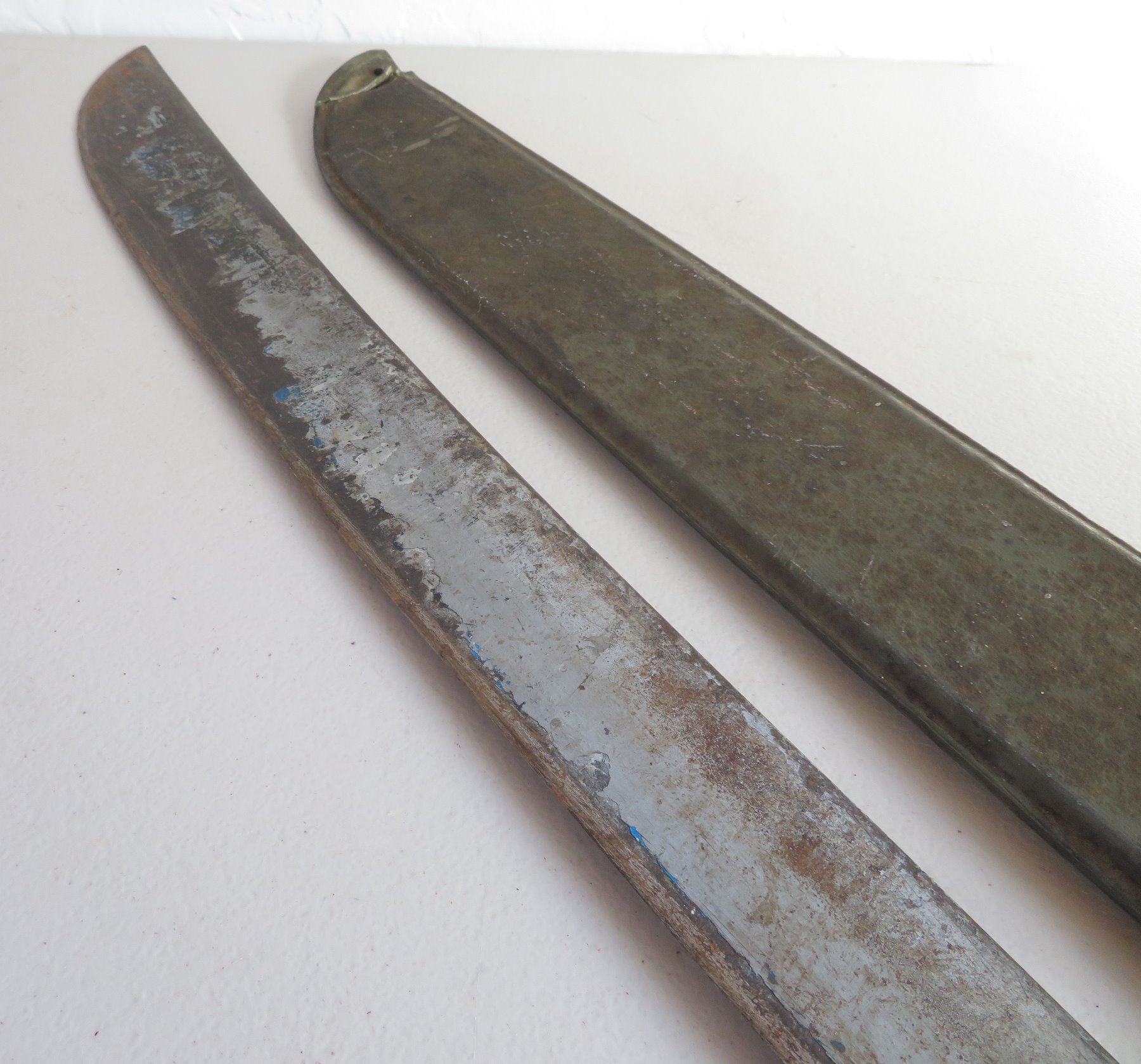 WWII 3 Blade Machete Collection, one marked 1945. Made of steel, plastic and wood, the items measures 24", 29" and 31". England, USA. Used in the Pacific, the one with scabbard is dated 1945. Condition: Rust, nicks, see images. Shipping: $42.50 w/insurance and signature, due to length and weight.