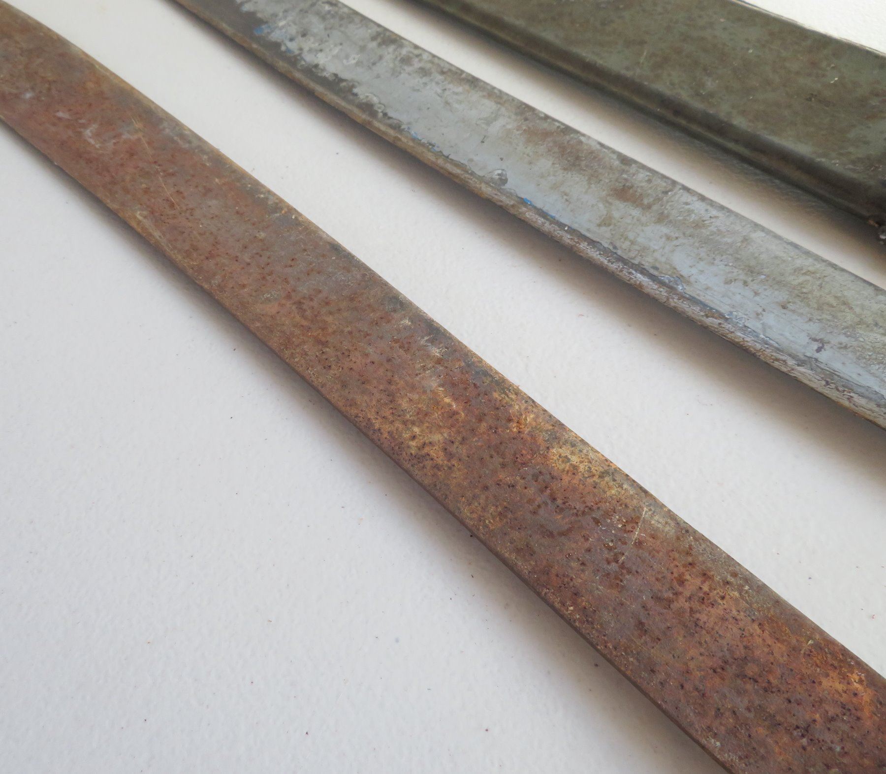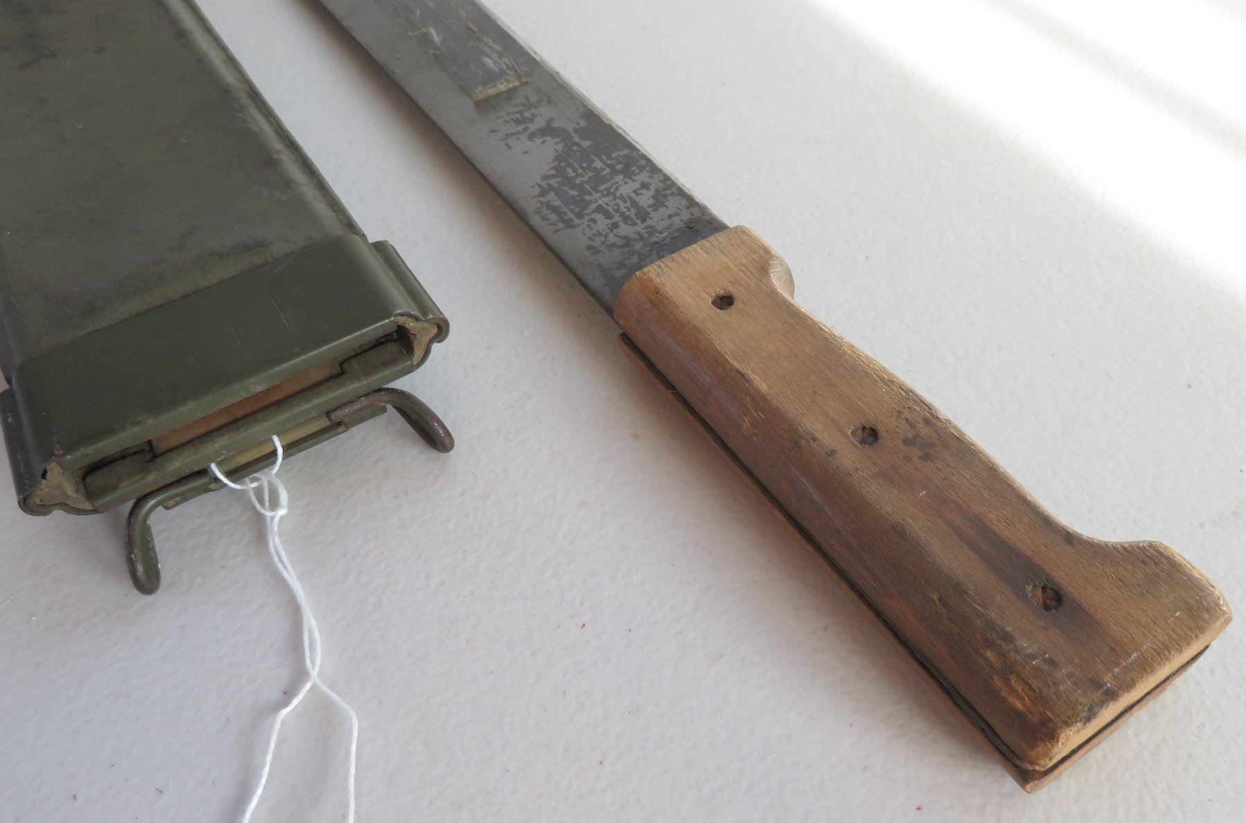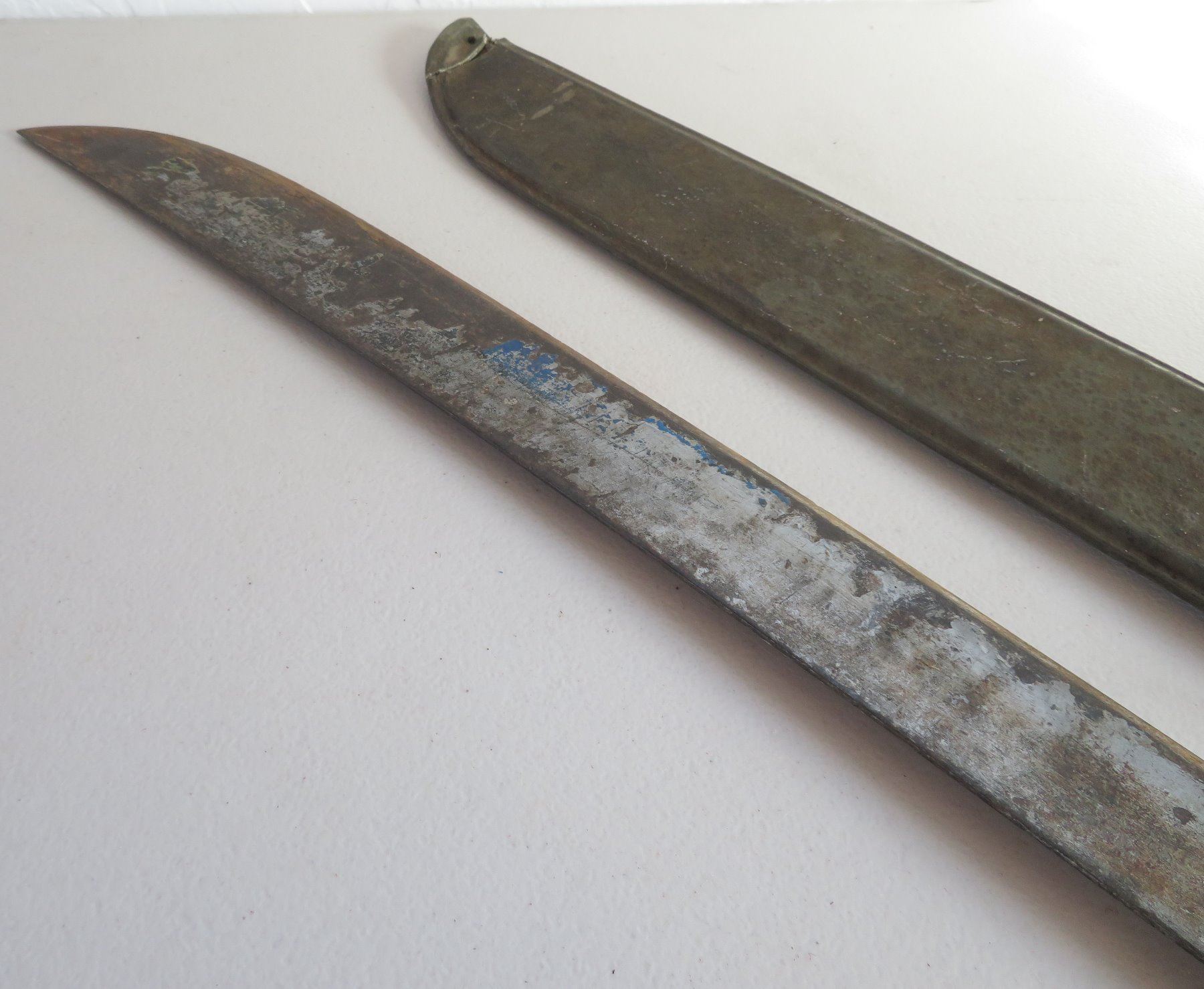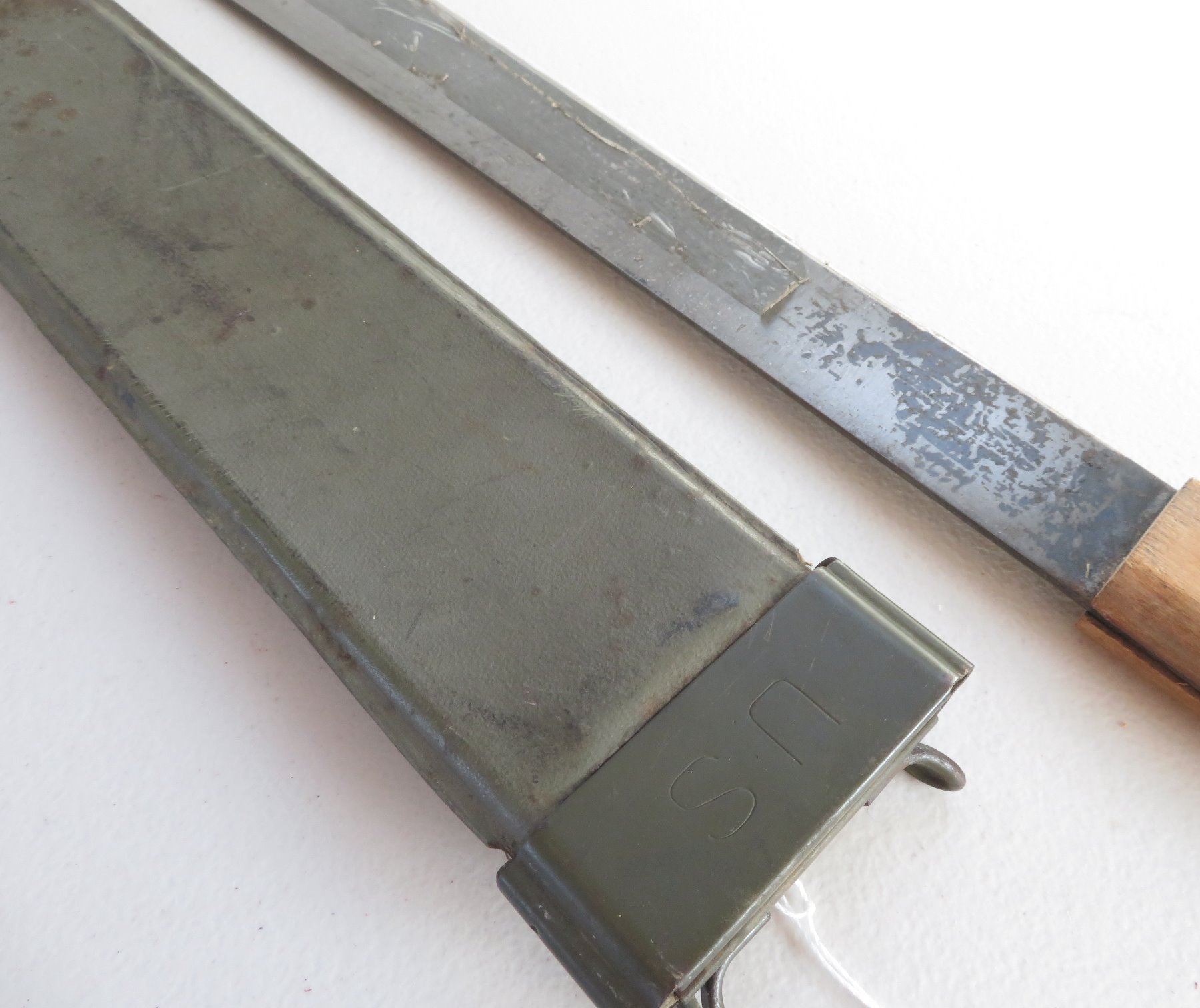 WWII 3 Blade Machete Collection, one marked 1945. Made of steel, plastic and wood, the items measures 24", 29" and 31". England, USA. Used in the Pacific, the one with scabbard is dated 1945. Condition: Rust, nicks, see images. Shipping: $42.50 w/insurance and signature, due to length and weight.