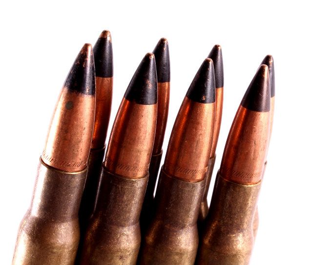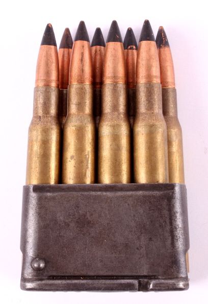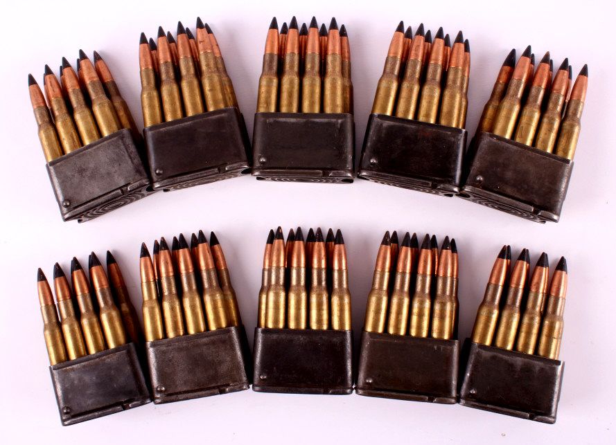 This lot includes 10 full WWII M1 Garand clips. The clips contains 8 rounds. Each round is marked "F N 68" and has a black tip. The clips are in very good condition. All the ammunition is in new, unfired condition.
