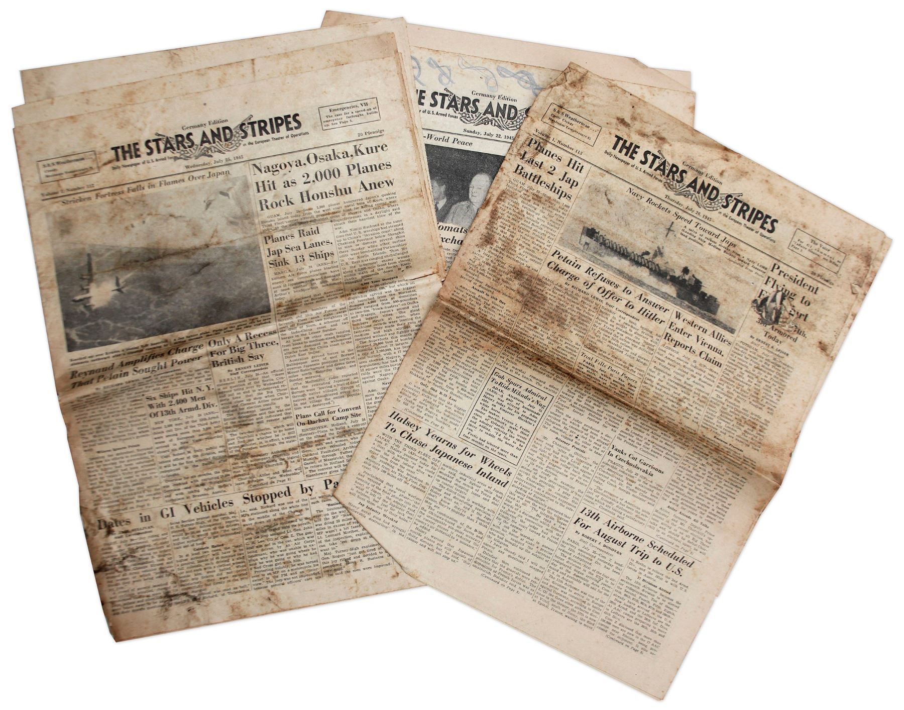 Lot of 4 ''The Stars and Stripes'' newspapers from 22-26 July 1945, including copies of the Germany edition. The daily papers report on attacks on Japan in the weeks before the atomic bomb was dropped on Hiroshima. In other news, President Truman participates in Big Three talks in Potsdam and Howard Hughes builds a huge wooden airplane. Two of the 11.75'' x 16.75'' issues are incomplete. Significant toning, foxing and chipping; good condition.