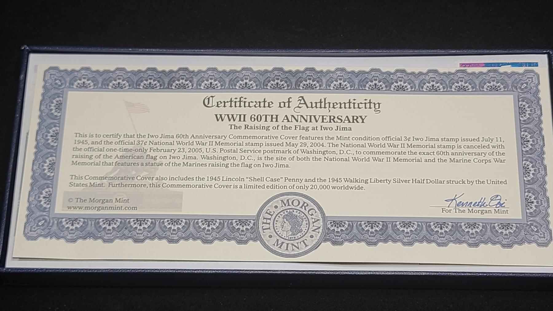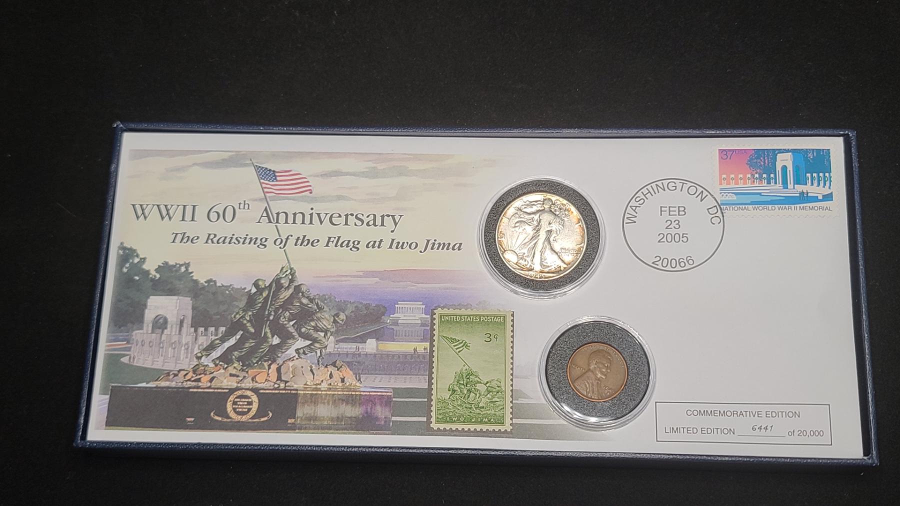 WWII 60th Anniversary Commemorative Coin and Stamp Set Including 1945 Walking Liberty Silver Half Dollar & 1945-S Lincoln Wheat Cent- Face Value: $0.51