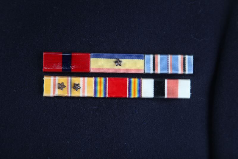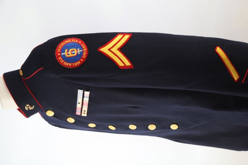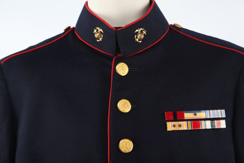 Aussie made shoulder patch, EGA collar insignia, aviation radio man striker, six button front, ribbons including Presidential Unit Citation with star, lined high quality private purchase tunic, free of damage including mothing.