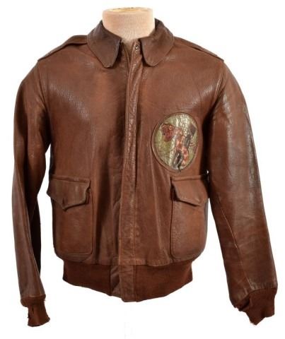 346th Bomb Squadron, E.A.Z. 1942. Tag reads: "TYPE A-2, DRAWING NO. 30-1415, A.C. ORDER NO. 42-10008-P, CABLE RAINCOAT CO., PROPERTY AIR FORCE, U.S. ARMY". Small tag has a size of "36", beneath tag is stamped the initials "E.A.Z." On left breast is a dark blue disc painted on leather with black 500lb GP aerial bomb intertwined with a yellow and brown Diamondback rattlesnake. Flying B-17's, the squadron transferred from the American Theatre to the MTO where they were stationed in various air bases in Algeria, Tunisia and Italy. The first unit first served with the 12th Air Force and then was assigned to the 15th Air Force, with assignments including bombing oil refineries, marshaling yards, aircraft factories and other strategic objectives. The 346th was awarded two DUC's during WWII for engagements in Sicily and Austria.