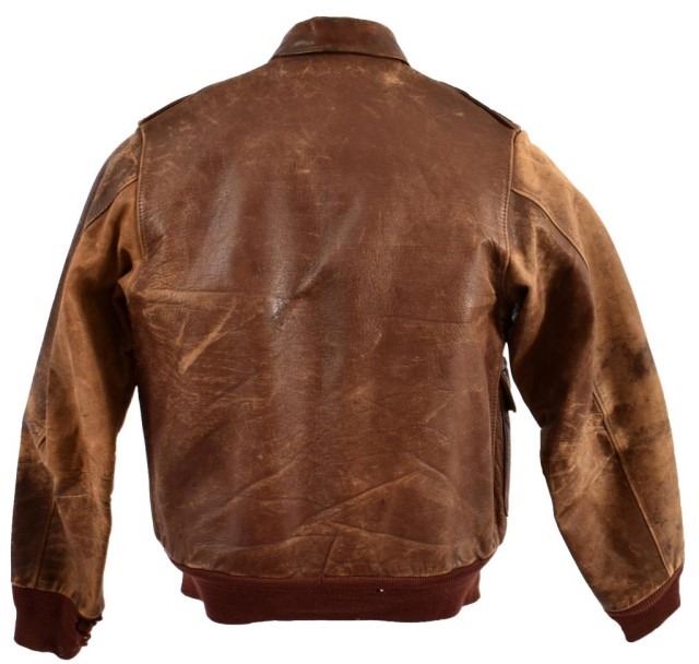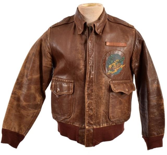 47th Fighter Squadron, J.P. 1943. Leather name tag stamped: "J.P. BRUNETTE". Below the hang up strap is printed in ink "BRUNETTE". Tag reads: "TYPE A-2, DRAWING NO. 30-1415, ORDER NO. W535 A.C. 27798, J.A. DUBOW MFG. CO., CHICAGO, ILL., PROPERTY AIR FORCE U.S. ARMY, 36". On left breast is a stamped leather nametag for "J.P. BRUNETTE". Below nametag is a painted on leather 47th Fighter Squadron Patch(showing a winged insect - TURNIP TERMITE- with yellow body, orange face and legs, yellow green ears and wings riding a large, yellow, jagged lightning bolt toward dexter base on an all blue disc. Jacket had lieutenant's bars on each shoulder which are now missing. Brunette flew a P-51D named "HAIRLESS JOE" in the Pacific theater.