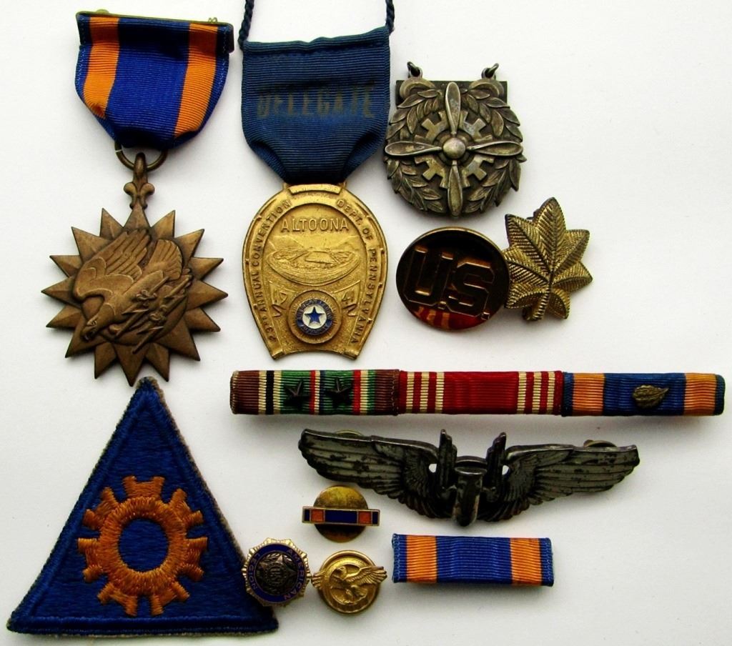 BOX, RIBBON BAR, AREAL BOMBER WINGS, AP MECHANIC BADGE, MAJOR OAK LEALLF, PATCH, ALTOONA ANNUAL CONVENTION, AND SOME AMERICAN LEGION ITEMS.