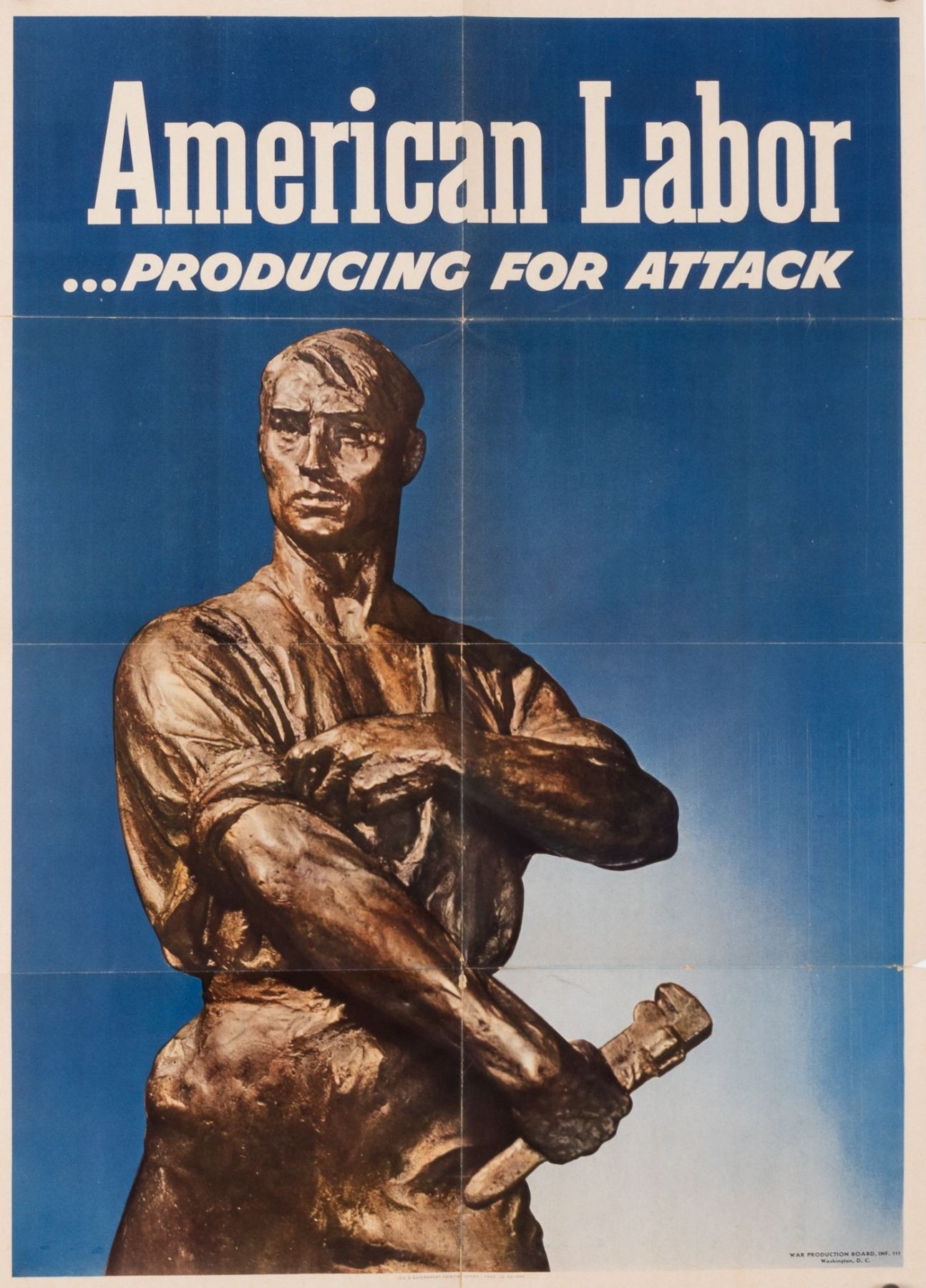 American Labor...Producing for Attack', War Production Board, US Government Printing Office, 1943-O-541688, 28 x 20 inches. Mailing folds and old tape repair on verso.