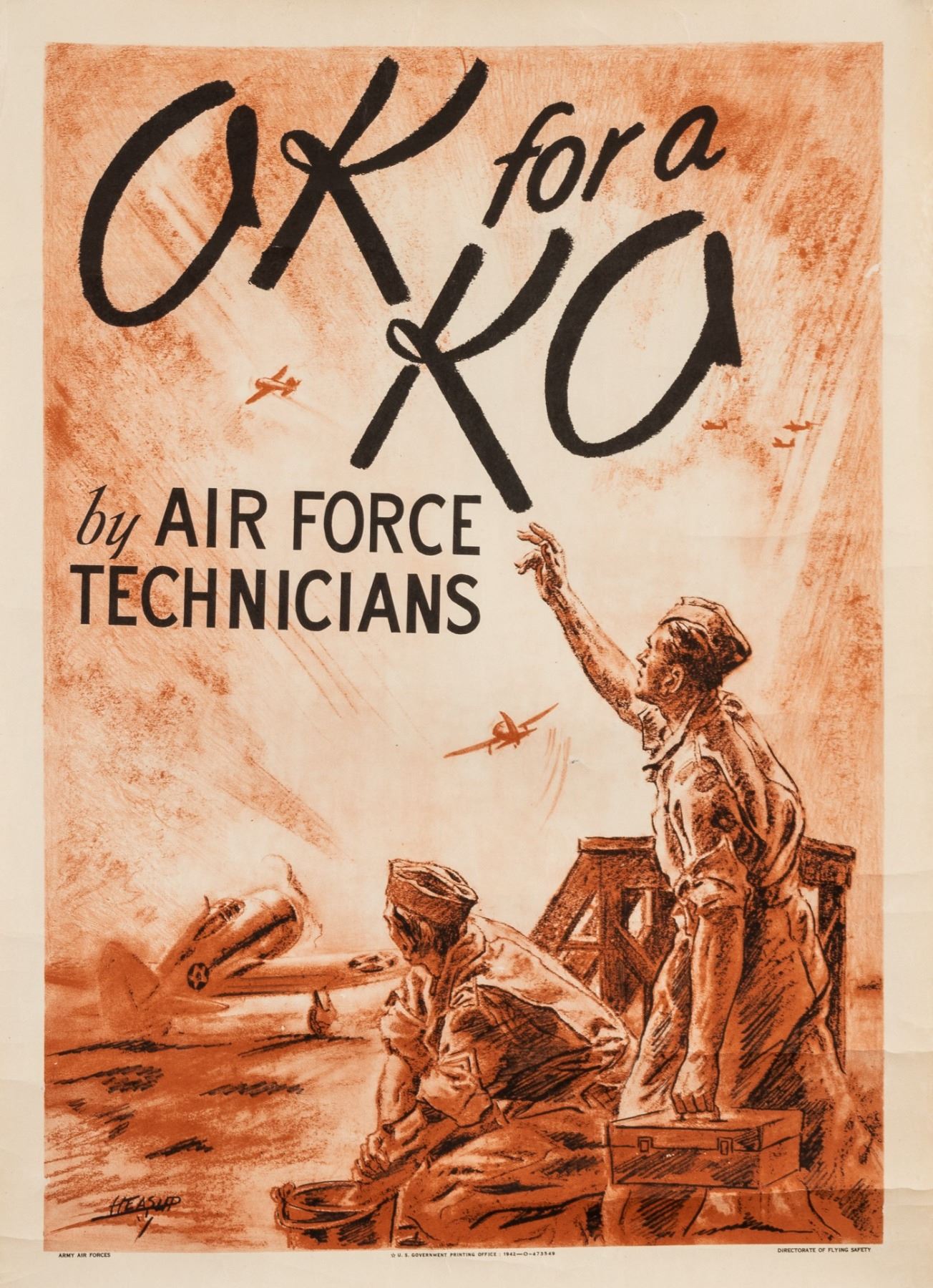 American WWII propaganda poster 'O.K. for K.O. - by Air Force Technicians', artwork by William Heaslip (1898-1970), Army Air Forces, Directorate of Flying Safety, U.S. Government Printing Office 1942-O-473549, 16 x 22.5 inches. Poster shows some creases and minor tears at edges.
