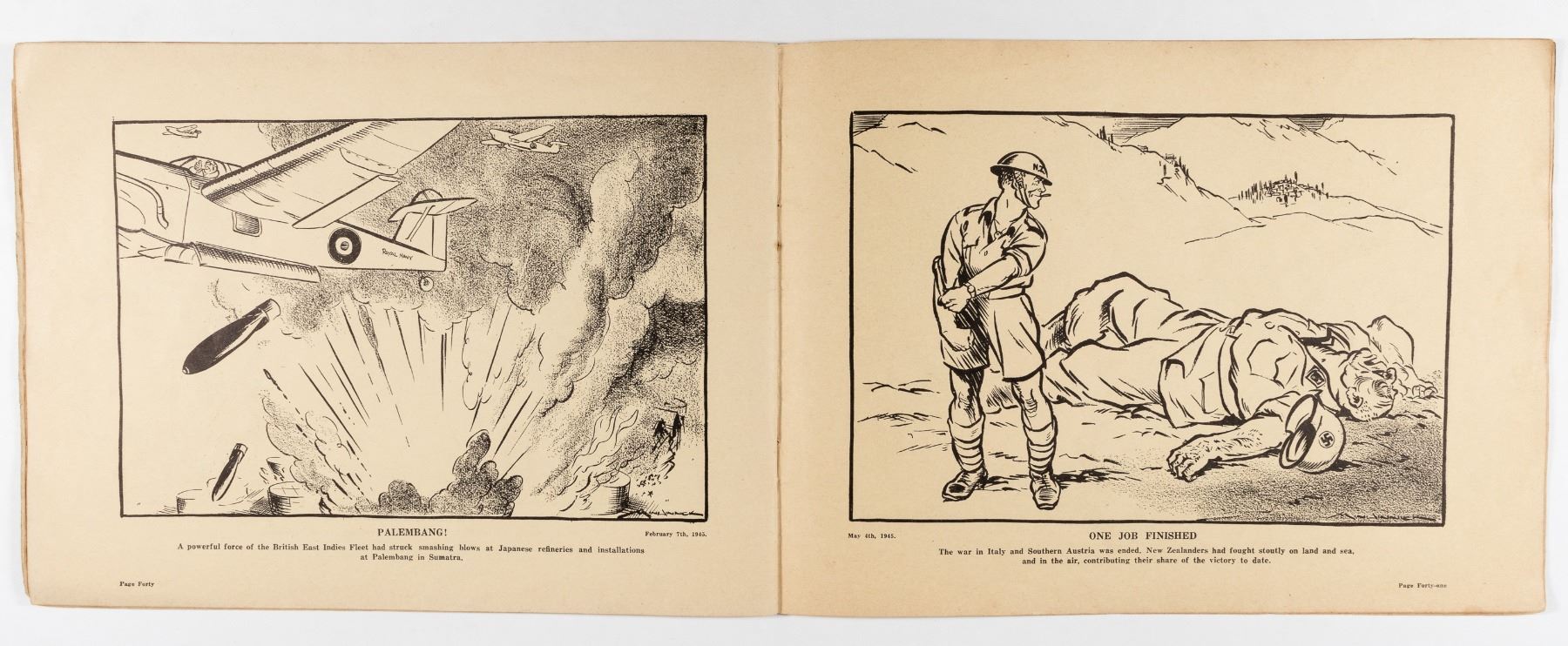 More War Cartoons and 'Old Soldier Sam'' by Gordon Minhinnick, The New Zealand Herald, 56 pages, 8.25 x 11.25 inches. The book contains many anti-axis illustrations with the cover showing Hitler, Mussolini, and Tojo on ropes. Included in lot is a hand-made artwork of American soldiers in a Jeep going up a mountain with a small landscape in the background. The artist is unknown and the artwork is not dated, likely 1940s. 15.75 x 11.5 inches. Minhinnick was a New Zealand cartoonist for the New Zealand Herald. Minor soiling, oxidation of cartoon book's bindings, chipping on page edges, else fine.
