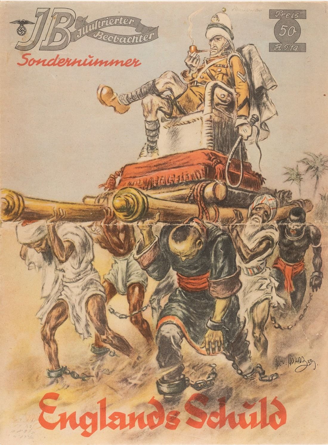 Anti-British propaganda map published by German magazine 'Illustrierter Beobachter', ca. 1939. Cover reads 'England's Fault' and depicts a British colonialist, being carried by Chinese, Indian, and Black men. Three maps are included: the 'North Sea Theatre of War', a world map showing the areas of the world protected by Germany or its enemies, and a large map of England. 29 x 22 inches, unfolded. 14.5 x 11, folded. Map has minor splits, 1-inch split on cover, 1-inch split at center fold.