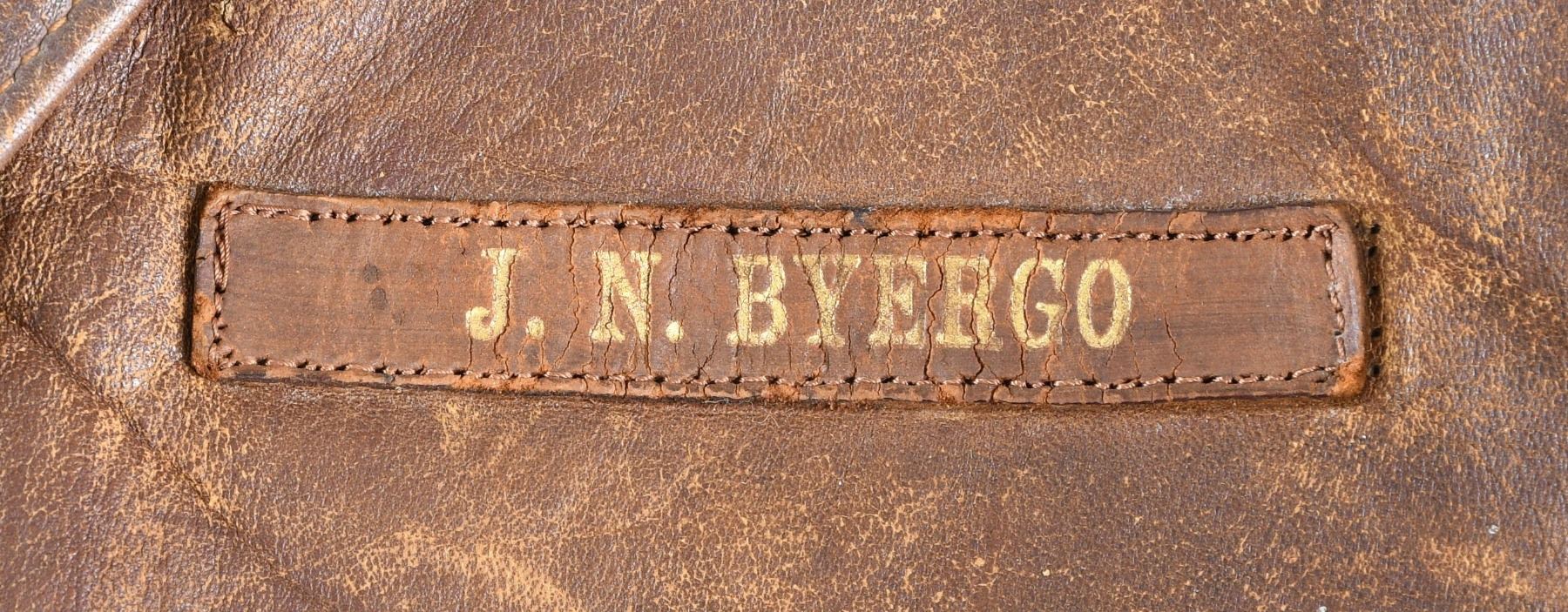 J. N. BYERGO. This original well-worn size 40 A-2 flight jacket was one of 50,000 manufactured by the Rough Wear Clothing Company to comply with a contract dated 27 April, 1942. The jacket is undecorated but has a leather nametag at the left breast that reads "J. N. BYERGO" in gold leaf on brown leather. As correct, there are two outside flap pockets near the waist and two interior flap pockets also near the waist. The cuffs and waist are rib knit and the usual brown color. The lining is a red/brown cotton and the interior pockets are khaki. A label at interior of the neck reads "TYPE A-2 DRAWING NO. 30-1415 CONTRACT NO. W535 AC-27752 ROUGH WEAR CLOTHING CO. MIDDLETOWN, PA. PROPERTY AIR FORCE U.S.ARMY". John Neff Byergo of New York was a Captain in the 366 Army Air Force Fighter Group during WWII. Among other awards, he received the Air Medal with Oak Leaf Cluster. UNATTACHED ACCESSORIES: copy of news paper articles relating to the death of John Byergo. CONDITION: leather shows numerous scuffs and abrasions, as one would expect. Knit areas show wear, a few tears, and some insect damage. The zipper functions well. Leather is a bit dry but generally supple and malleable. (02-24292/BF). $900-1,200.