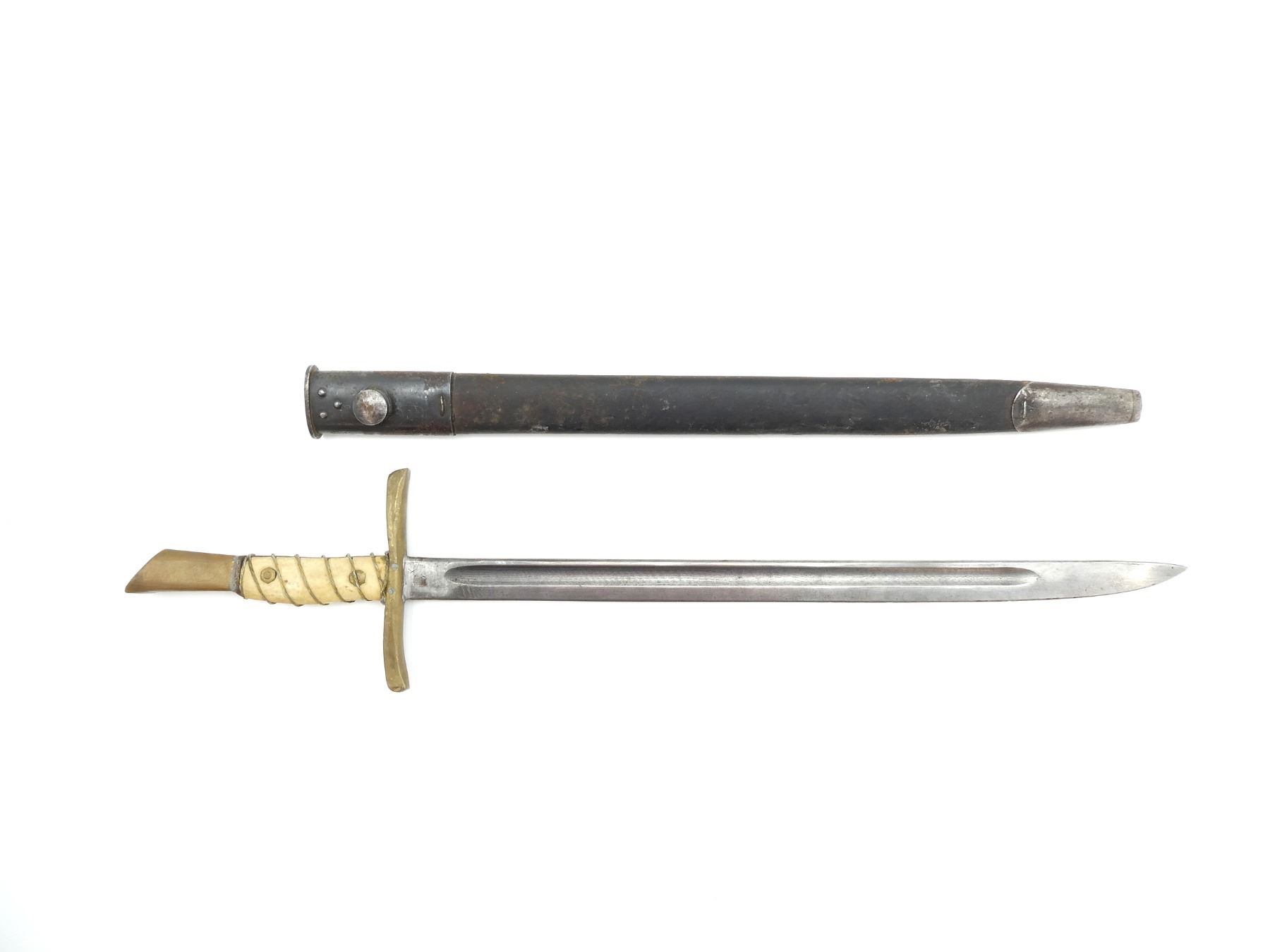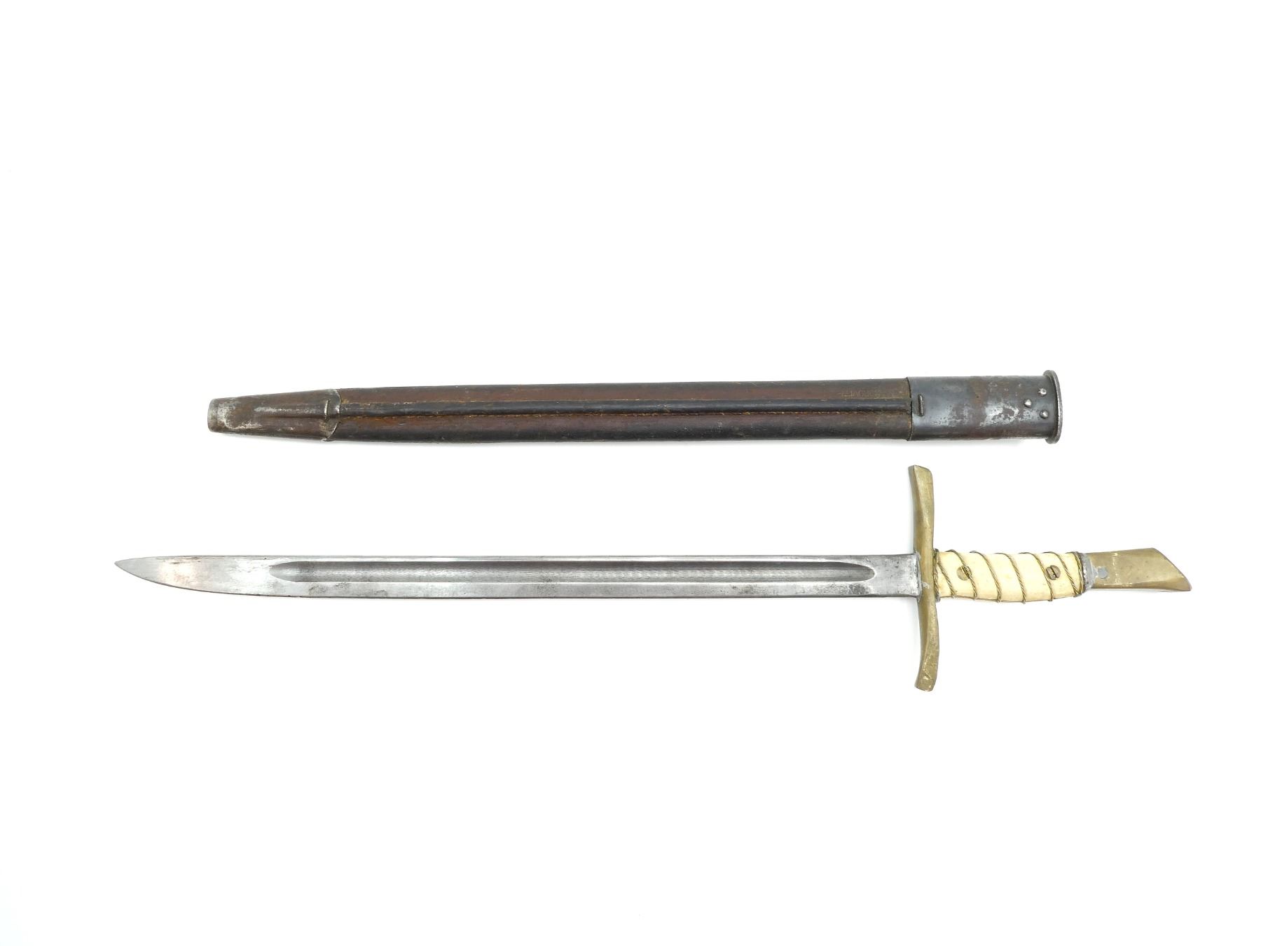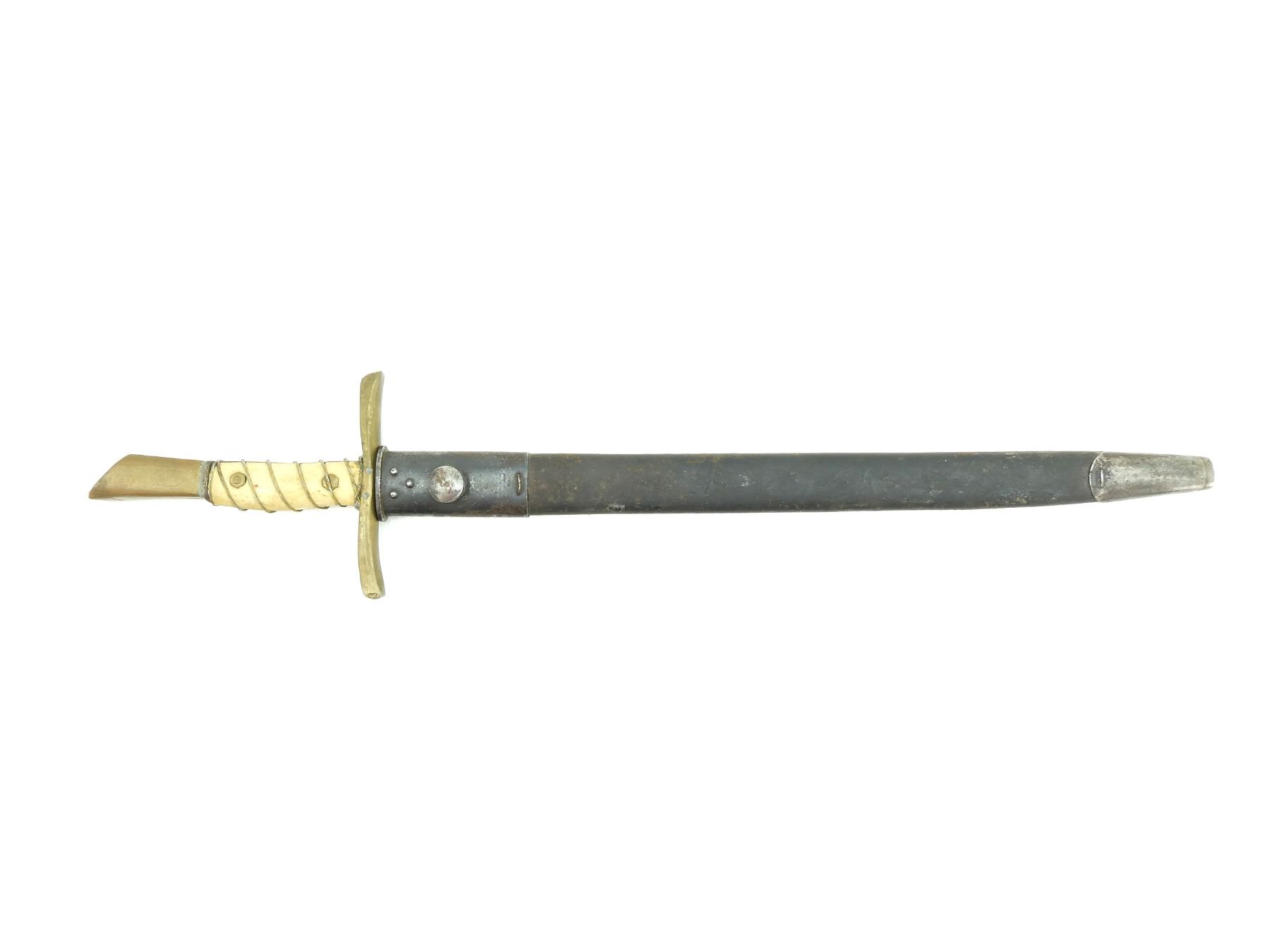 (1) FITS .303 CALIBER SHORT MAGAZINE LEE-ENFIELD NO.1 MKIII (SMLE) RIFLES, RICASSO MARKED: "M" OVER "190" OVER "1" OVER "44" & "C", OTHER-SIDE MARKED: "X (BEND TEST)", "OA", BROAD ARROW, ETC., BRASS CROSS GUARD, CUSTOM WIRE WRAPPED GRIP, BRASS POMMEL, BROWN LEATHER SCABBARD WITH METAL FITTINGS, MARKED: "MA" & "OA", BLADE APPROX. 17" & OAL APPROX. 23". SEE PHOTOS.