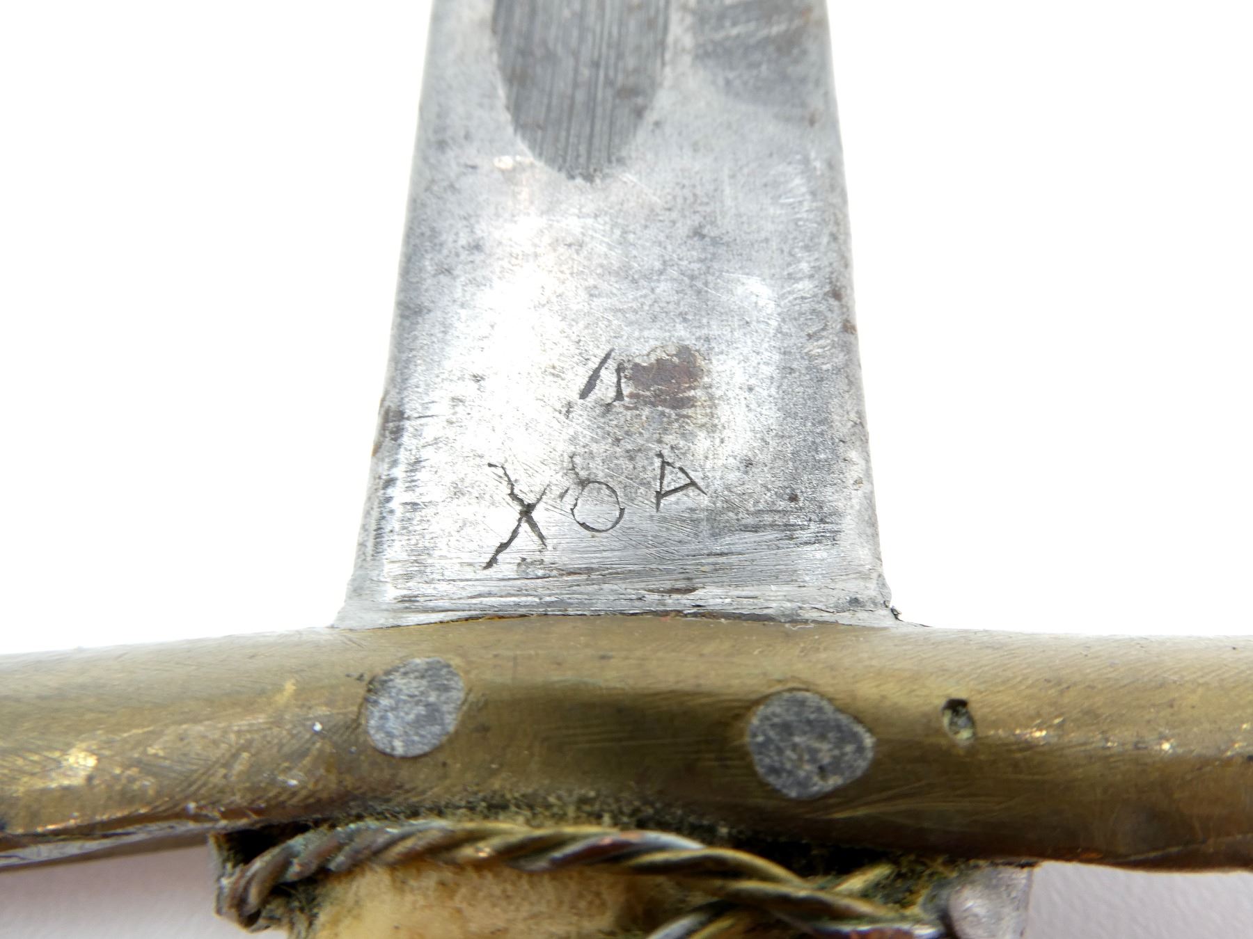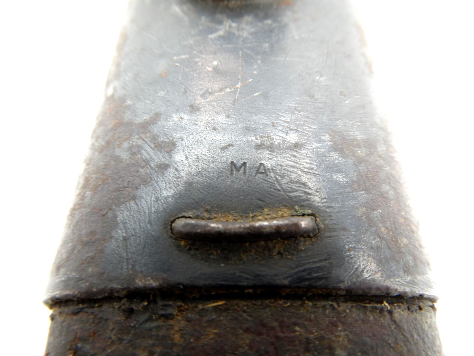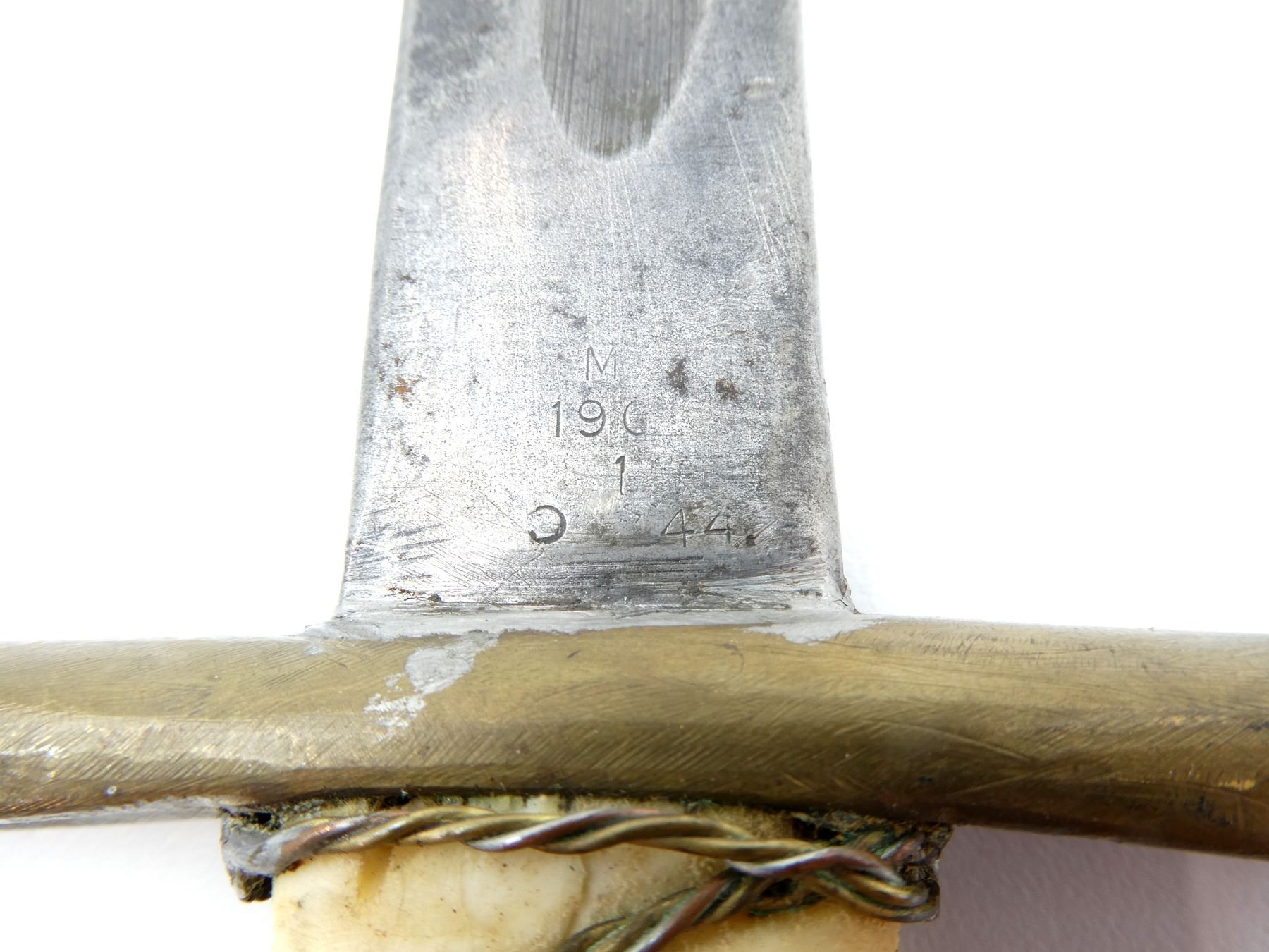 (1) FITS .303 CALIBER SHORT MAGAZINE LEE-ENFIELD NO.1 MKIII (SMLE) RIFLES, RICASSO MARKED: "M" OVER "190" OVER "1" OVER "44" & "C", OTHER-SIDE MARKED: "X (BEND TEST)", "OA", BROAD ARROW, ETC., BRASS CROSS GUARD, CUSTOM WIRE WRAPPED GRIP, BRASS POMMEL, BROWN LEATHER SCABBARD WITH METAL FITTINGS, MARKED: "MA" & "OA", BLADE APPROX. 17" & OAL APPROX. 23". SEE PHOTOS.