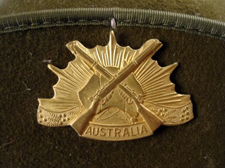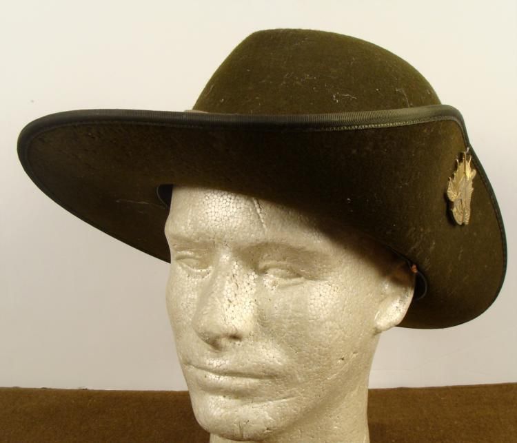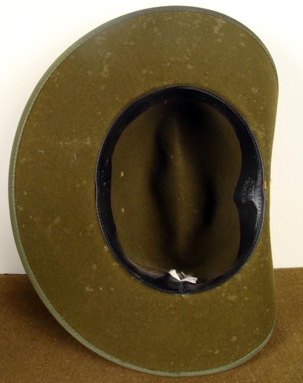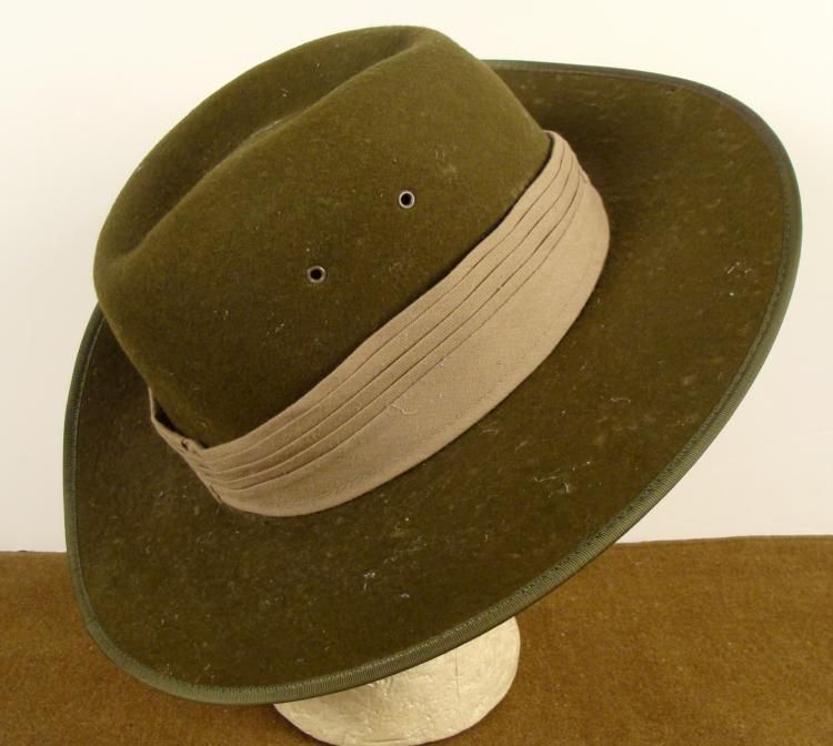THIS IS A GREAT WWII AUSTRALIAN INFANTRY SLOUCH HAT, SIDE-UP WITH INSIGNIA. THE HAT IS MADE OUT OF A BROWN WOOL FELT. IT IS MARKED SIZE 61/7 1/2. THE HAT NEEDS TO BE CLEANED UP A BIT. * * * *
