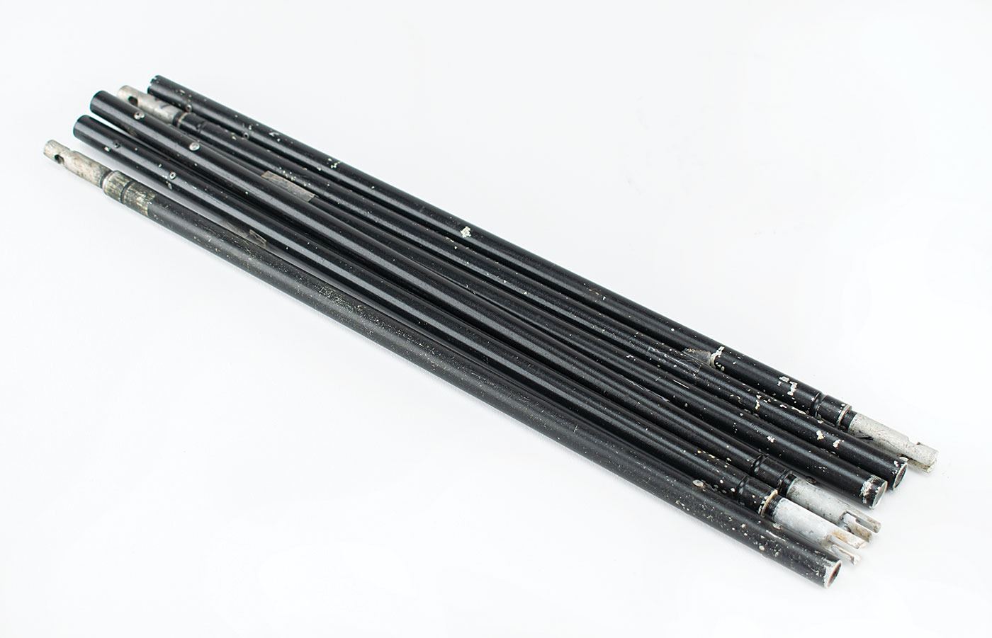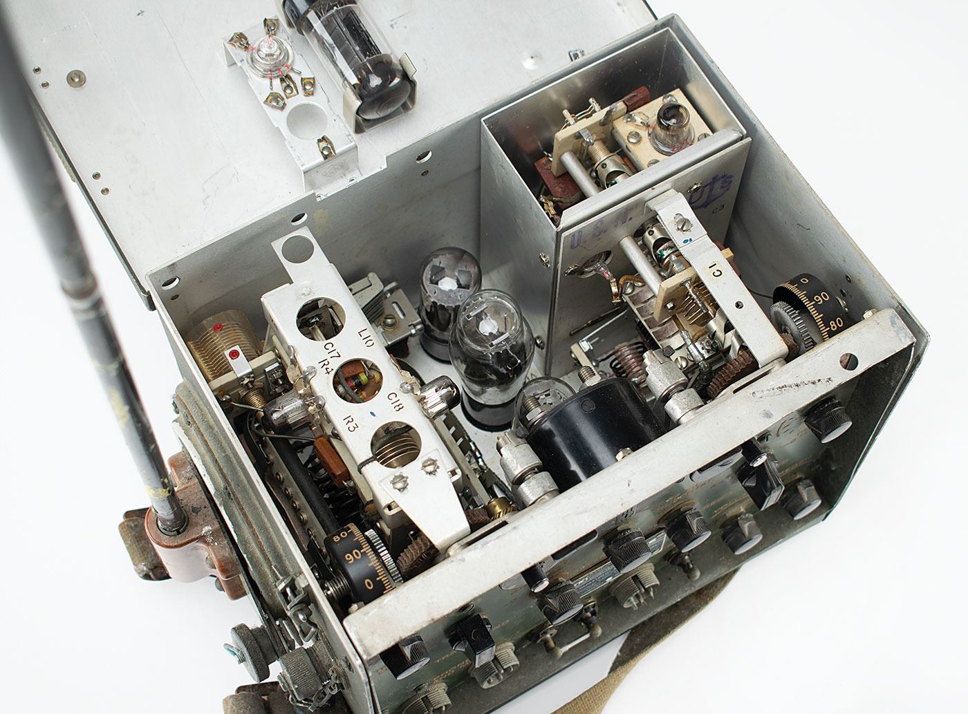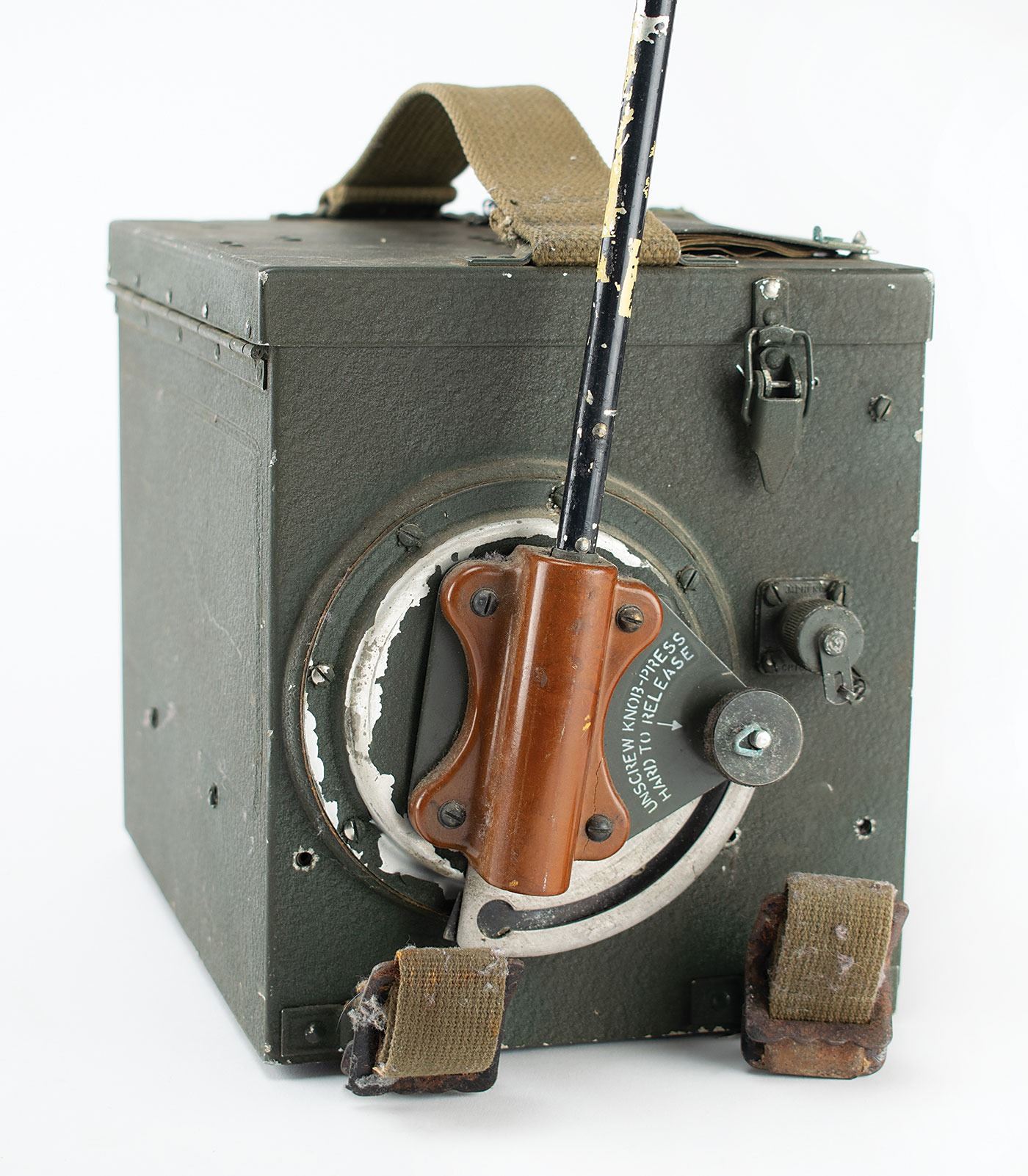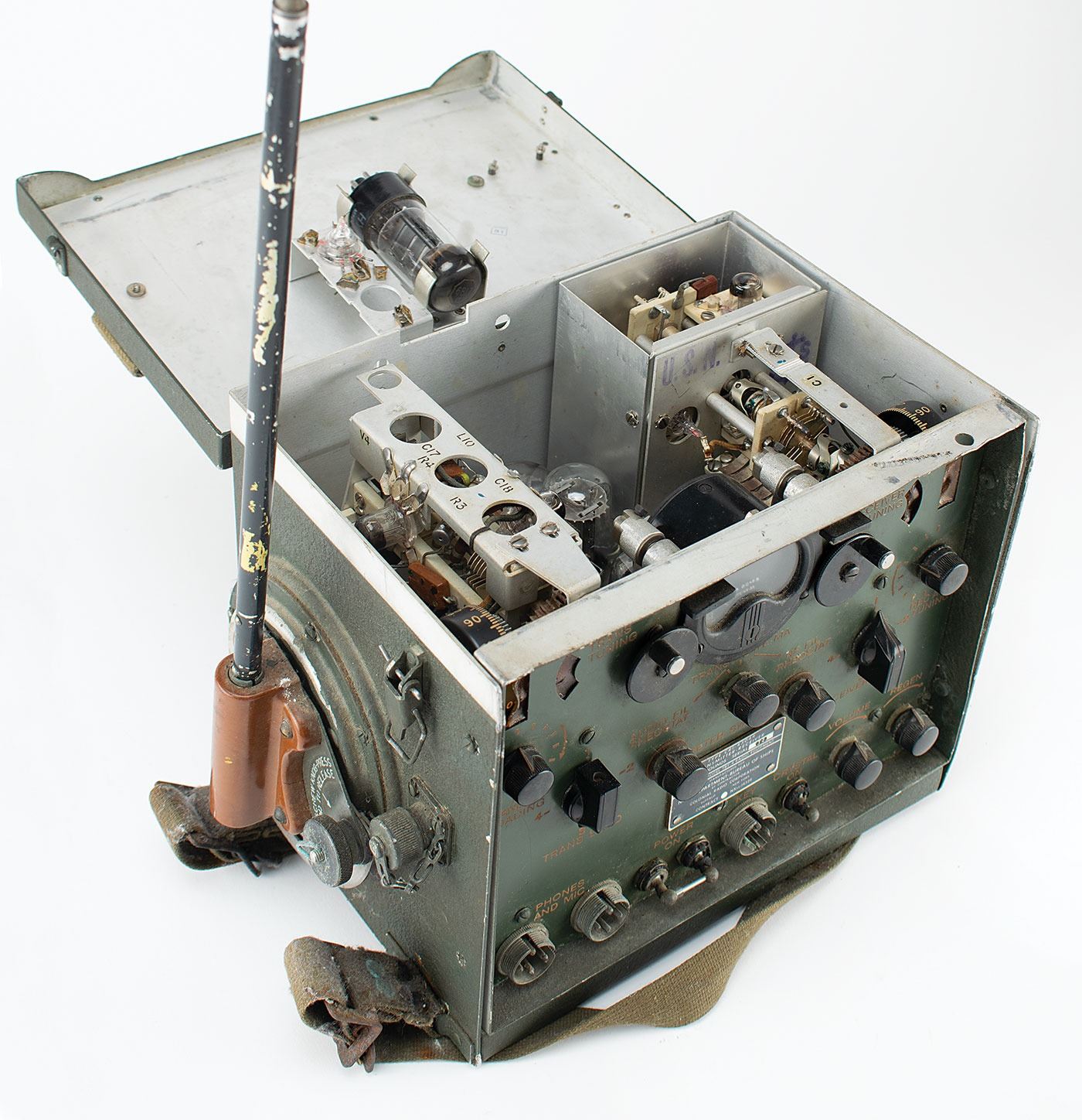 Used during World War II by the Navy and US Marines, the TBY-4 two-way radio was famously utilized by Navajo Code Talkers to send and receive secret messages. World War II–era radio transmitter/receiver unit issued as part of a TBY-4 radio set, measuring approximately 10˝ x 7.5˝ x 8.25˝, bearing a Navy Department–Bureau of Ships plate on the side: "Type CRI-43044, Transmitter-Receiver, 33.4 Pounds, Serial 263." Includes an eight-segment antenna. This was the primary component of the TBY-4 two-way radio set, which also included a power unit, headset, and bag. In very good to fine condition.