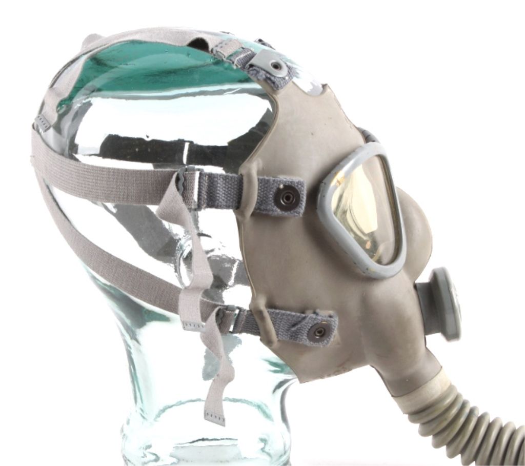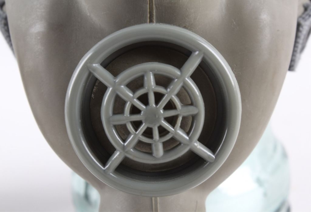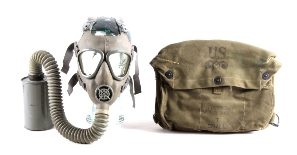 This is an original World War II United States Army Lightweight Service Mask. This is the M3 gas mask and is believed to be complete with the canvas Service Mask bag. The mask is marked '42 and the canteen is marked US M10A1 and comes with the Anti-Dim Cloth Can with Cloth. Appears to be in very good condition. (bag appears to be earlier circa 1950's)