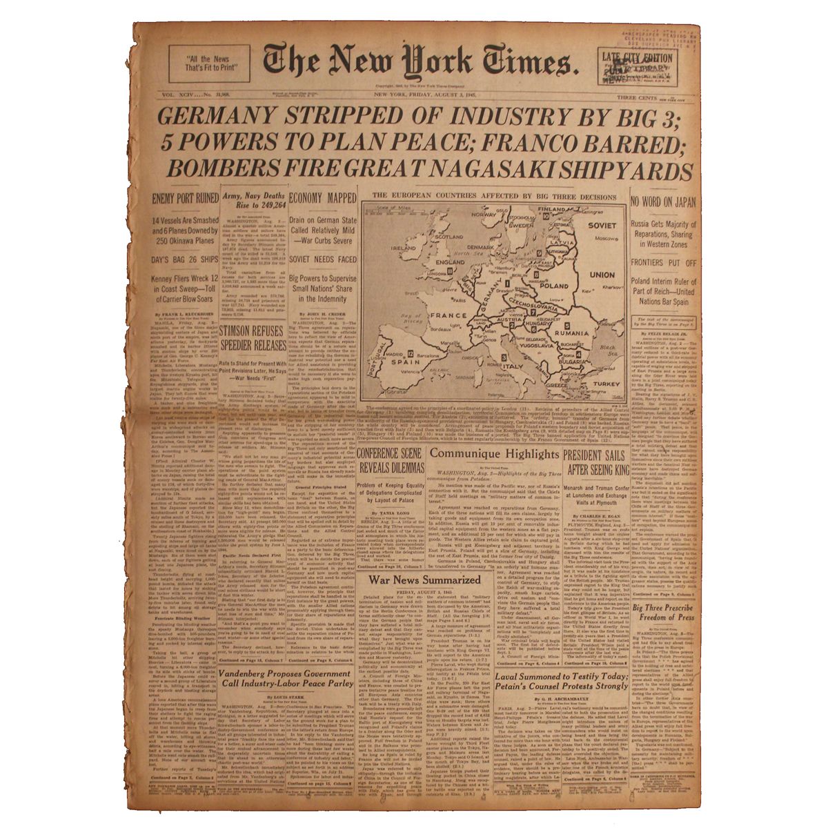 3 August 1945 issue of ''The New York Times'' announcing that Germany is ''Stripped of Industry by Big Three'', with a front page map illustrating the European countries. News from the Pacific Theatre includes ''Enemy Port Ruined'' and ''Bombers Fire Great Nagasaki Shipyards''. Photographs inside the issue depicts various bombings in Japan. The 16.5'' x 22.5'' newspaper runs 30pp. Toning throughout, chipping along folds and delivery stamp in the upper-right. Overall very good condition.