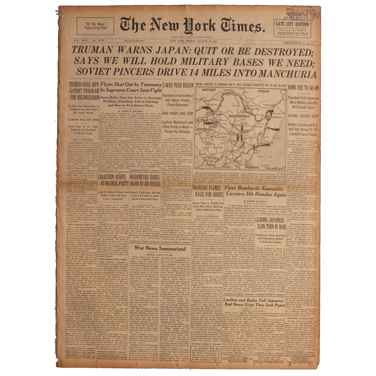 10 August 1945 issue of ''The New York Times,'' the day after the U.S. dropped the second nuclear bomb on Japan at Nagasaki. Excerpt reads, ''…Truman threatened the Japanese tonight with obliteration by atomic bombing unless they surrendered unconditionally…'' Other headlines read, ''Nagasaki Flames Rage for Hours'' and ''Bomb Use to Go On / President Tells Japanese More Military Secrets Will Punish Them''. 32pp. paper measures 16.5'' x 22.5'' unfolded and shows toning and chipping to edges, separation to left-hand fold. Very good condition.