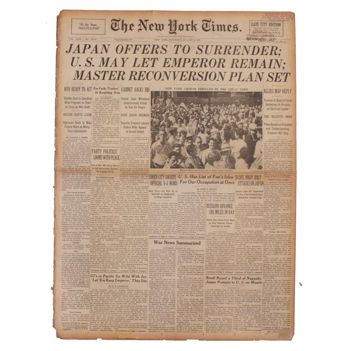11 August 1945 issue of ''The New York Times,'' with news of Japan's intention to surrender. Front page includes a photo of relieved Americans in Times Square. Articles reveal details of the surrender process and public attitudes; one headline reads, ''GI's in Pacific Go Wild With Joy 'Let 'Em Keep Emperor' They Say''. Another headline reads, ''Bomb Razed a Third of Nagasaki; Japan Protests to U.S. on Missile''. 26pp. paper measures 16.5'' x 22.5''. Chipping, toning and separation to left-hand spine. Very good condition.