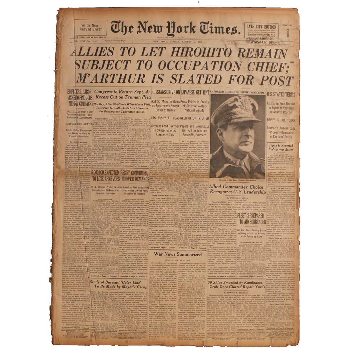 12 August 1945 edition of ''The New York Times'' with articles upon peace negotiations between the U.S. and Japan. Article reads ''…Truman, in replying…to Japan's offer of surrender and her request for a clarification of the status of the Emperor, said the ruler would be permitted to remain on the throne for the time being subject to the commander of the Allied occupation forces…'' Stories and a photo of General MacArthur also appear. Measures 16.5'' x 22.5'' and shows chipping, toning, and separation to left-hand spine. Overall very good.