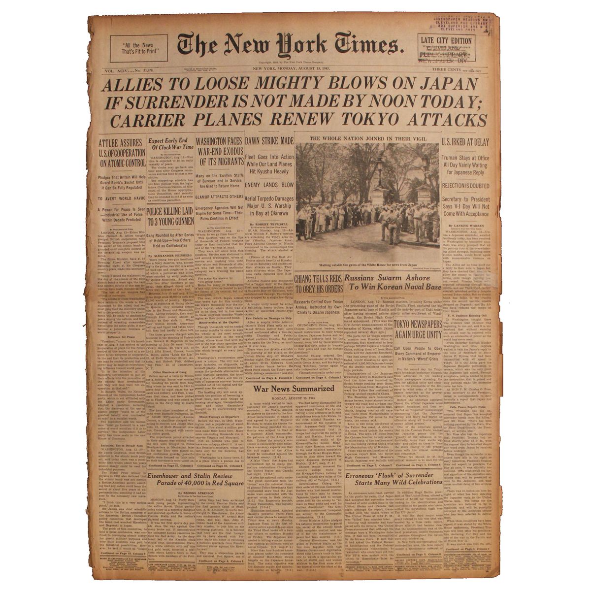 13 August 1945 issue of ''The New York Times'' with the headline ''U.S. Irked at Delay'', as the world waits for surrender news from Japan. Headlines read, ''Erroneous 'Flash' of Surrender Starts Many Wild Celebrations'' and ''Pledges That Britain Will Help Guard Bomb's Secret Until It Can be Fully Regulated''. An interesting photo shows dozens of people waiting outside the White House gates for ''news from Japan''. Front and last page only; 2pp. measures 16.5'' x 22.5''. Chipping, toning and separation to left-hand spine. Overall very good.