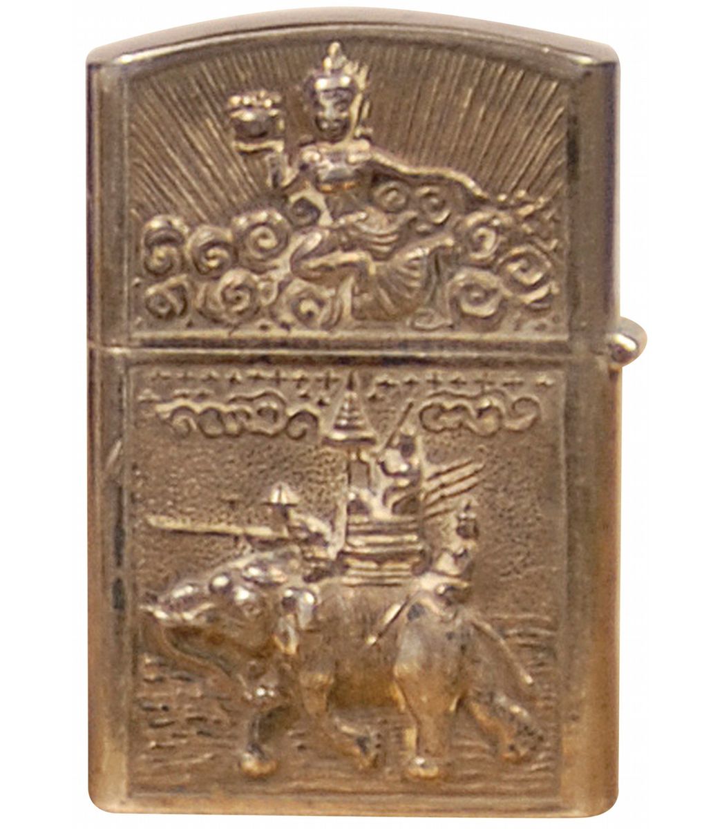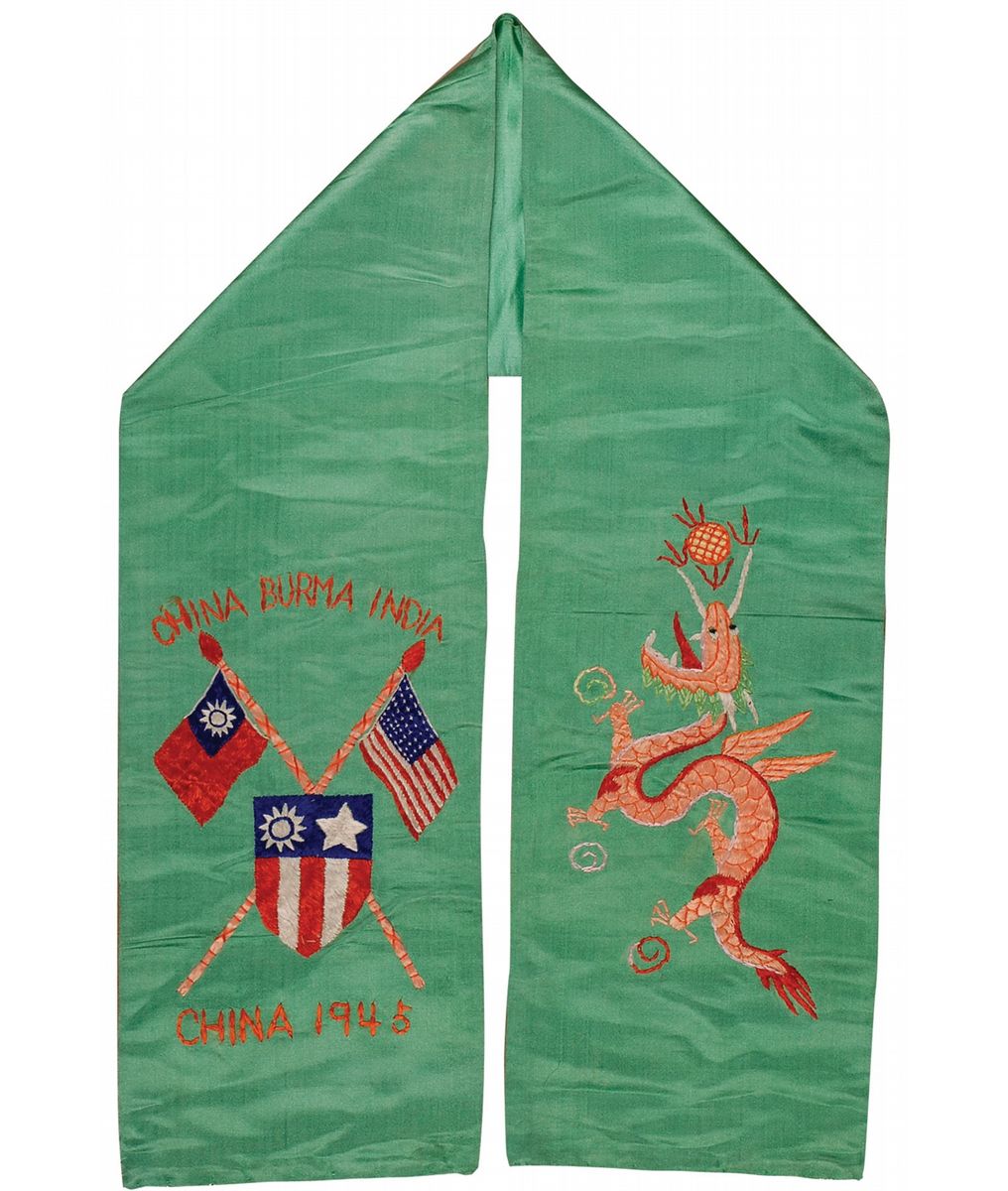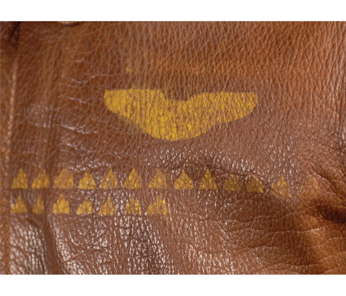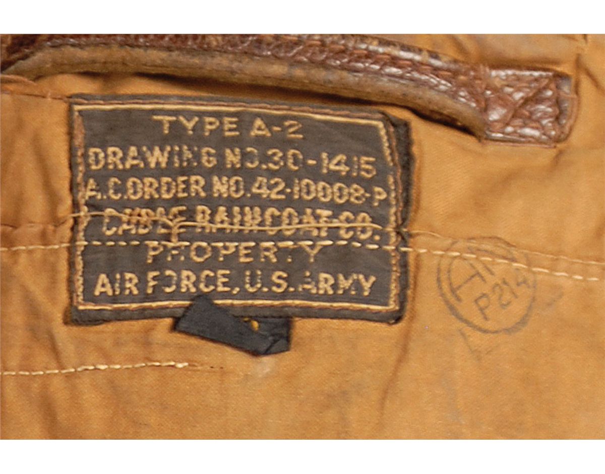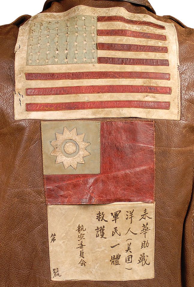 Incredibly rare and original Flying Tigers ‘Hump’ A-2 pilot’s jacket. Brown goatskin leather jacket bears a manufacturer’s label inside of collar and reads, “Type A-2, Drawing No.30-1415…Cable Raincoat Co. Property Air Force, U.S. Army,” and has knit cuffs and waistband. Left breast bears a set of painted pilot’s wings, and 20 tiny mountains or ‘humps,’ as the pilots referred to them which signify the number of missions flown over the Himalaya. Reverse of the jacket bears a 9.5 x 6.75 red, white, and blue Indian-made American ‘escape’ flag as well as a 6.25 x 4.5 leather blood chit, with translations in Thai and Chinese. In very good condition, with expected age wear, light crazing, discoloration and distress to leather, one stripe from flag on the back partially separated, scattered soiling and crazing to leather patches, and some small pulls and holes to cuffs and waistband. Accompanied by a colorful embroidered 43? long silk pilot scarf from the CBI, as well as several other items, including: a non-working flip-top lighter, with relief engravings of an elephant and several deities; a printed pamphlet entitled ‘Our Chinese Ally’; a newspaper page from the August 15, 1945, San Francisco Chronicle showing the celebration in the streets; and a couple of other booklets. ‘Hump’ pilots were perhaps even more skilled than fighter pilots, as any flight in heavily laden aircraft over the mountain range required an exceptional skill set. Very difficult to find in their original untampered form.