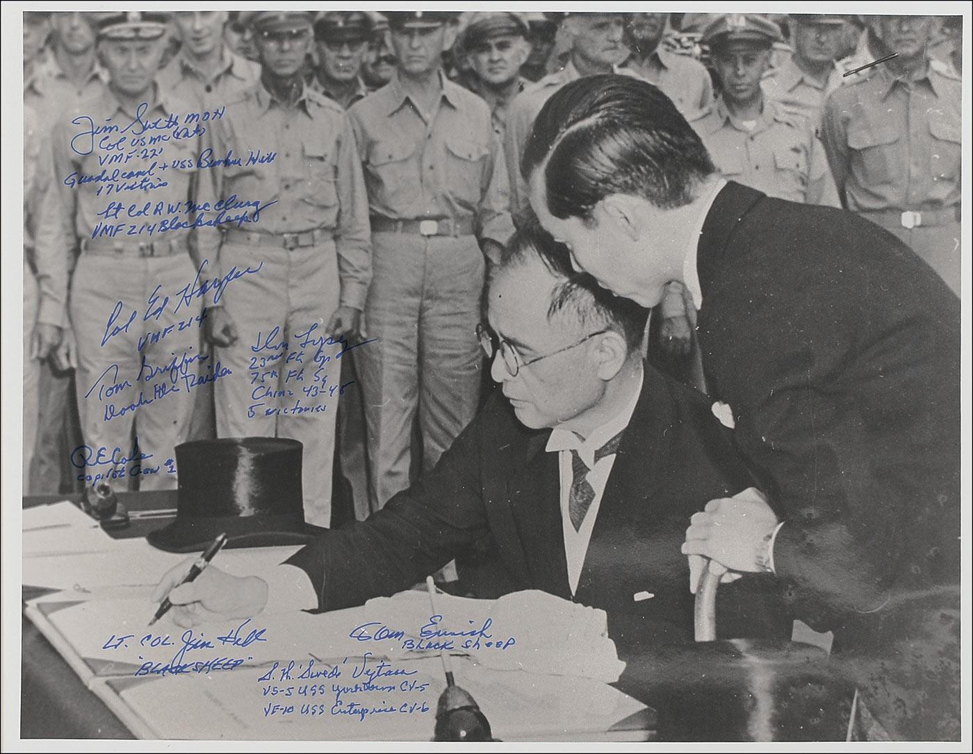 Glossy 14 x 11 photo of Japanese Foreign Minister Mamoru Shigemitsu signing his country’s surrender onboard the USS Missouri to officially end World War II on September 2, 1945, signed in blue felt tip by nine aviators. Signers are: Jim Swett, R. W. McClurg, Ed Harper, Tom Griffin, Don Lopez, R. E. Cole, Jim Hill, Tom Emrich, and S. W. ‘Swede’ Vejtasa. Each pilot has added a notation regarding his assignment during the war. In fine condition.