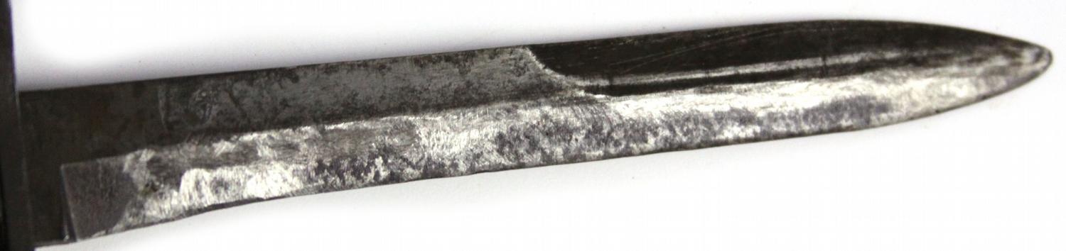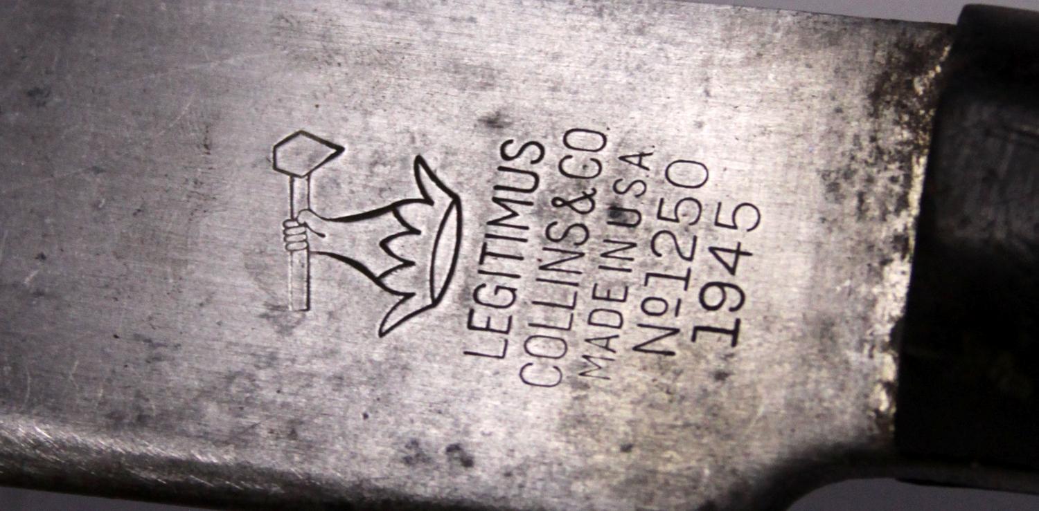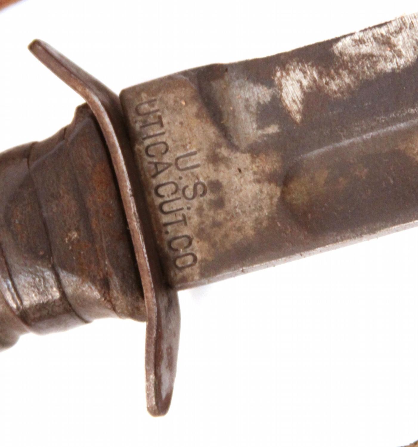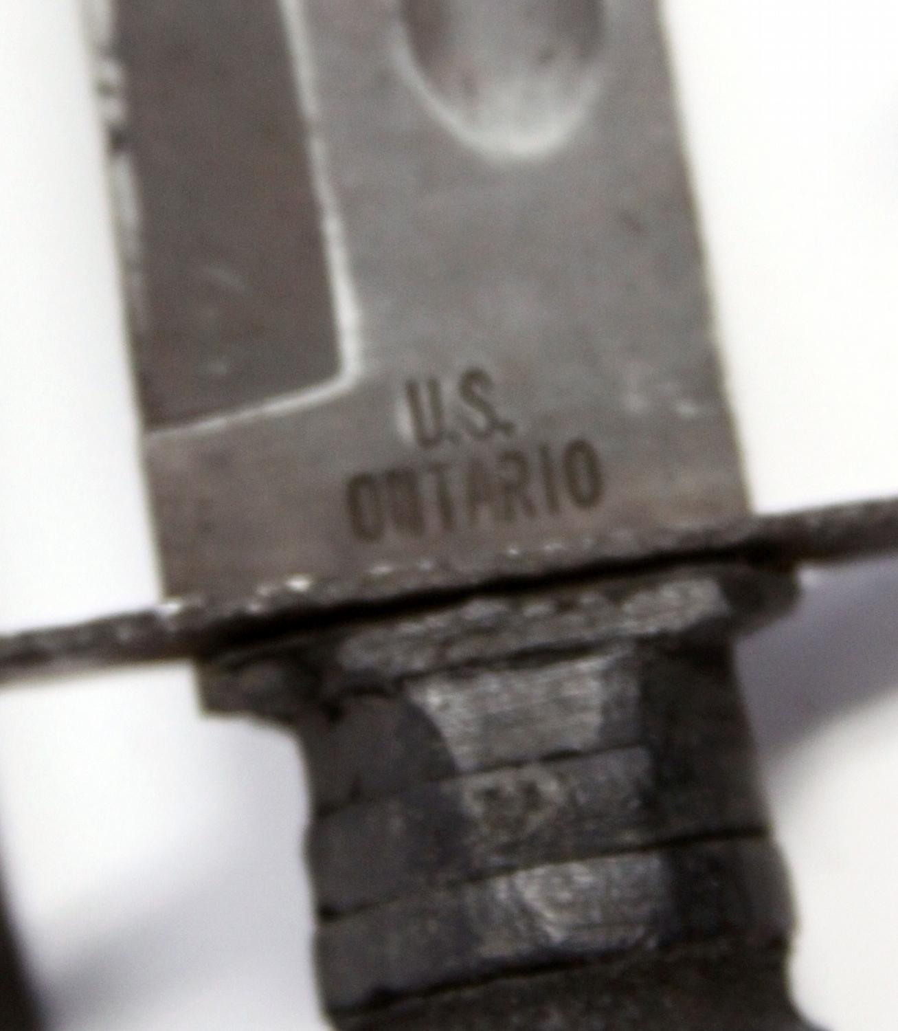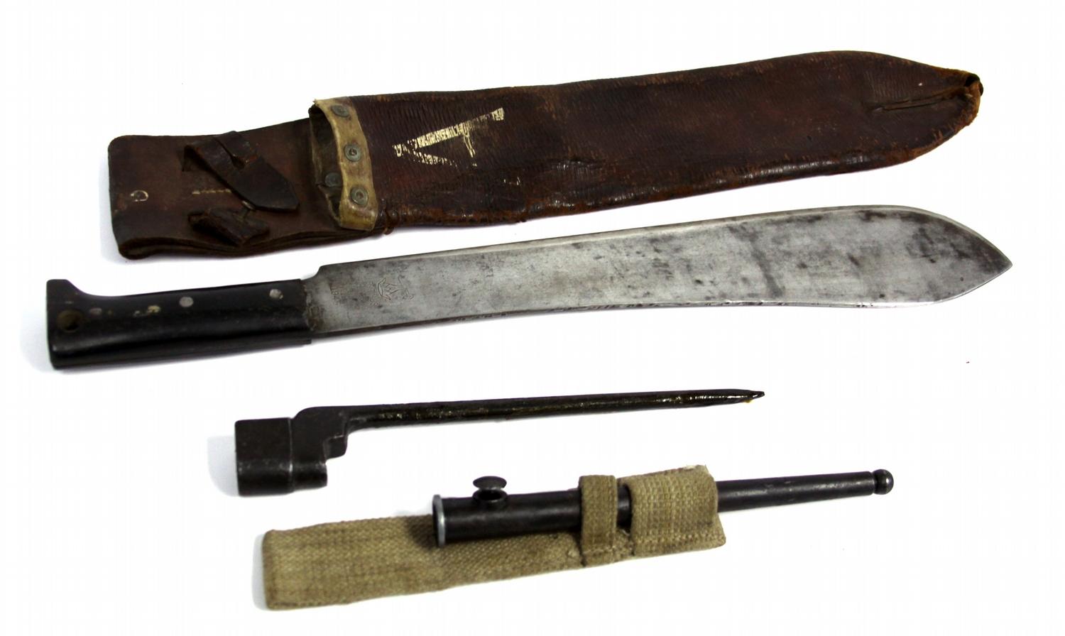 Grouping includes: two KA BAR fighting knifes from WWII, one is marked U.S. Utica Cut Co. on, leather sheath is marked USMC KA-BAR, both sheath and blade are in good condition. Second is a paratrooper fighting knife marked U.S. Ontario on blade leather sheath has no markings and both are in good condition. One US WWII M4 bayonet for M-1 Carbine with scabbard marked V.P. 39 on back, overall good condition with blade showing some use. One WWII British Enfield 303 Mark II #4 spike bayonet complete with holster appearing marked as CA1244 CA825, overall good condition. WWII army machete class A blade is marked Legitimus Collins & Co. Made in USA, No 1250 1945. Overall good condition wit normal wear from use. M-1 postwar bayonet hardly used in very good condition V.P. 33 marked on back of scabbard and 89 on the front.