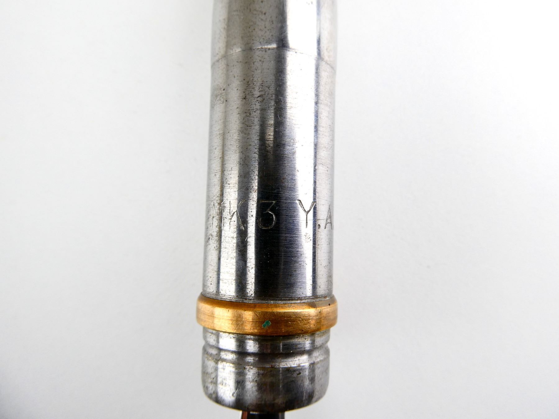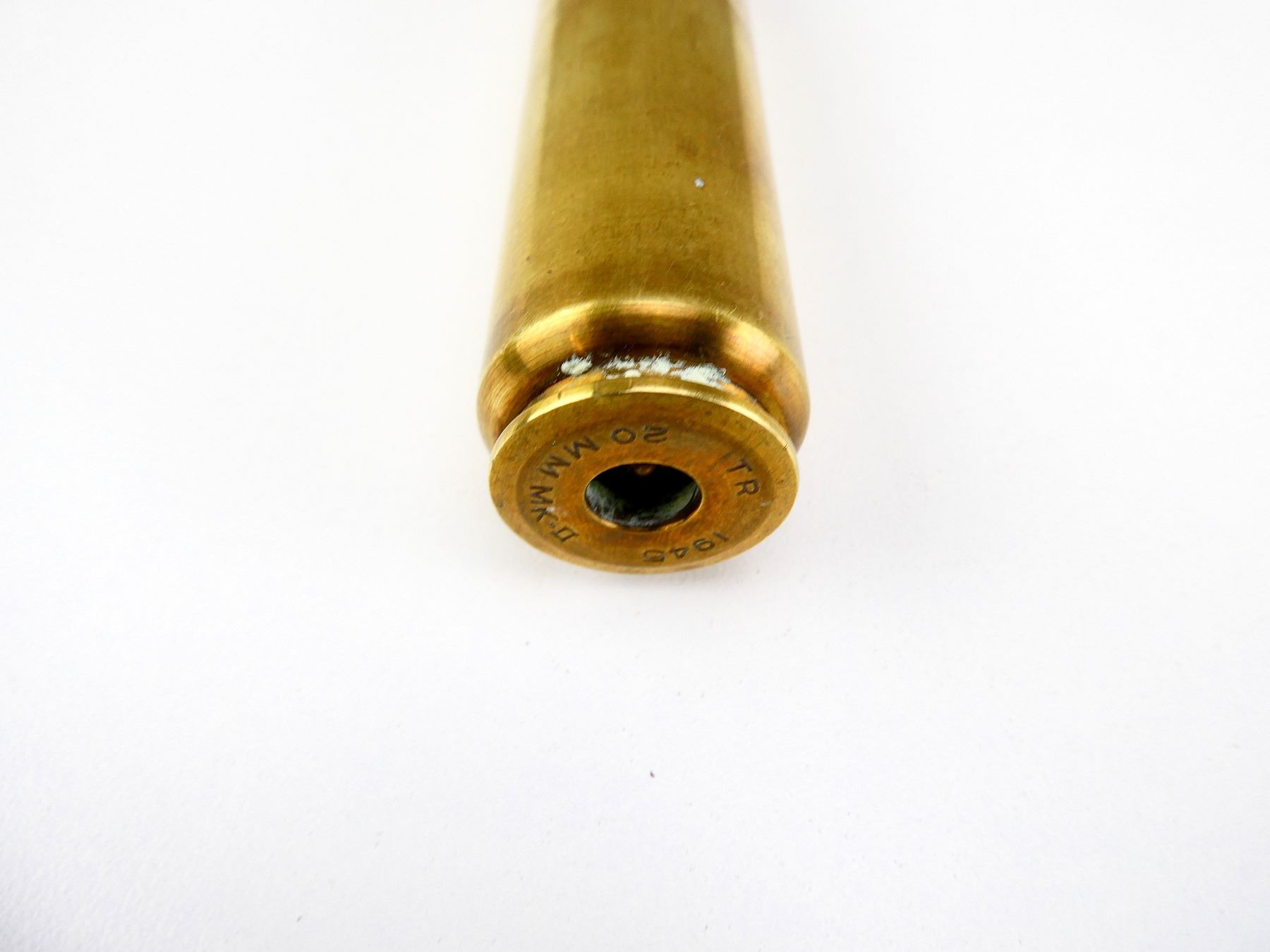 (1) BRASS CASING, STEEL PROJECTILE, NO PRIMER, COPPER DRIVING BAND, PROJECTILE MARKED: "MK3 Y.A.", PROJECTILE PULLS OUT OF CASING AND HAS THIN STRAIGHT BLADE ATTACHED, CASING BOTTOM MARKED: "TR 1945, 20MM MKII", APPROX. 7/8" DIA., CASING WITH PROJECTILE ATTACHED OAL APPROX. 7 1/8", BLADE APPROX. 3 1/8" & PROJECTILE WITH BLADE OAL APPROX. 6 3/8". SEE PHOTOS.