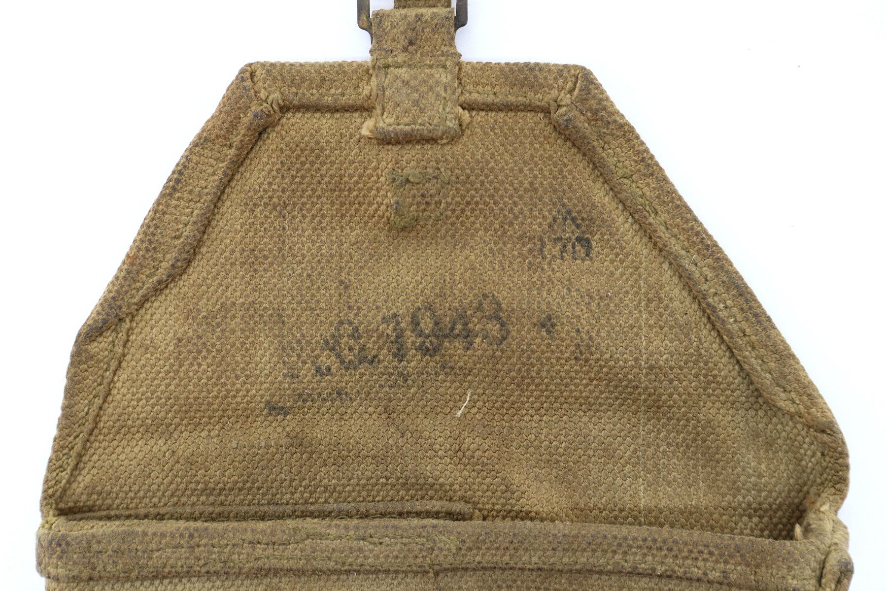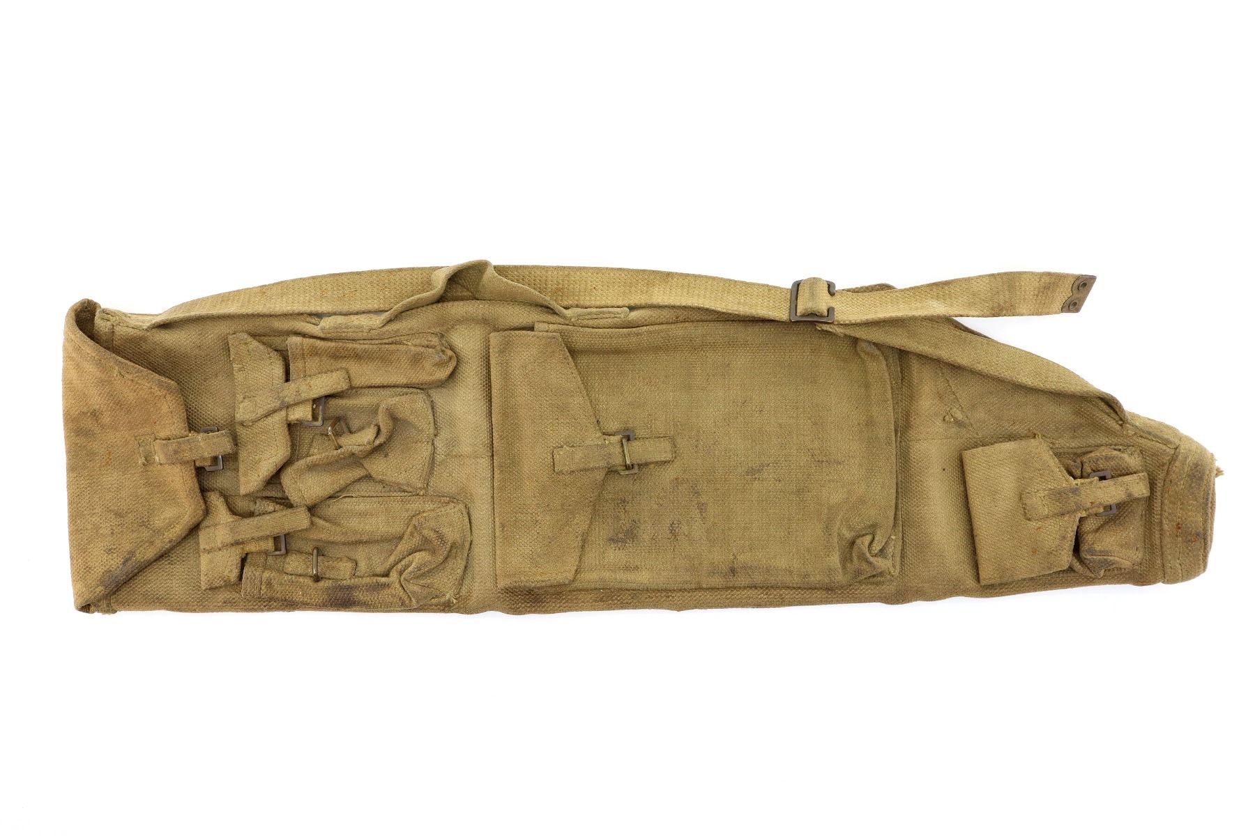(1) FITS .303 BR LMG BARRELS, GUNNER'S KIT, OILER, ETC., TAN P37 WEB CANVAS WITH BRASS FITTINGS & SHOULDER STRAP, MARKED: ".C., 1943", BROAD ARROW OVER "?70", CANVAS CARRY HANDLE, SHOWS AGE / WEAR, APPROX. 7.5" W & OAL APPROX. 27.25". SEE PHOTOS.