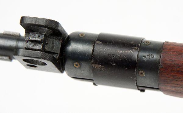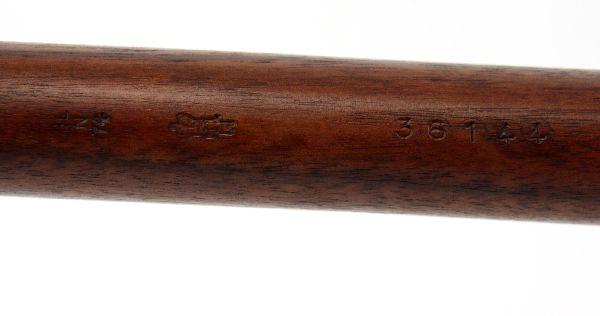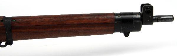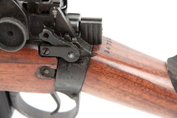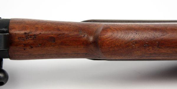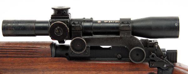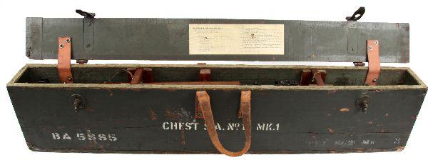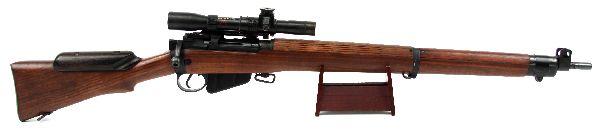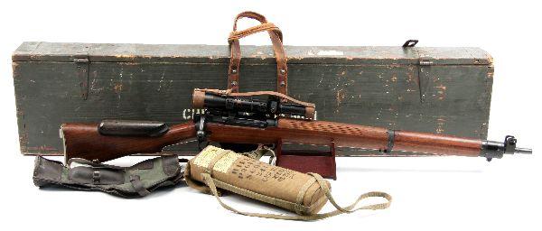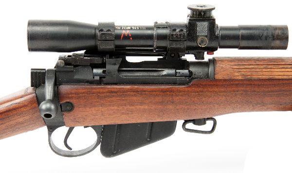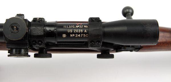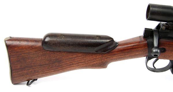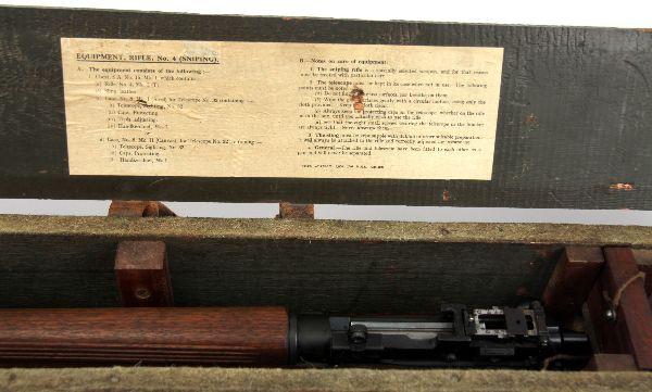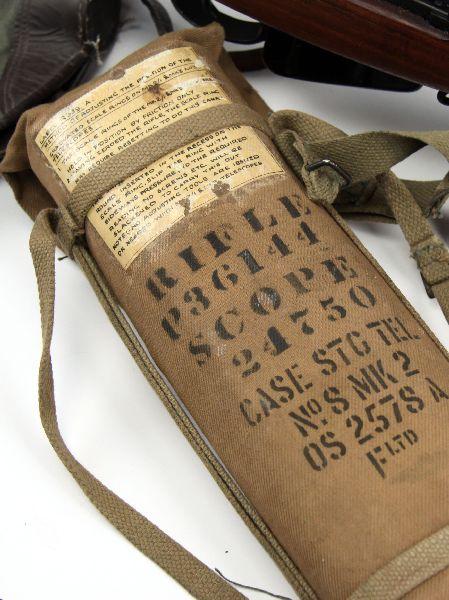 WWII era Enfield .303 sniper rifle with scope. Rifle and scope are in OD green fitted wooden crate, complete with instructions for care of rifle, cover for scope, and case for scope. Crate is marked "Chest S.A. No 15 MK.1" and "BA5885" on both sides. Scope is marked "TEL.STG.No32 Mk / 0S 2039 A. / No24750" , with a red "W" painted on top. Scope case is marked "RIFLE / P36144 / SCOPE / 24750 / CASE STG TEL / No. S MK 2 / OS 2578 A / Fltd", with complete instructions on case. Rifle marked on left side of rear band "M 47 C / 1944 / P36144 / TR". Stock marked with a crown over "27", and "SL / N / 74" just behind trigger guard, and the same mark, with a crown over "H1" near on bottom in back of front barrel band. proof mark and "ENGLAND" stamped on right of receiver. "S126" marked on front and middle bands. Bore is bright and, and stock and finish are 98%. Crate has typical wear on outside, but original leather handles are intact, and all parts and blocks on inside are present. Crate is in very good condition, rifle and scope are overall excellent condition. snP36144 Caliber: .303 Serial #: P36144