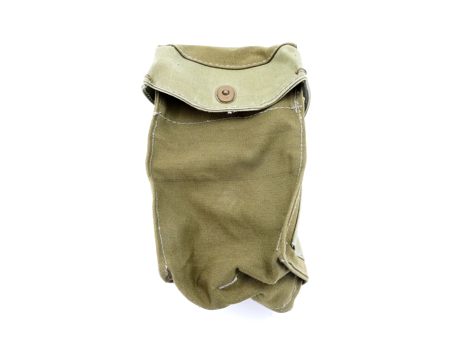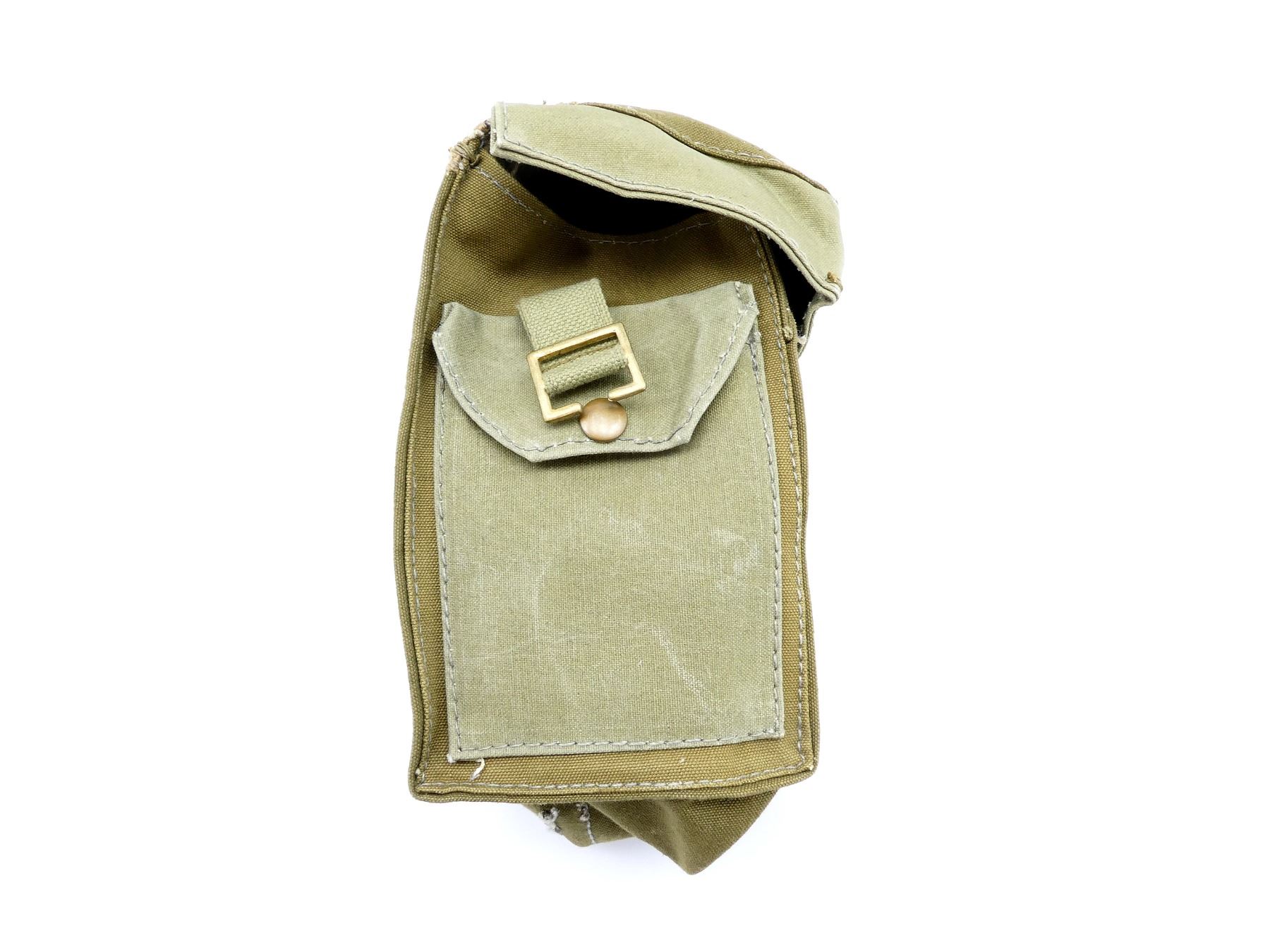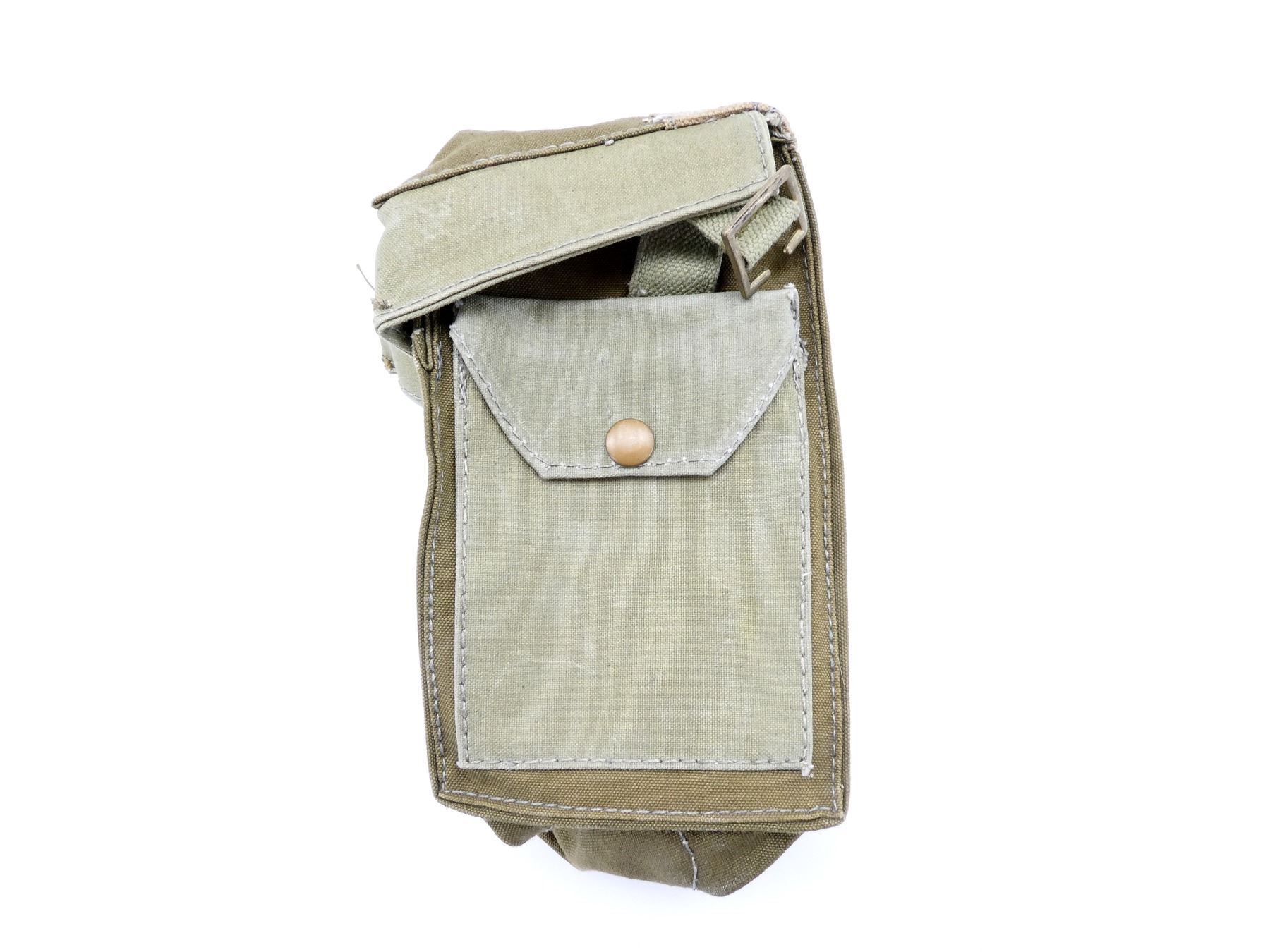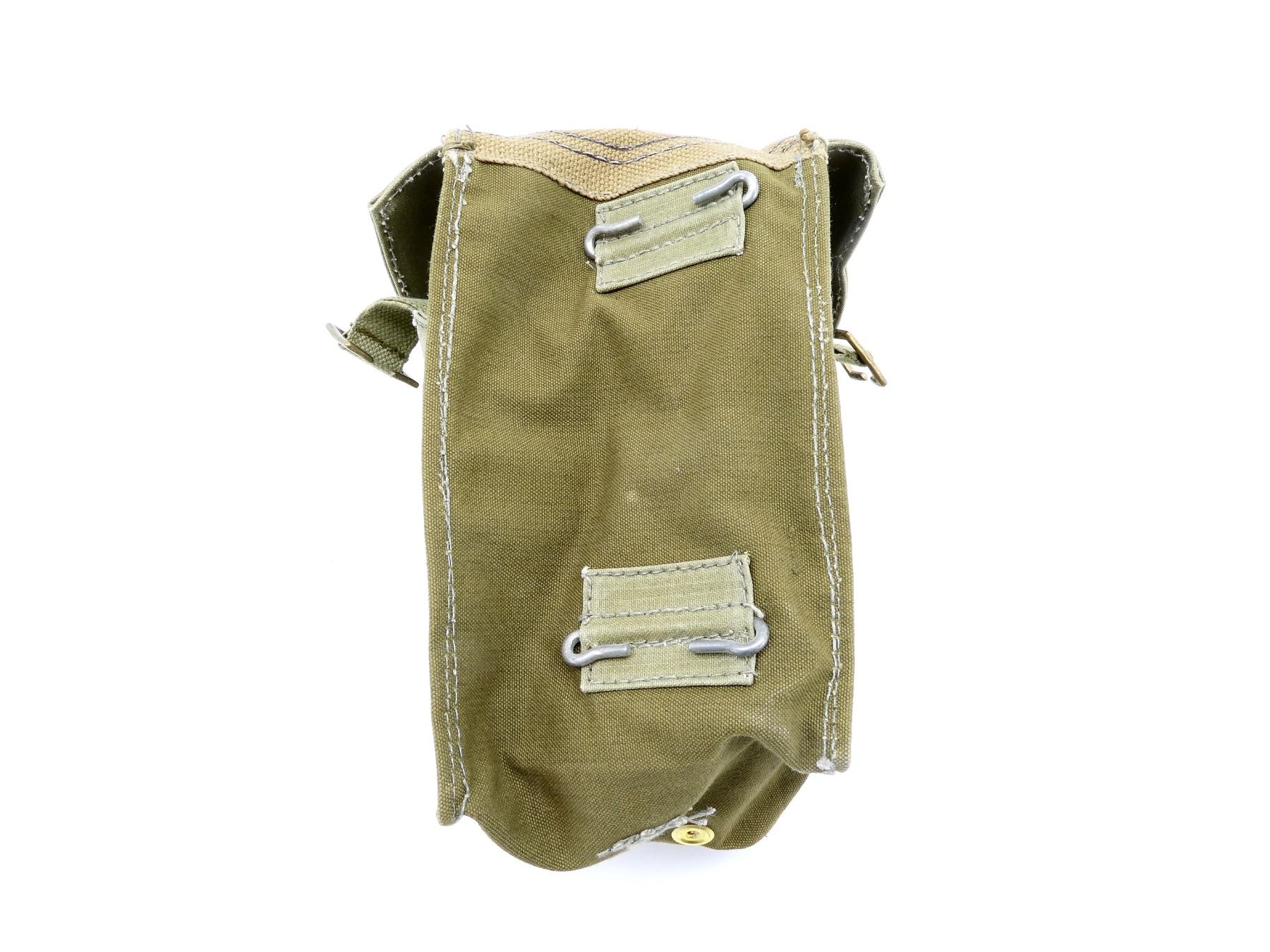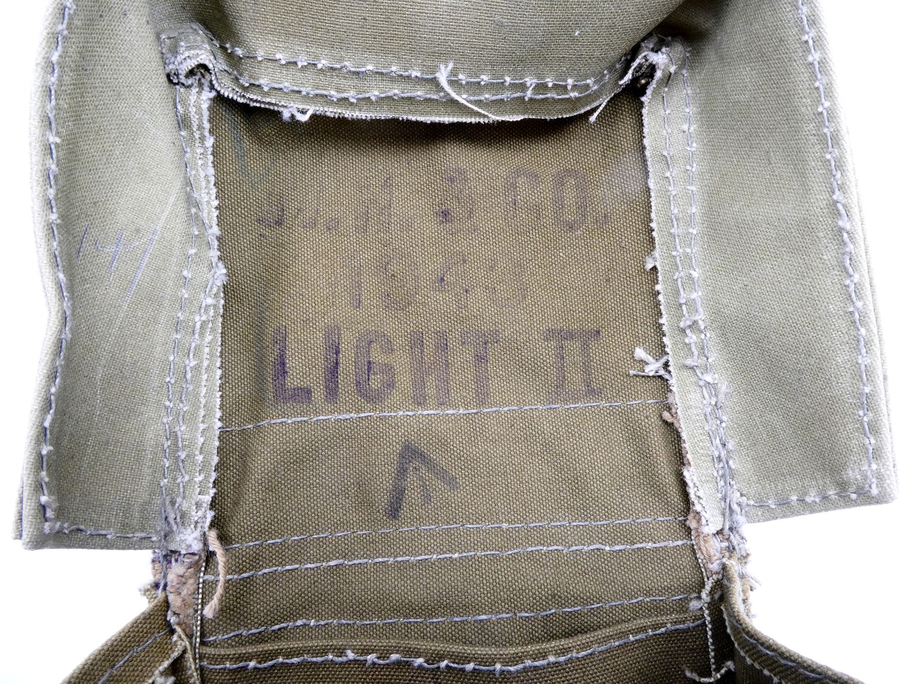 (1) GREEN CANVAS GAS MASK BAG, MARKED: "M.H. & CO., 1943, LIGHT II" WITH BROAD ARROW, SHOULDER STRAP IN BAG, TWO BELT HOOKS. SEE PHOTOS.