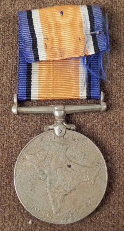WWII BRITISH INDIA DEFENSE MEDAL & RIBBON-1939-1945--1 3/8" * * LARGE BRITISH WWII DEFENSE MEDAL-FRONT HAS KING GEORGE VI--REVERSE SHAOW MAP OF INDIA IN RELIEF & READS "INDIA-1939-45" -BLUE BLACK WHITE & GOLD RIBBON *