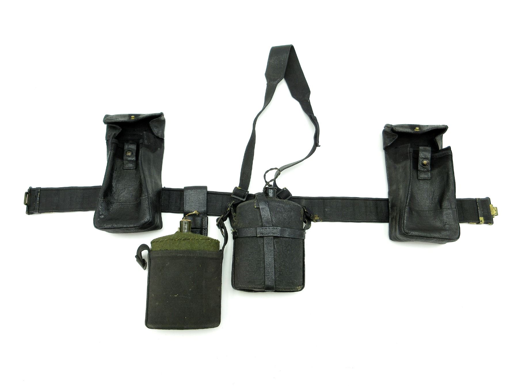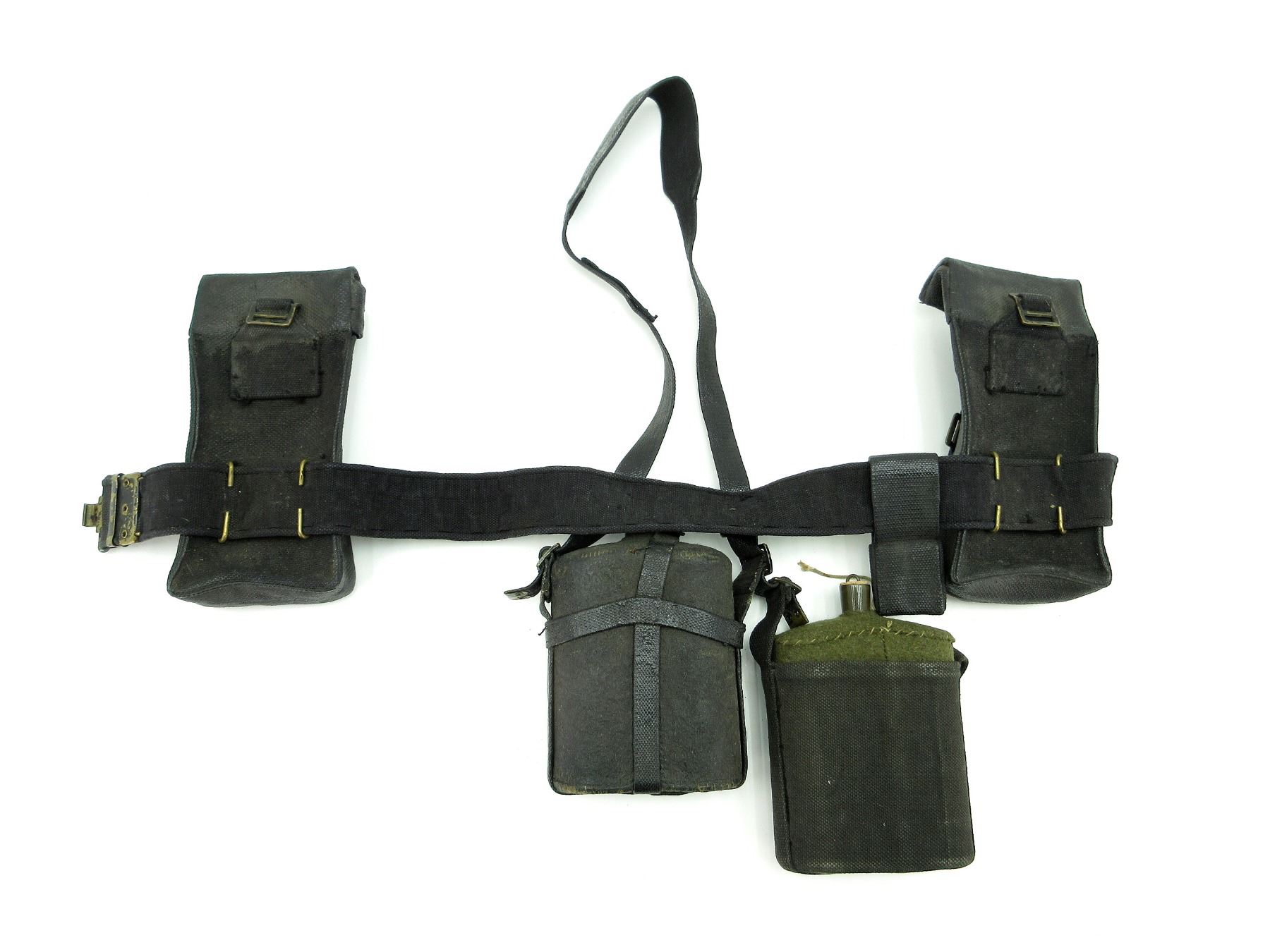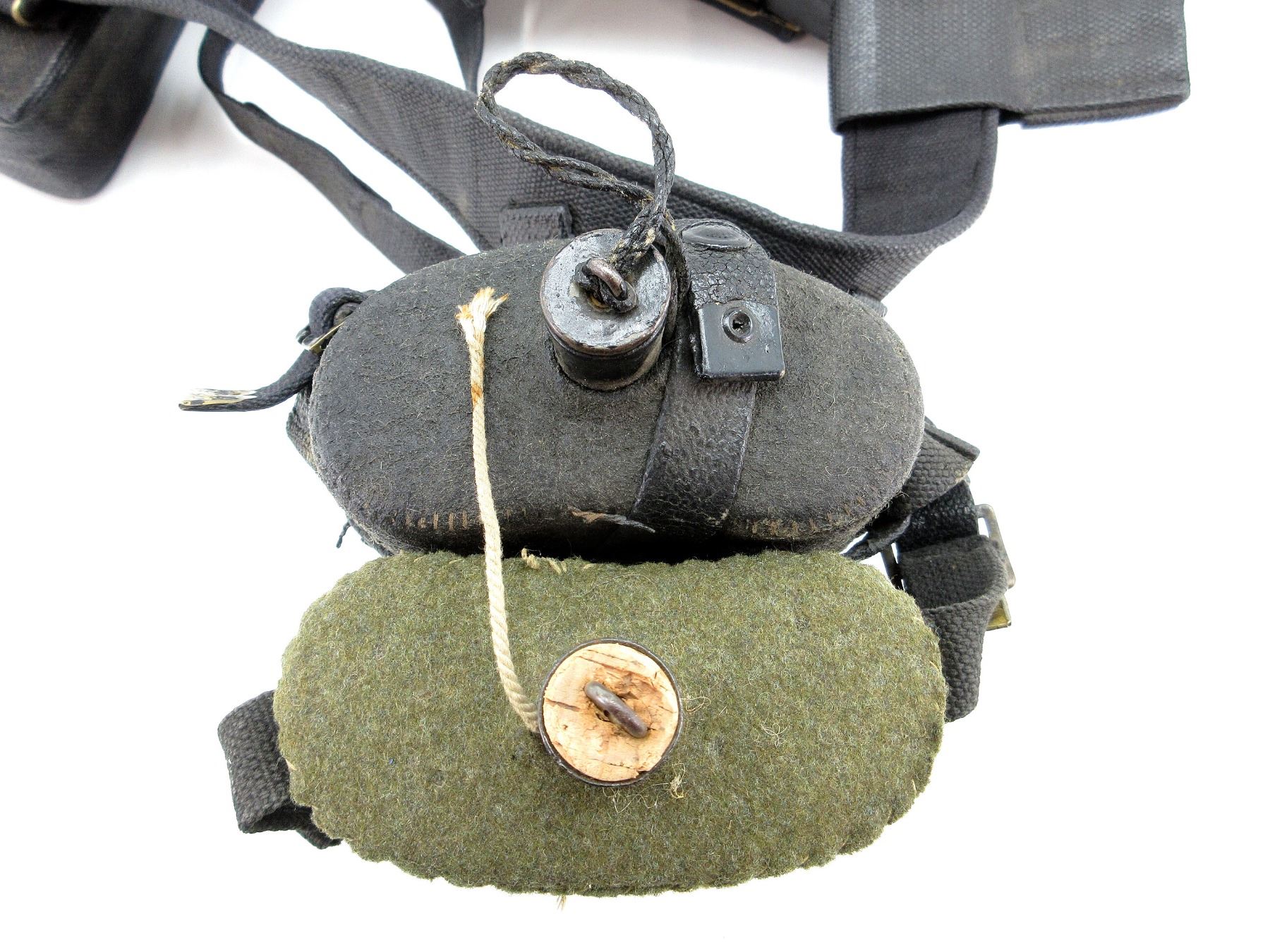 LOT INCLUDES: (1) BLACK PAINTED P37 WEBBING BELT W/ BRASS FITTINGS & BLACK PAINTED SHOULDER STRAP, NO VISIBLE MARKINGS, OAL APPROX. 42", (2) BLACK PAINTED P37 WEB BASIC POUCHES WITH BRASS FITTINGS, NO VISIBLE MARKINGS, (1) GREEN ENAMELED FELT-COVERED CANTEEN WITH CORK, BLACK PAINTED P37 WEB CARRIER, (1) BLACK PAINTED ENAMELED FELT-COVERED CANTEEN WITH CORK, BLACK PAINTED P37 WEB SKELETON CARRIER. SEE PHOTOS.