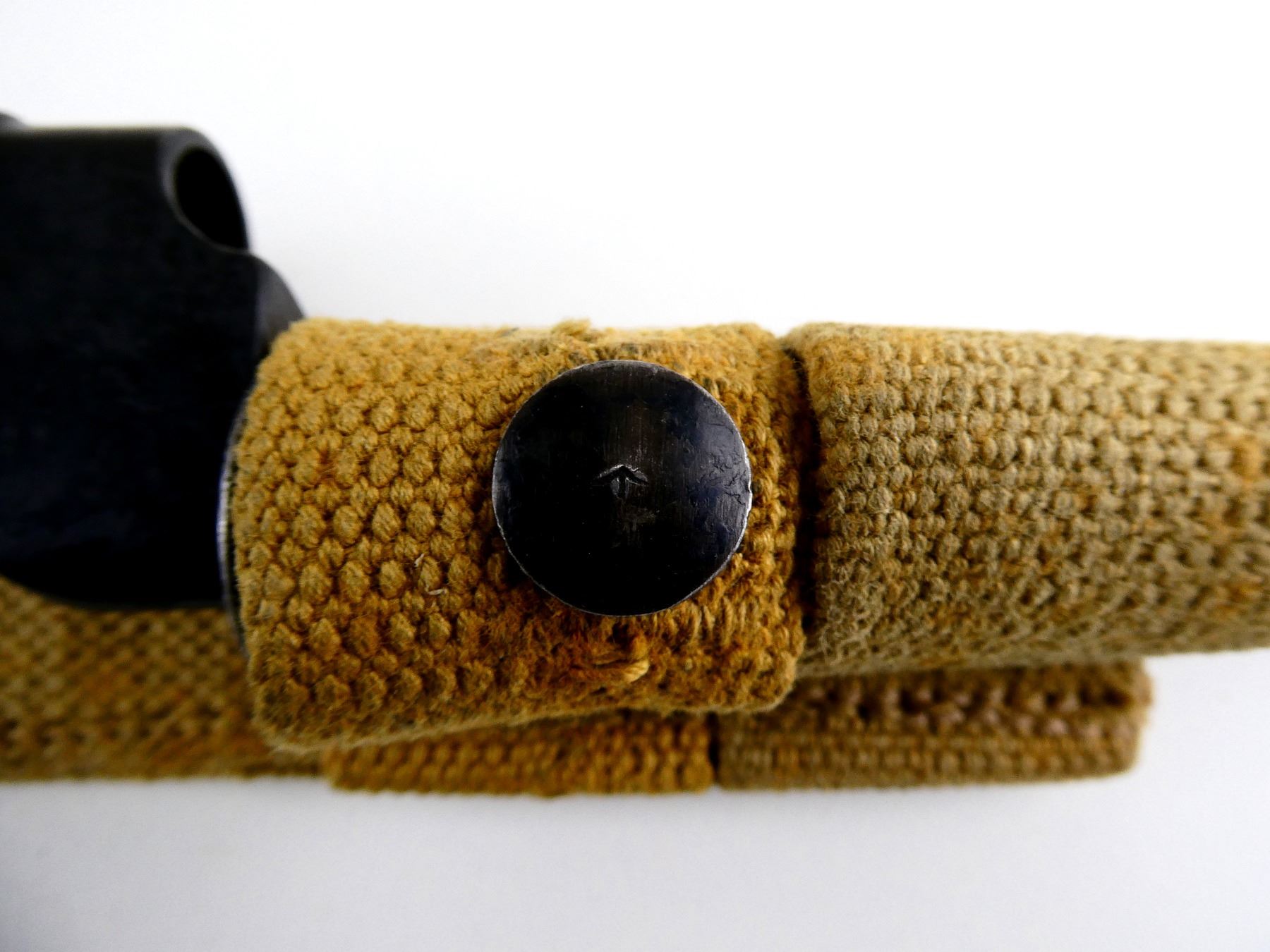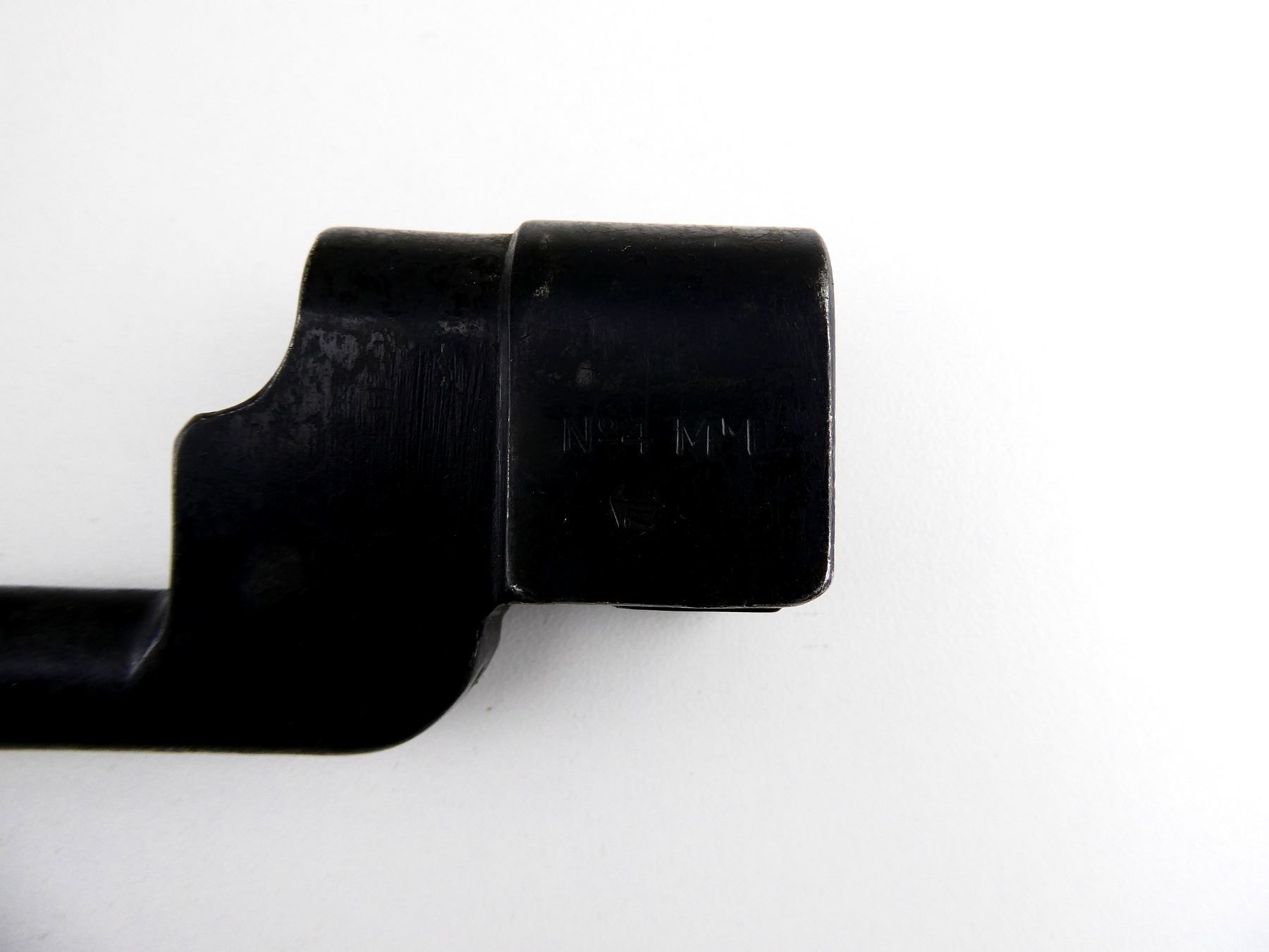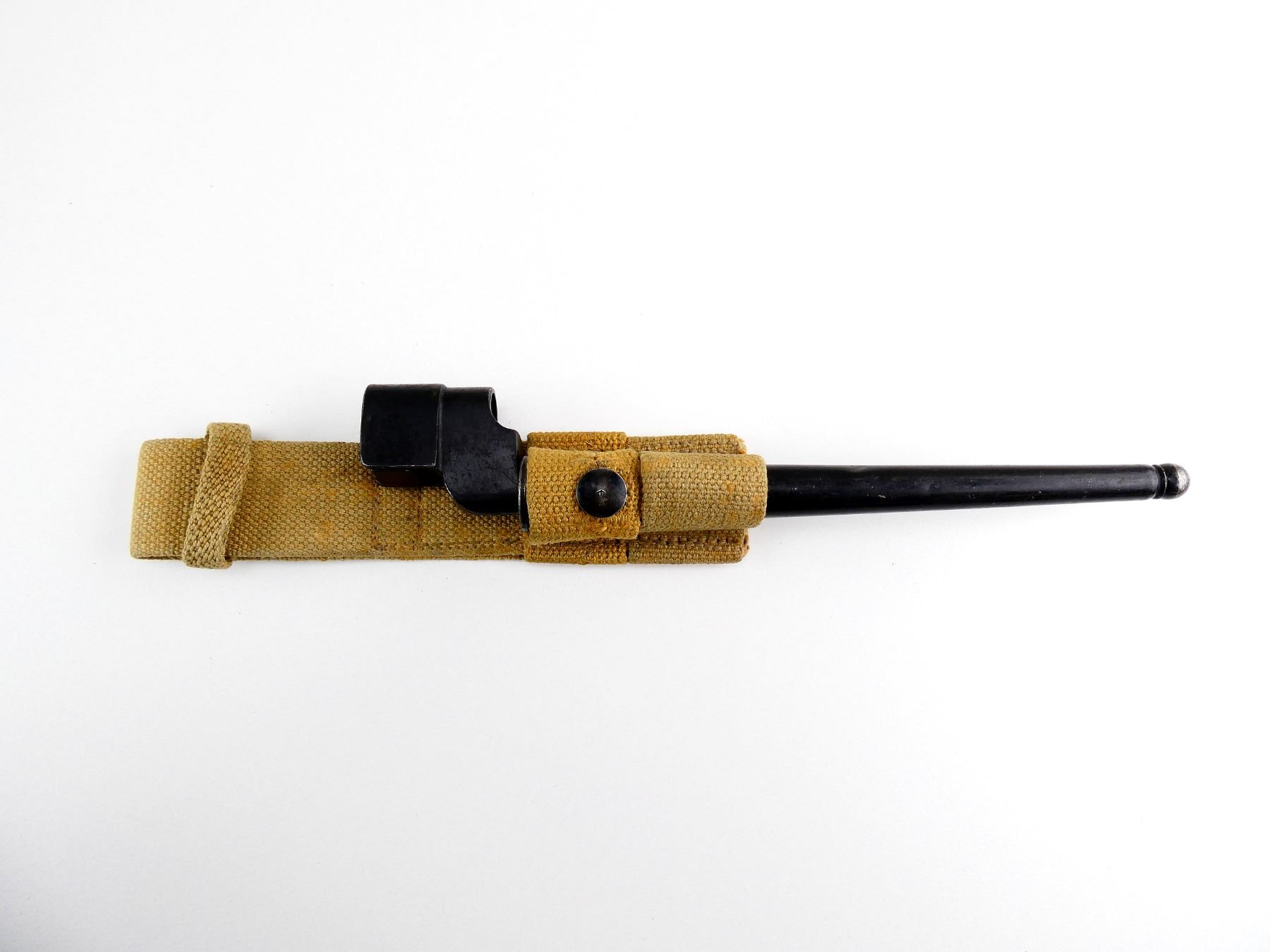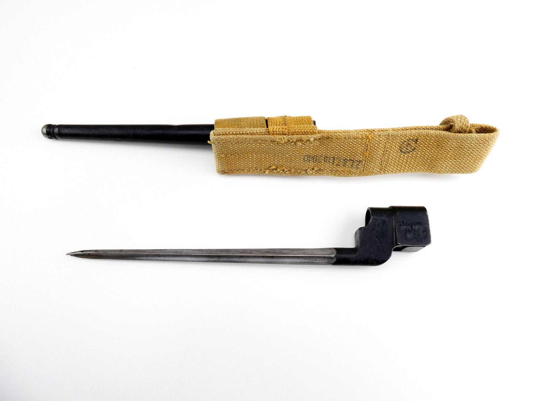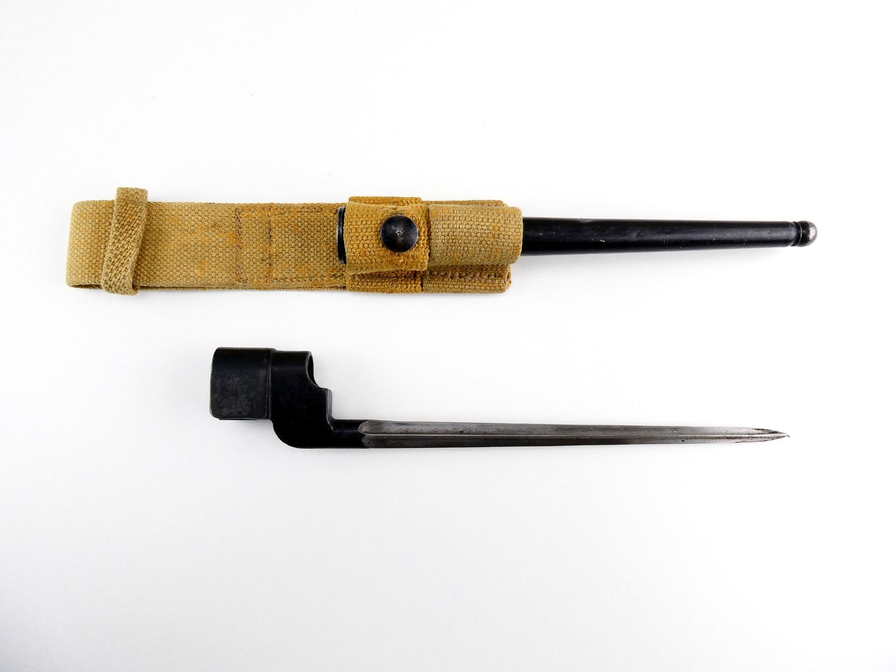 (1) FITS LEE ENFIELD NO.4 MKI & MKII RIFLES, SOCKET MARKED: "NO4 MKI" OVER PROOF MARK & "N67", METAL MK. I SCABBARD WITH TAN P37 WEB CANVAS FROG, THROAT MARKED: "NO. 4 MK1", BROAD ARROW ON STUD, FROG MARKED: "Z.L.&T. LTD. 1940" WITH C-BROAD ARROW, BLADE APPROX. 8 1/8", OAL APPROX. 10". SEE PHOTOS.