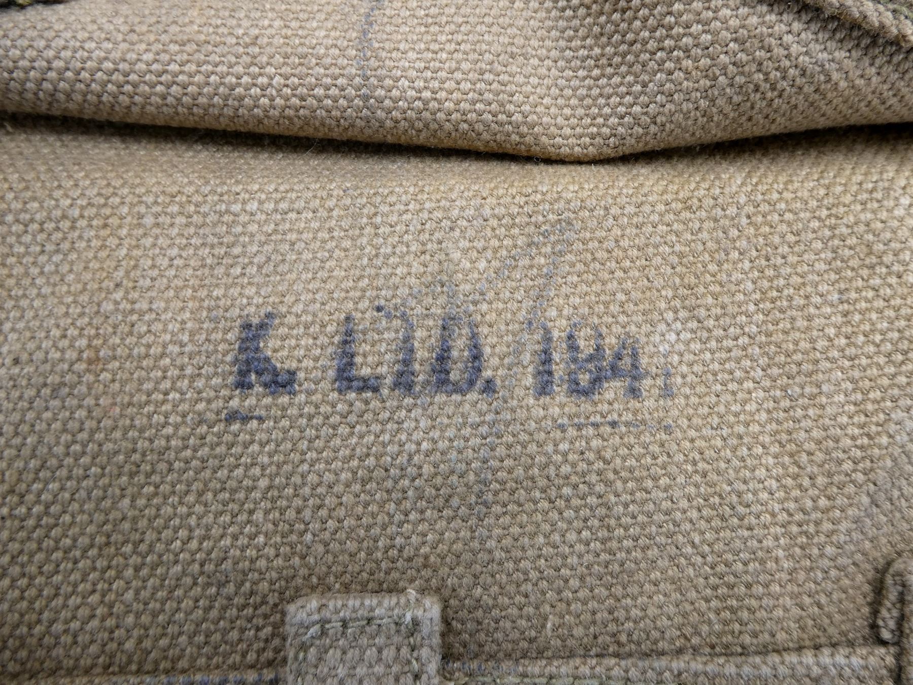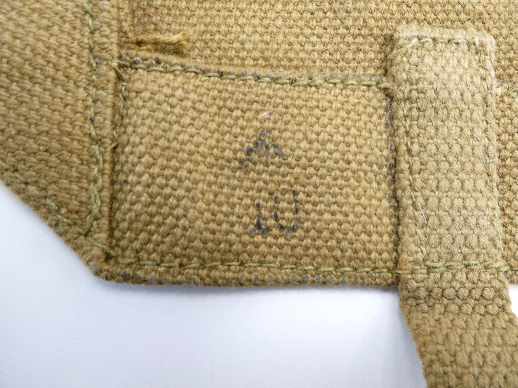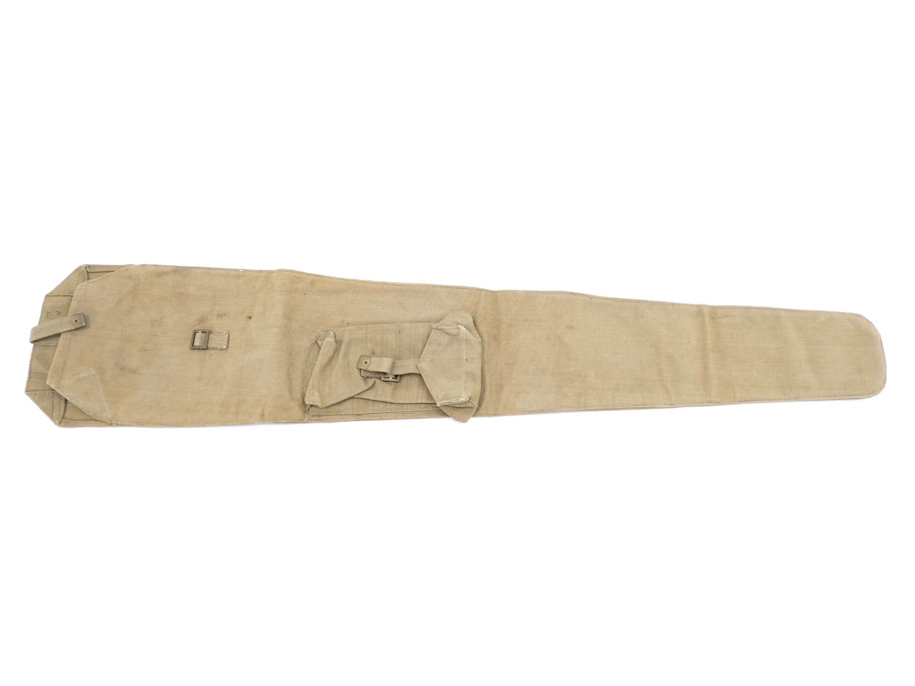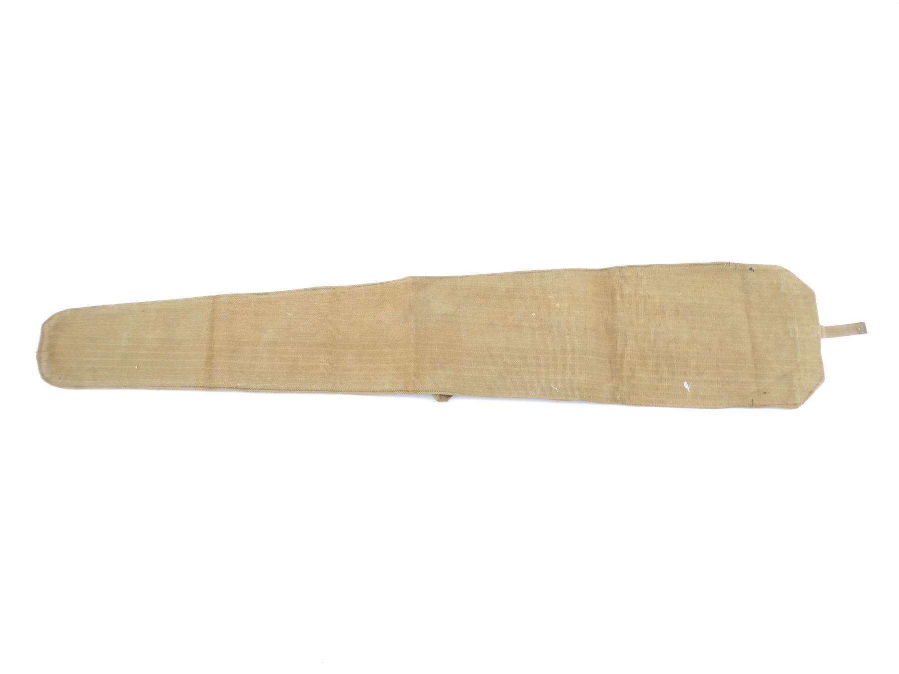 (1) FITS LEE ENFIELD RIFLES, TAN P37 WEB CANVAS RIFLE CASE WITH BRASS FITTINGS, MARKED: "K. 194?", BROAD ARROW OVER "10" & OAL APPROX. 47.5". SEE PHOTOS.