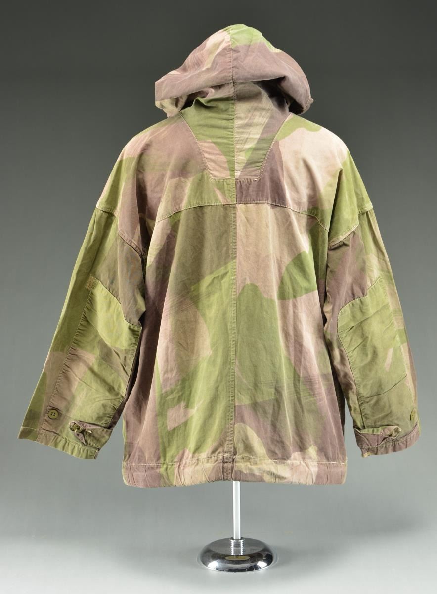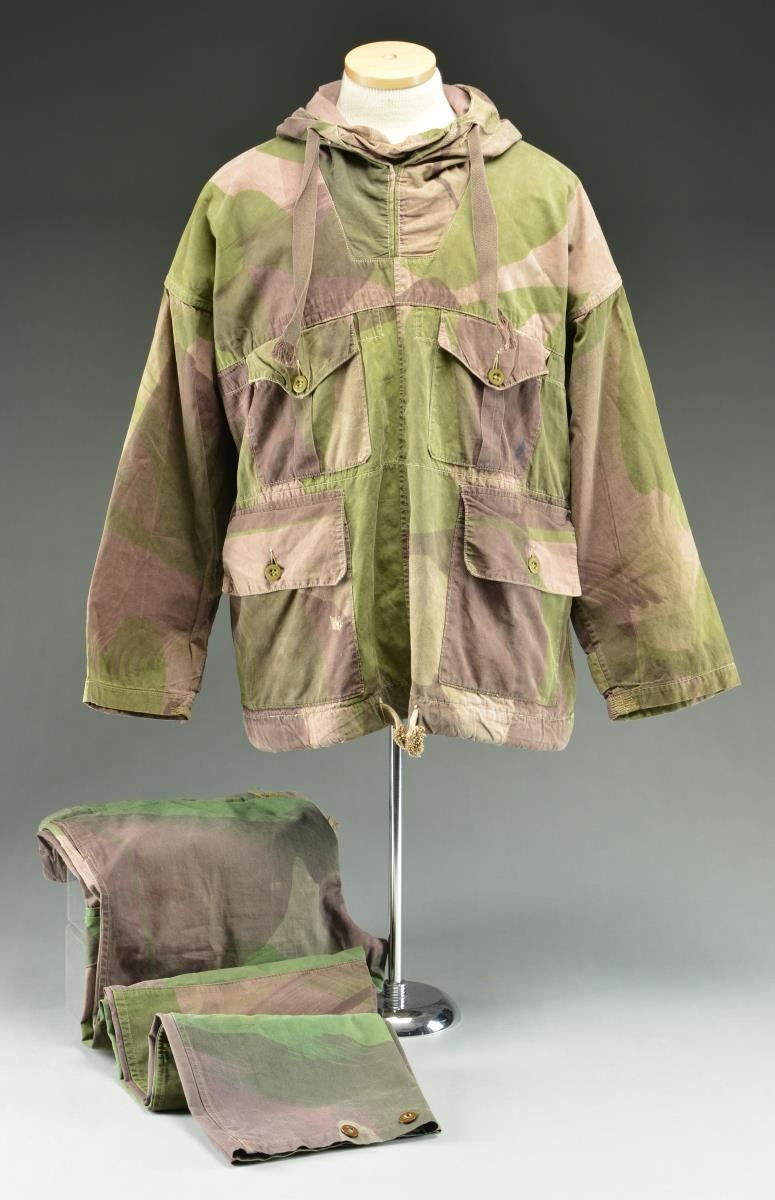 TROUSERS. A rare camouflage uniform believed to have been produced for British Special Forces during WWII. Uniforms like this are known to have been utilized by the Special Air Service as well as the Special Boat Service. The hooded smock has a faded tag that reads “SMOCK WINDPROOF Size No 1 Height- 5'3" to 5'5" Breast- 33" to 35" JOHN LEE & CO. Manchester. 1943”. Matching trousers have a tag that reads “TROUSERS WINDPROOF Size No. 2 HEIGHT, 5ft. 3in. to 5ft. 5in. WAIST, 31in. to 33in. C.W.S. Ltd. (broad arrow) Date______”. CONDITION: smock shows minor fading and some stitched reinforcement at the cuff. Pants show light overall wear. (02-18110-2/BF). $1,500-2,000.