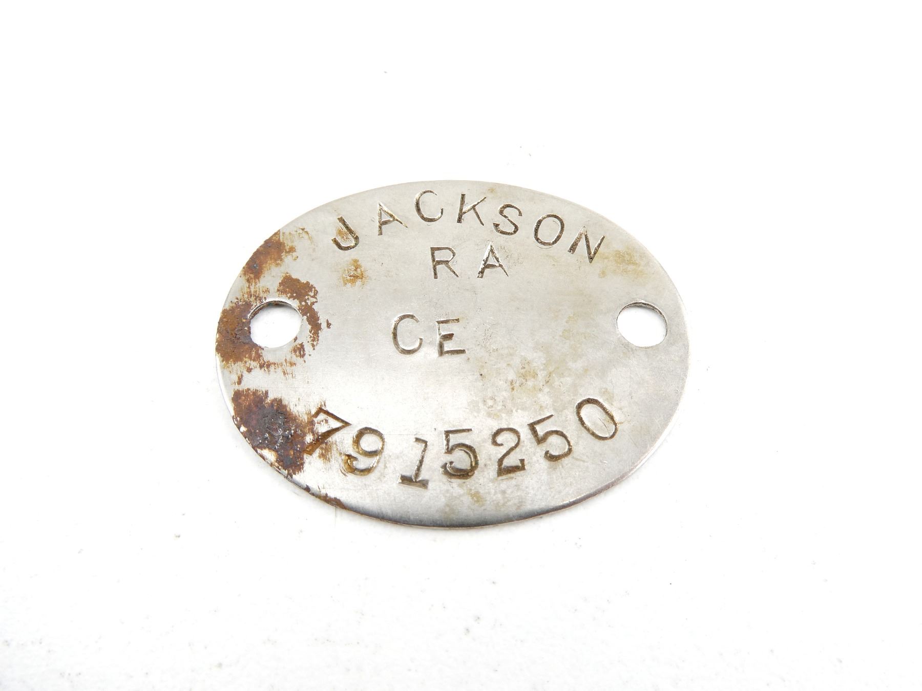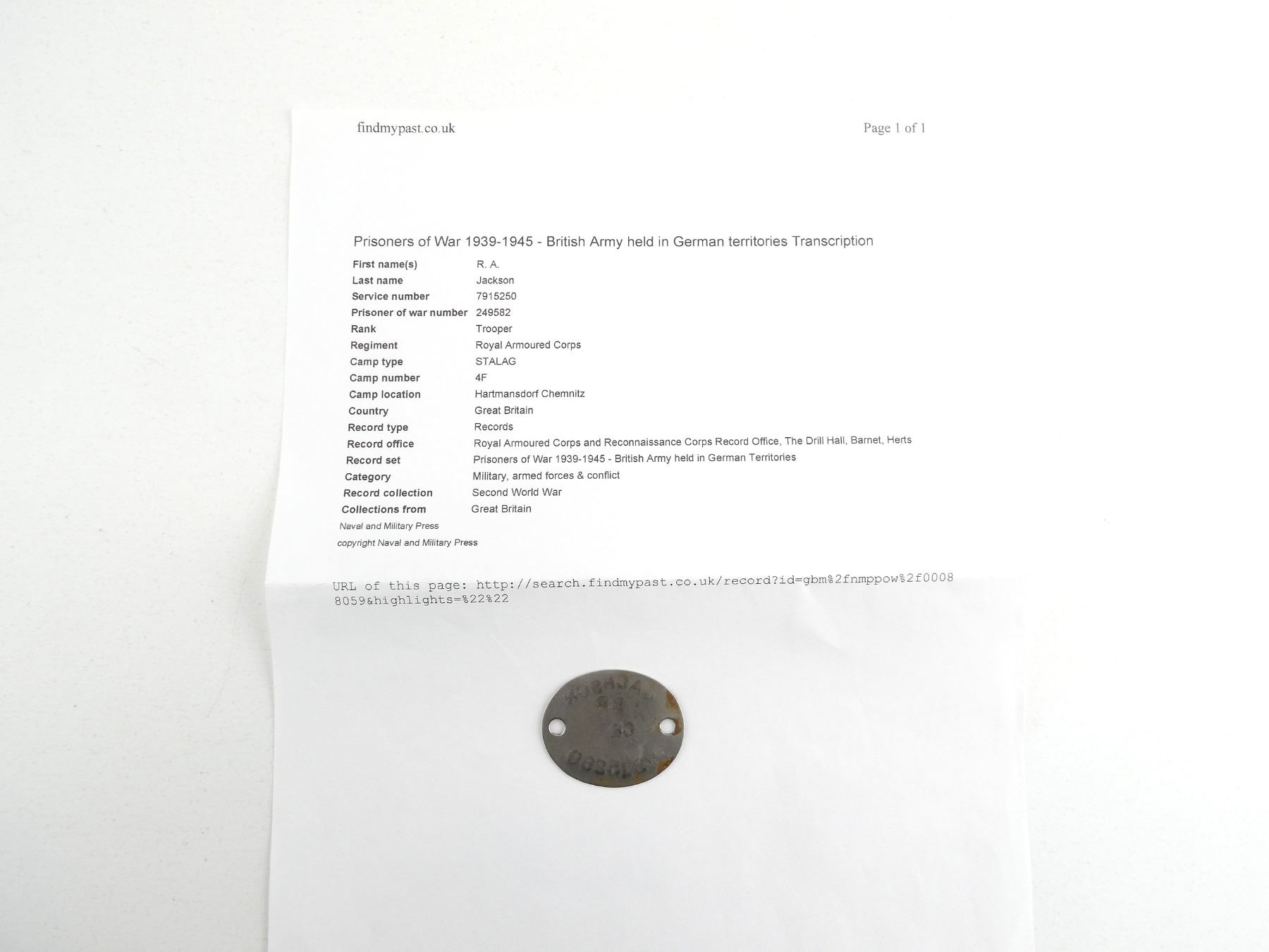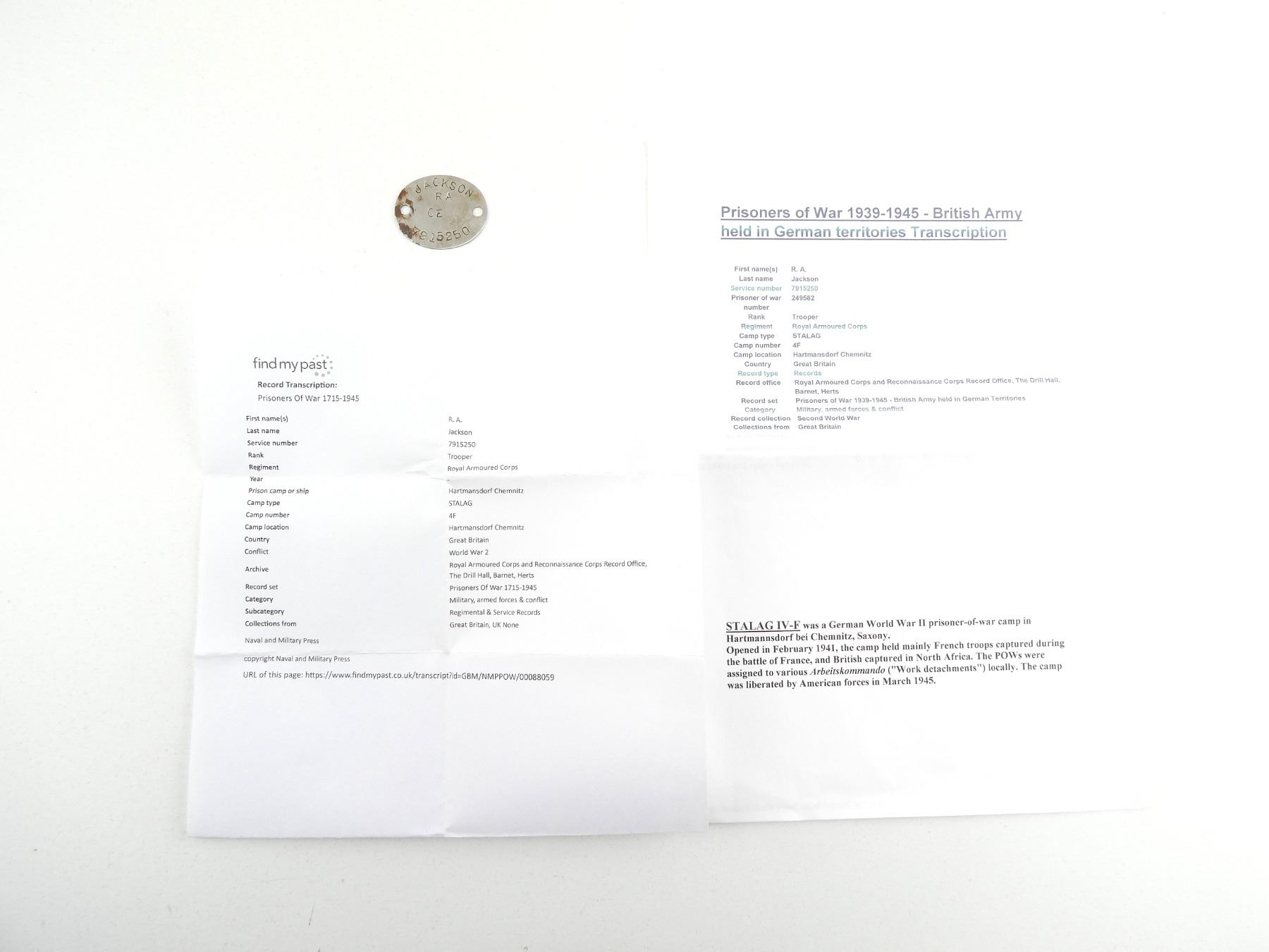 (1) METAL DOG TAG MARKED: "JACKSON, RA, CE, 7915250", WITH PRISONER OF WAR PRINTED RECORDS, POW #: 249582, HE WAS HELD IN STALAG IV-F POW CAMP LOCATED IN HARTMANNSDORF BEI CHEMNITZ, SAXONY. SEE PHOTOS.