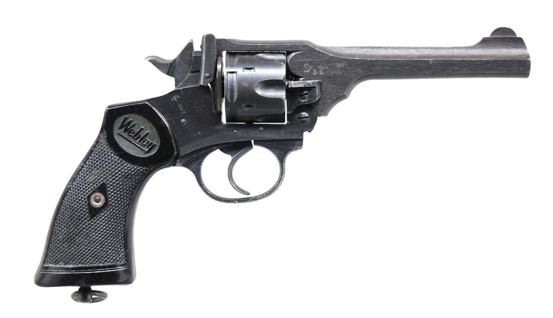 Cal. 38/200. S# 88208. Bbl. 5". Round blade front sight. Square notch rear sight. Matching numbers on the frame, bbl., and cyl. WWII 'war finish' British Webley revolver. Right side of the bbl. has British sale proofs; other parts have various British inspection stamps. A couple of small parts have a Suncorite finish, but the balance of the metal has a wartime blue finish. Checkered black Webley grips. Lanyard ring present on bottom of grip frame. UNATTACHED ACCESSORIES: aftermarket black hard case. CONDITION: grips show some heavy checkering wear, a couple of chips, scattered dings, and handling marks. Metal retains 70% of its 'war finish,' and Suncorite, with a factory flaw ding on the front of the bbl., fading to gray on the grip straps, scattered edge wear, light oxidation, edge wear, and some dings. Action functions properly when hand-cycled. Bright, near-excellent bore. (24-6820/MJC). CURIO. $300-400.