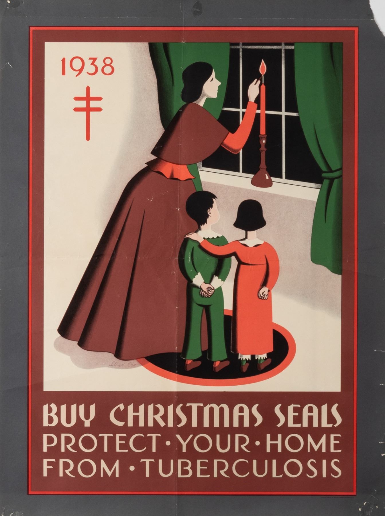 'Buy Christmas Seals - Protect Your Home From Tuberculosis', artwork by Lloyd Coe, (1899-1977), 1938, 26 x 19 inches. Mailing folds, slight scuffing, minor tears on right edge, 1-inch tear on left edge, loss of top right corner, and minor pinhole marks.