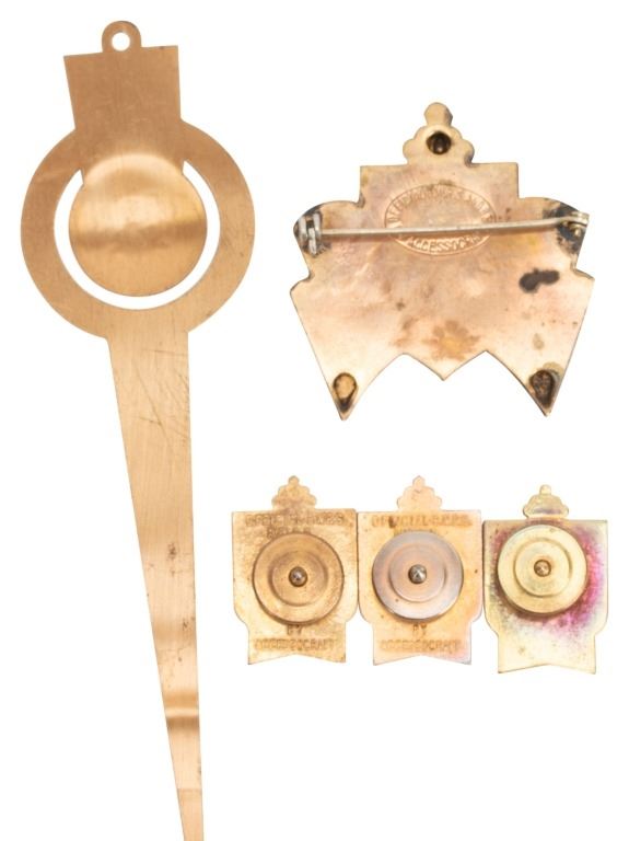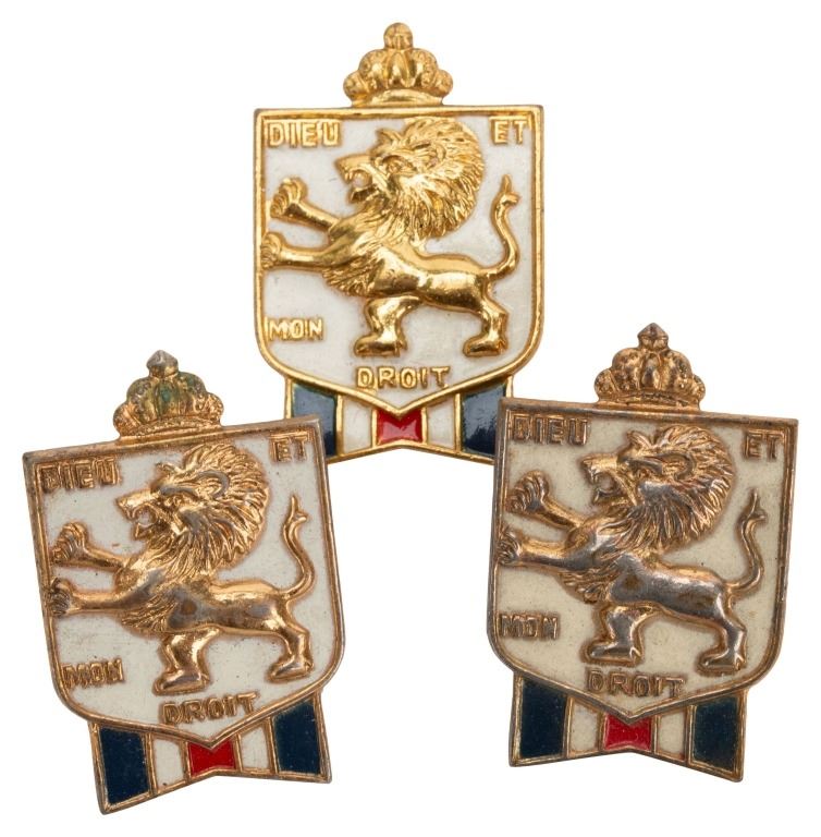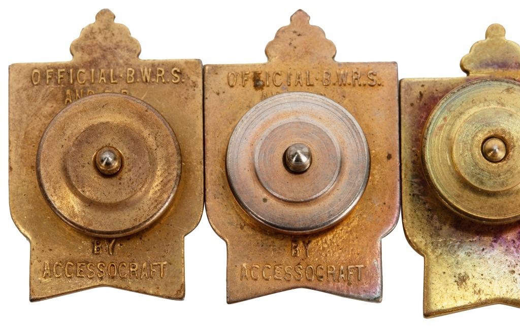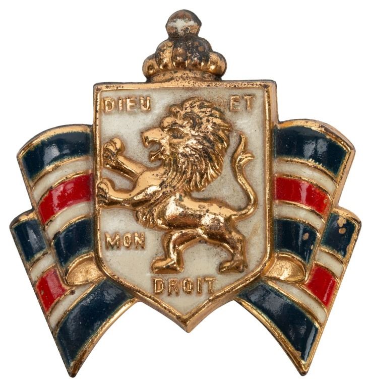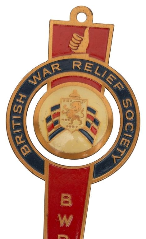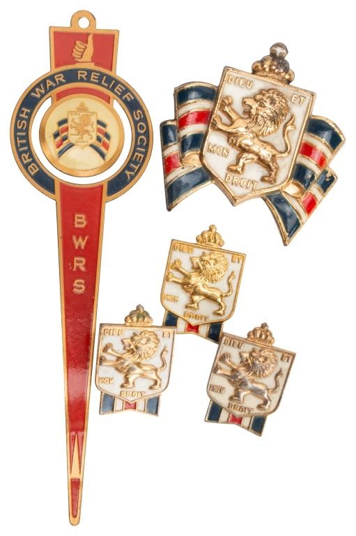 Item/Description: Collection of four WWII BWRS British War Relief Society and Bundles for Britain pins and one bookmark. Great Britain Bundles For Britain badges with gilt shield bearing British lion and Latin motto 'Dieu et mon droit' (God and my right) over red, white and blue hand painted enamel. Larger pin and two smaller pins marked to back: Official B.W.R.S and B. B. / By Accessocraft.